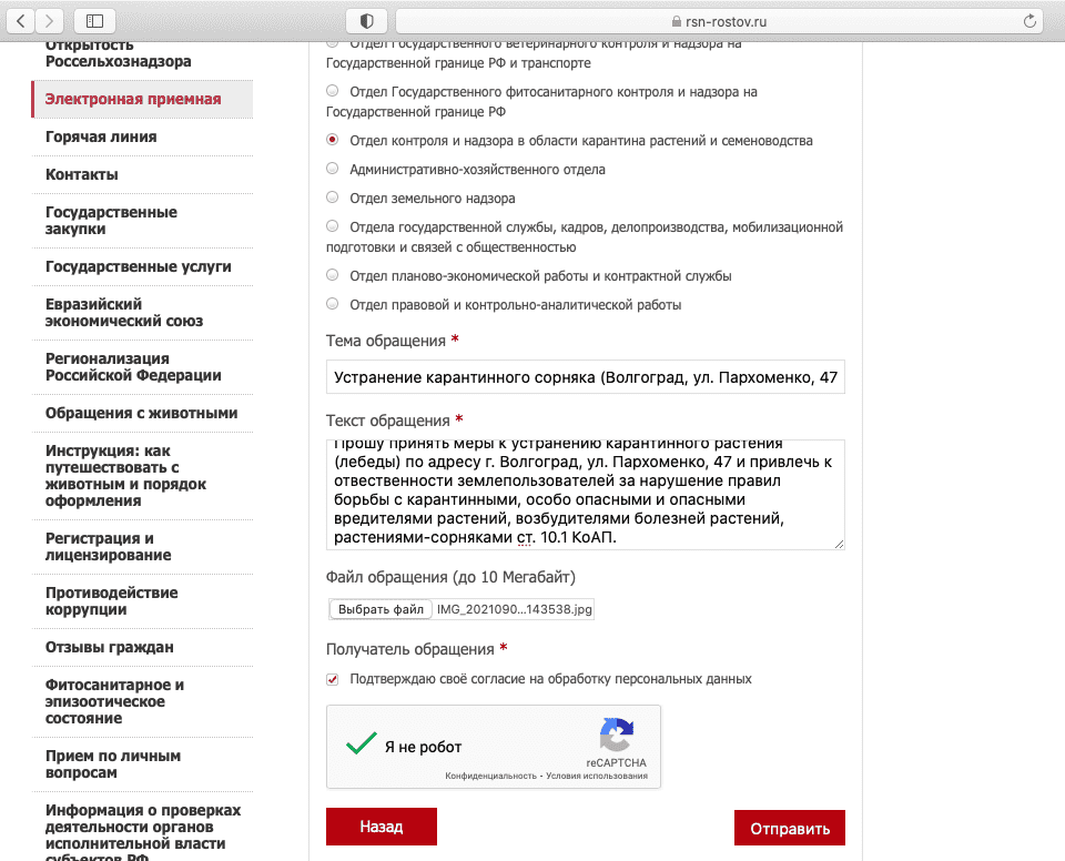 а что вы ждете? С решение к приставам, пусть исполпроизводство открывают и занимаются принуждением к выполнению. Короче, нам все таки писать по этой ссылке, в своих обращениях граждане могут требовать: убрать карантинный сорняк и/или привлечениям к отвественности, ответить по существу (о том что убрали и/или привлекли) нам должны в течение месяца. Я считаю что продуктивнее прикладывать к своей жалобе фото, позволяющее увидеть адрес расположения зарослей лебеды и/или амброзии. Так же я за то, чтобы просить привлекать к ответственности, чтобы на следующий год формировалось правильное отношение к уборке территорий. Если вы не знаете чья это земля, это не ваши проблемы - адрес дали, пусть Россельхознадзор по существу в течение месяца разбирается. Если это территория "ничья" то за нее отвечает город (и он же должен устранять). В Краснодаре 148 человек привлекли к ответственности из-за нескошенной амброзии ну что жалобщики и лишенцы? Я вот мимо проходила и 5 минут потратила, а если каждый?