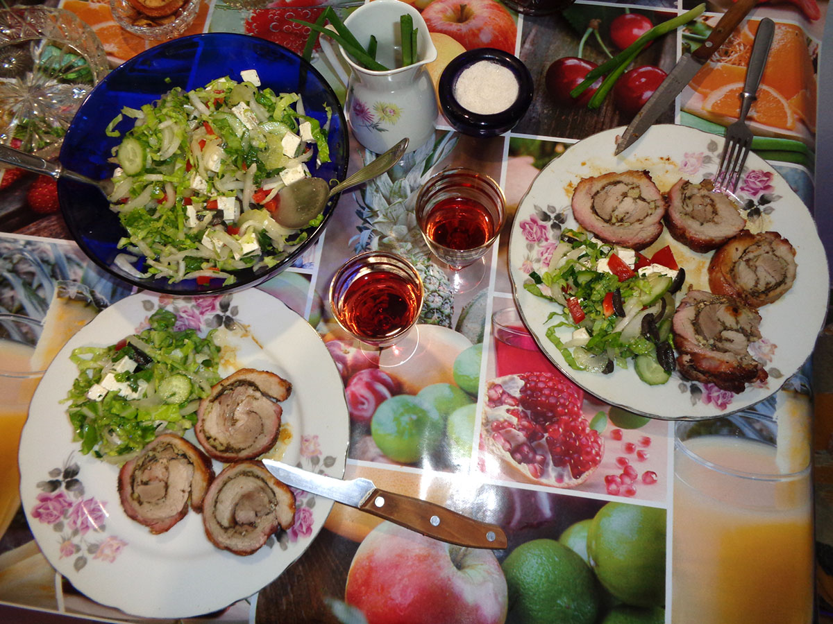 Поркетта (это свиной рулет с большим количеством разных специй), красное вино. Греческий салат еще. День кота все-таки.