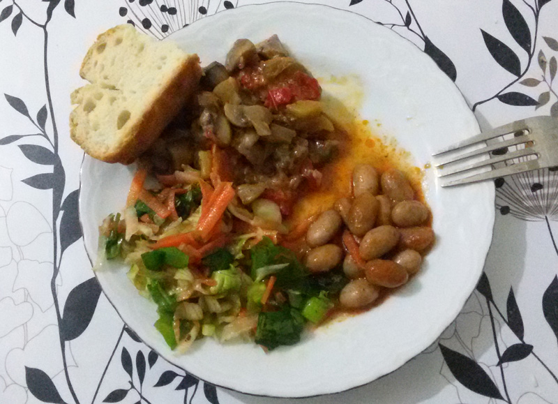 Шампиньоны жареные с кабачками, тушеная фасоль, салат из зелени. Хлеб домашний. На десерт - натуральный йогурт с апельсиновым вареньем.