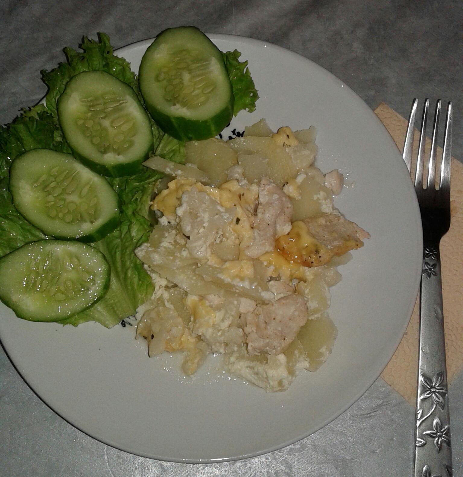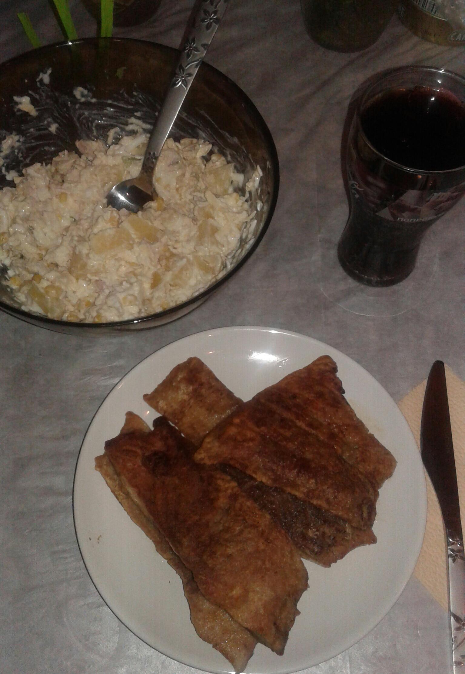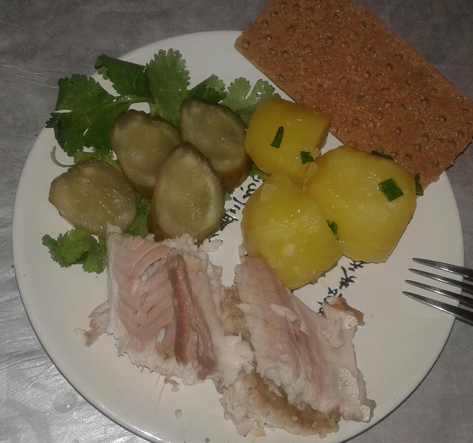 Огромная картоха-разваруха с нерафинированым подсолнечным маслом и олюторская селедка под сладким луком. Рюмка замороженой.