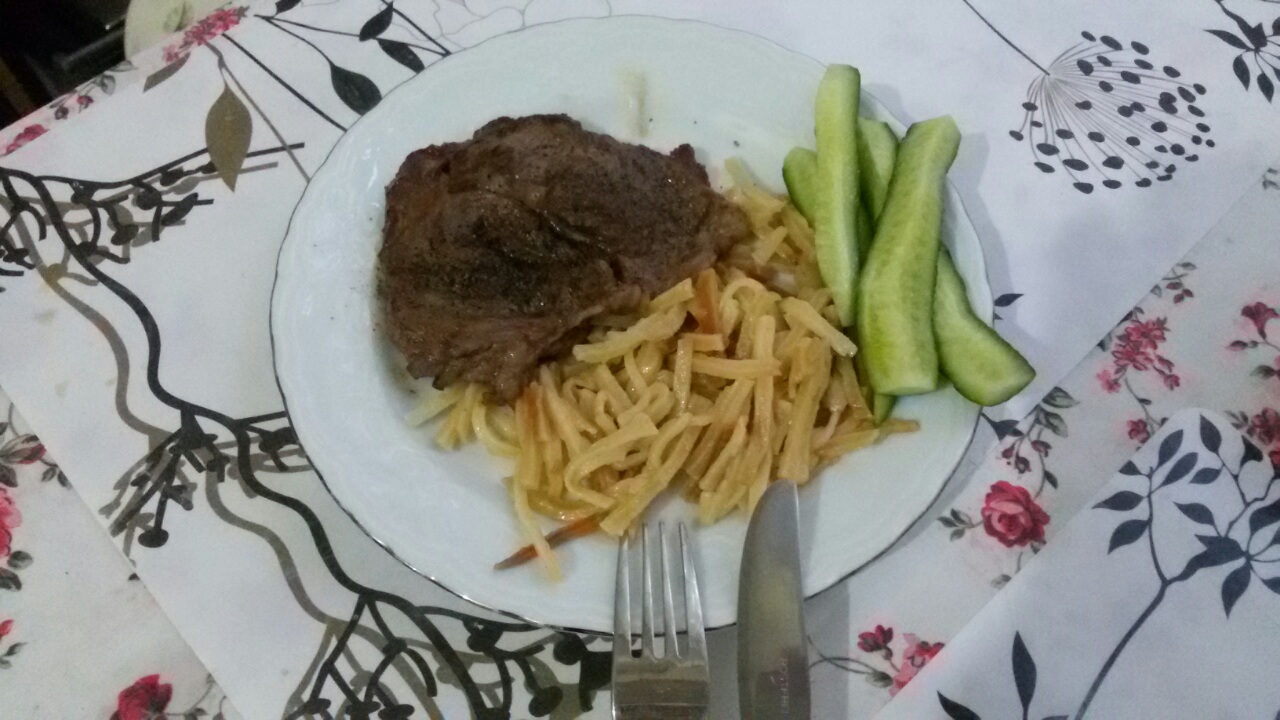 Свежая порция говяжьего антрекота, домашняя вермишель и свежий огурчик. Объелась прям, на десерт меня сразу не хватило, догоняюсь сейчас, фруктами