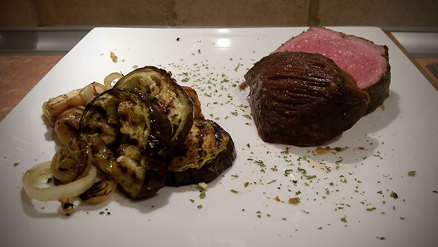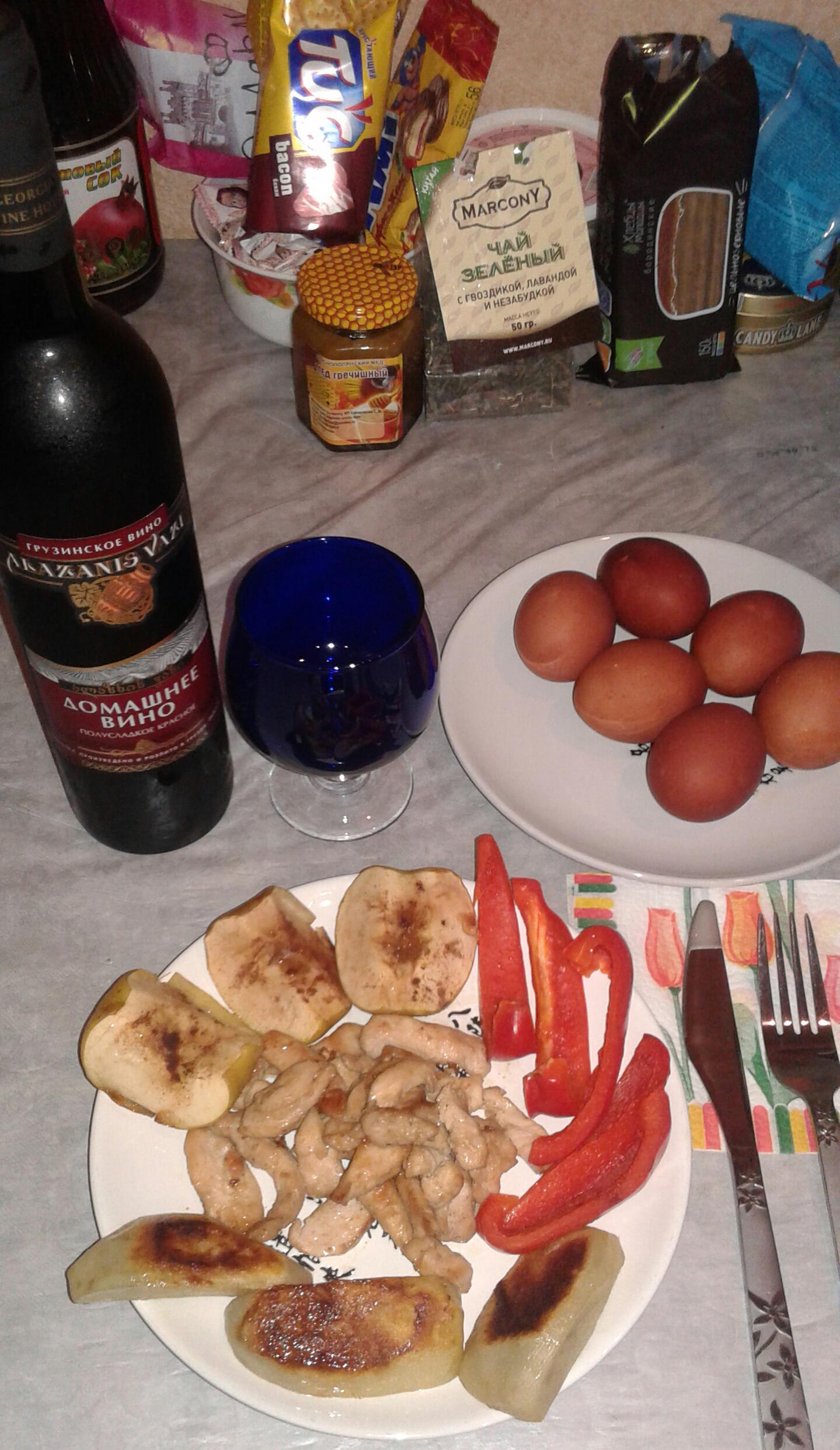 Отпуск закончился и я снова у плиты куриное филе, обжаренное в слив.масле с чесночком с добавлением соевого соуса. Картофель, болгарский перец, зеленое яблоко, запеченные в духовке.