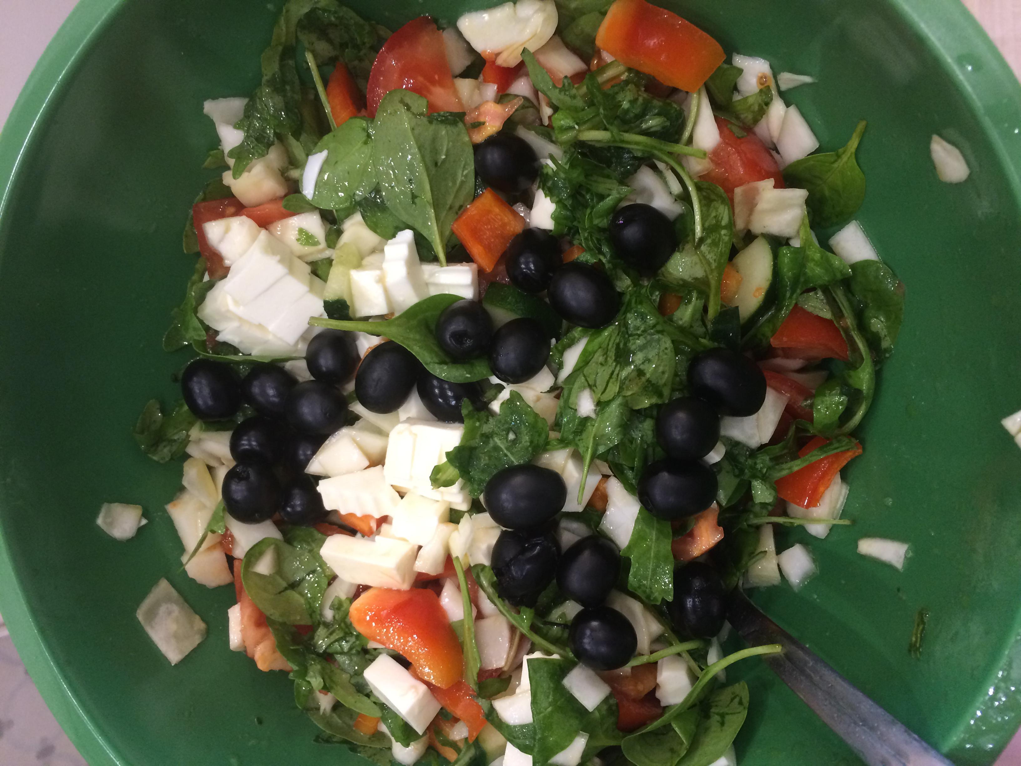Ну молодец же я! Одно не пойму. Нафига я положила маслины с косточкой, еще и перемешала. Чуть зубы не отвалились, пришлось обратно выковыривать