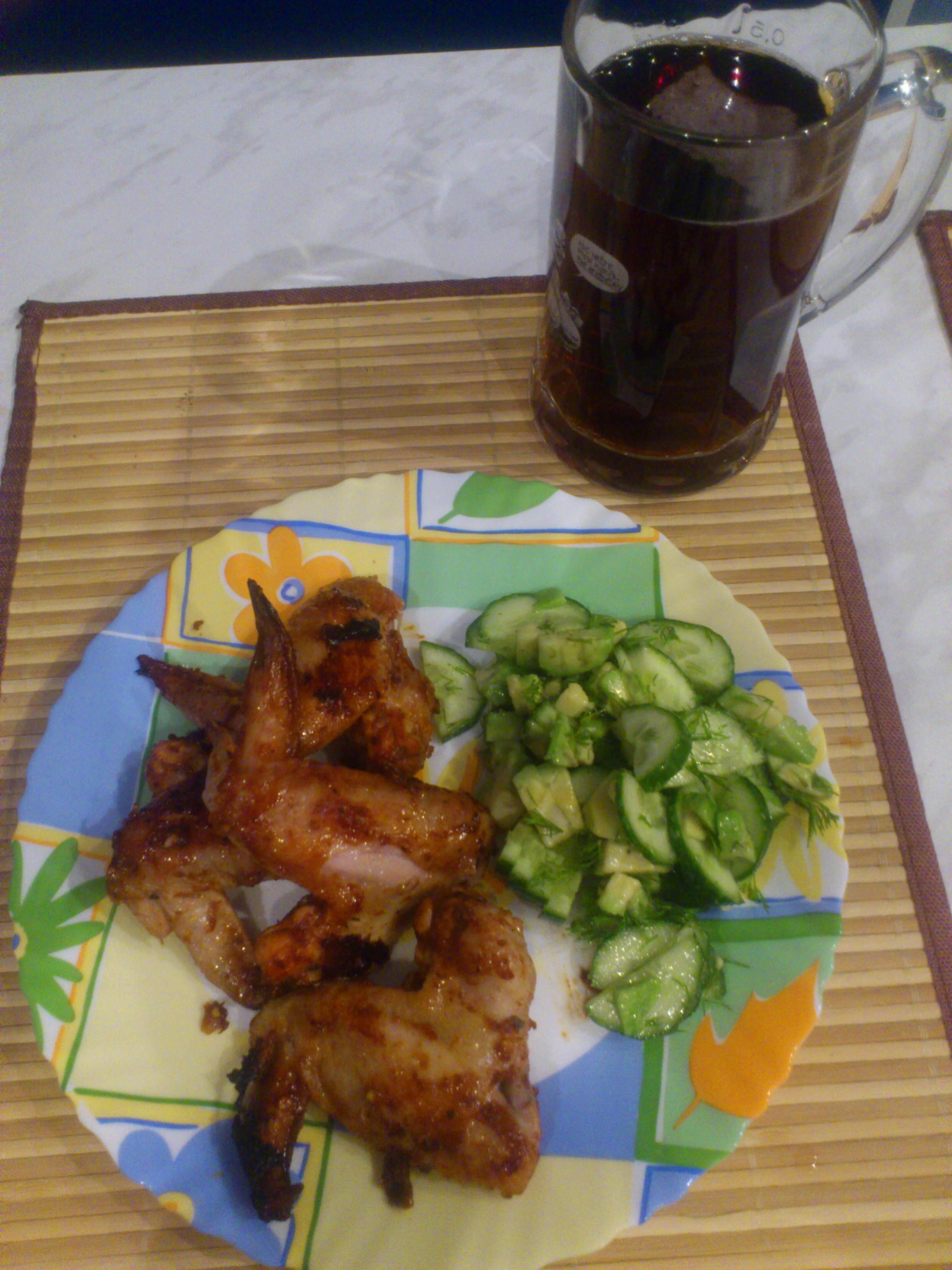 Конец рабочей недели. Можно и расслабиться. Обожаю авокадо, делаю салат из всего зелёного,что есть дома. И острые куриные крылышки. Мням.