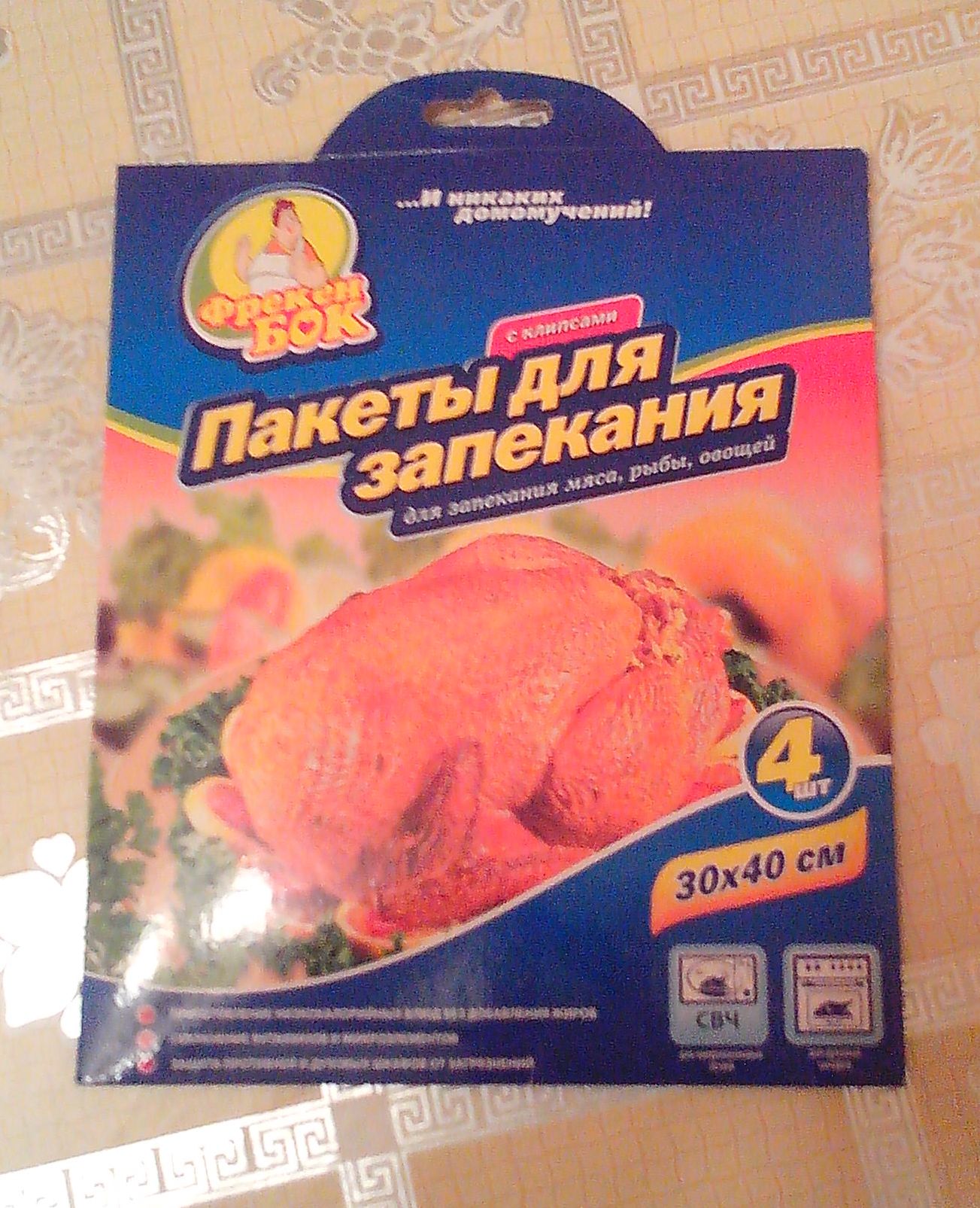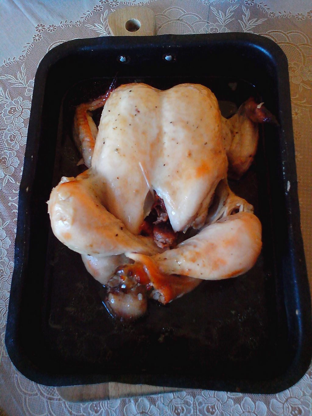 Курочку готовил сегодня. Ингридиенты - птица и обмазка. Варианты обмазки: - мёд+растительное масло+соль+специи по собственному желанию - или как сегодня - майонез, чеснок, перец, соль, сок четверти лимона. Курицу обмазать смесью внутри и снаружи, внутрь можно напихать яблоки с черносливом. Ноги завязать либо при помощи шкурки (как на фото), либо ниткой, иначе раскорячится. Положить в термопакет для запекания, выложить на невысокий противень и оставить мариноваться часа на два-три. Затем поставить в духовку при температуре 200 градусов, предварительно проколов термопакет в нескольких местах, чтобы не рвануло. Запекать примерно час, в зависимости от размера птицы. За пятнадцать минут до готовности термопакет разрезать сверху и раздвинуть в стороны для подрумянивания корочки. Перед подачей на стол остатки термопакета аккуратно удалить. Таким же образом можно готовить утку. Кстати, это в планах.
