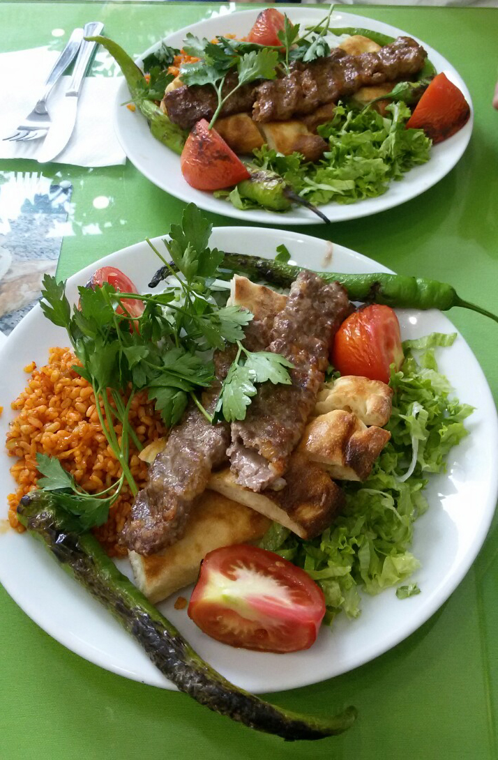 Ужин в кафе: адана-кебаб в дровяной печи, с булгуром, овощами гриль, на домашнем хлебе ) Хлеб не осилила, реально порции гигантские