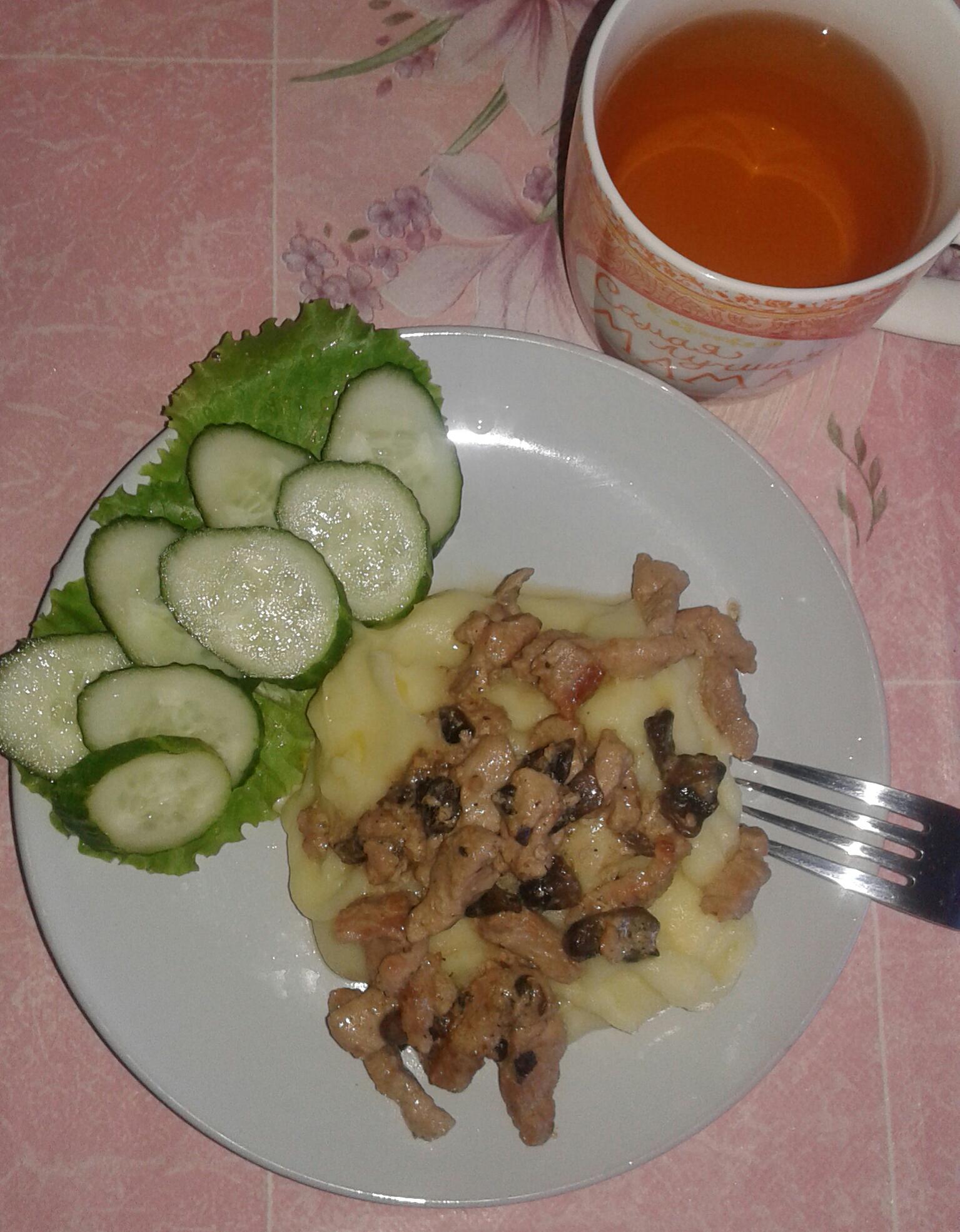 Пюре картофельное + жареная грудка куриная, с грибным соусом. На десерт - мороженое фисташково-шоколадно-ванильное. Стрескали с удовольствием, себя ругать не собираемся, и круги с утра наматывать не побежим )