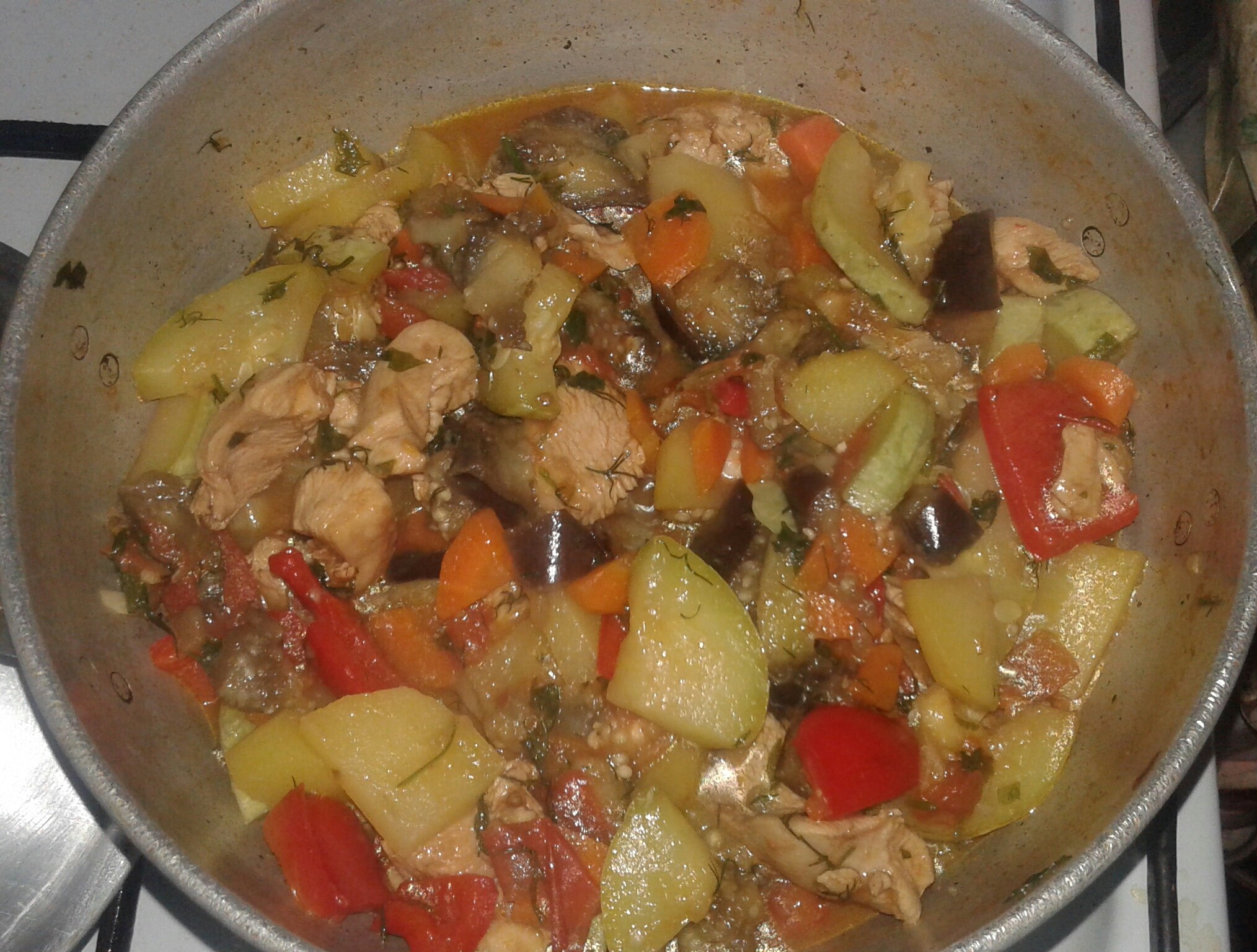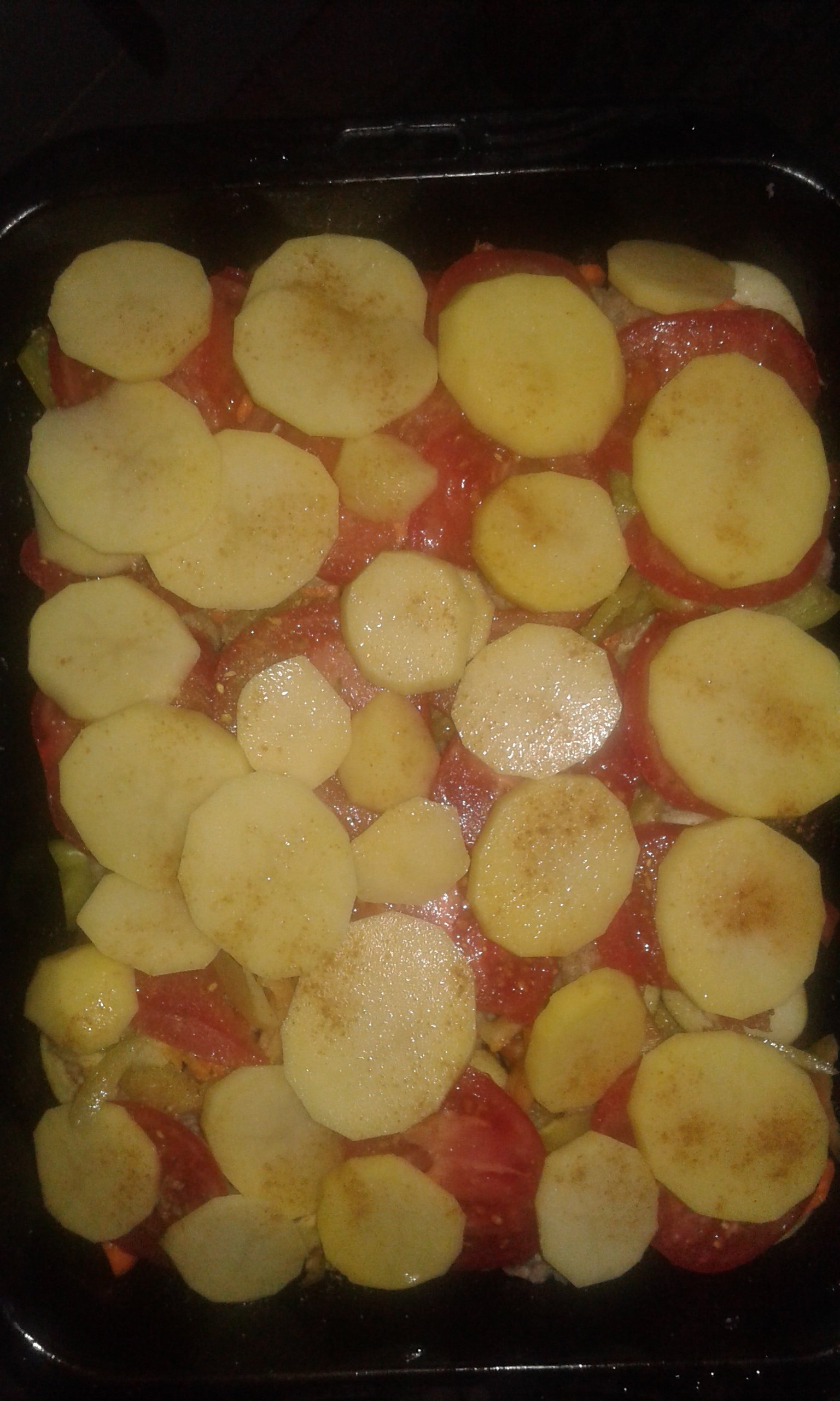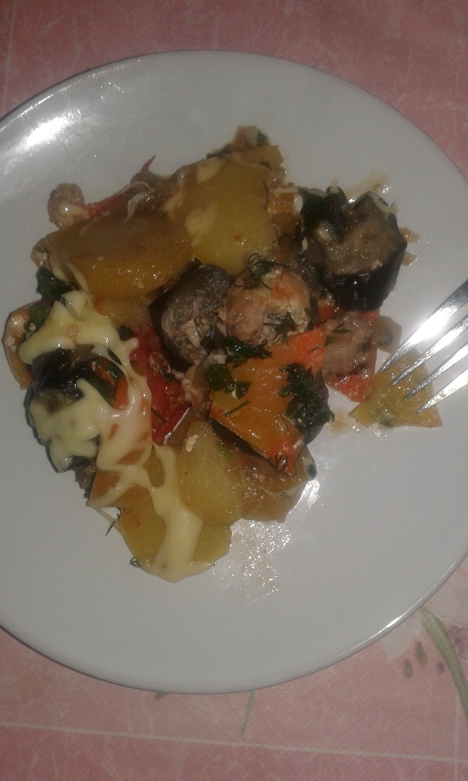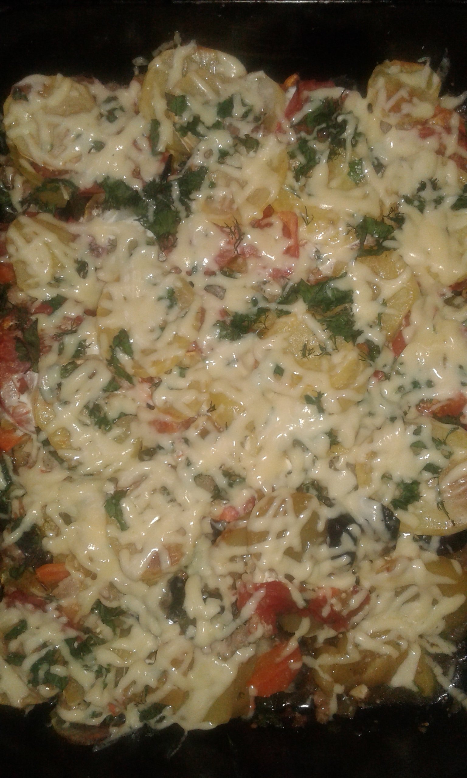 Овощная лихорадка продолжается) Слоями: картофель, баклажаны, чеснок порезаный, болгарский перец, фарш из свинины, морковь, помидоры, зелень, еще раз картофель, сверху чуть сыра.