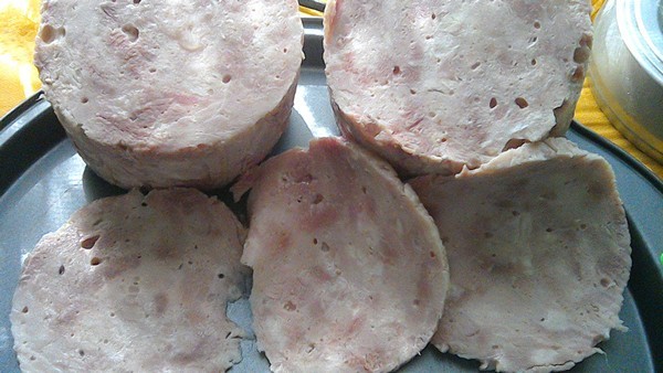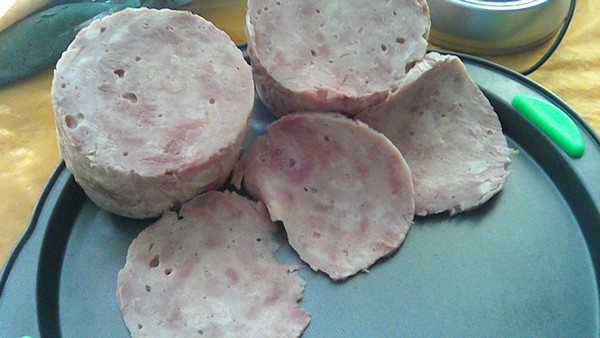 вот какая вареная колбаса по типу ветчинной вчера получилась (ветчиной наверно нельзя назвать, поскольку свиная лопатка пополам с курицей, мне такое сочетание больше нравится, чем одна свинина). ничего лишнего, соль, кориандр и чуть чеснока.