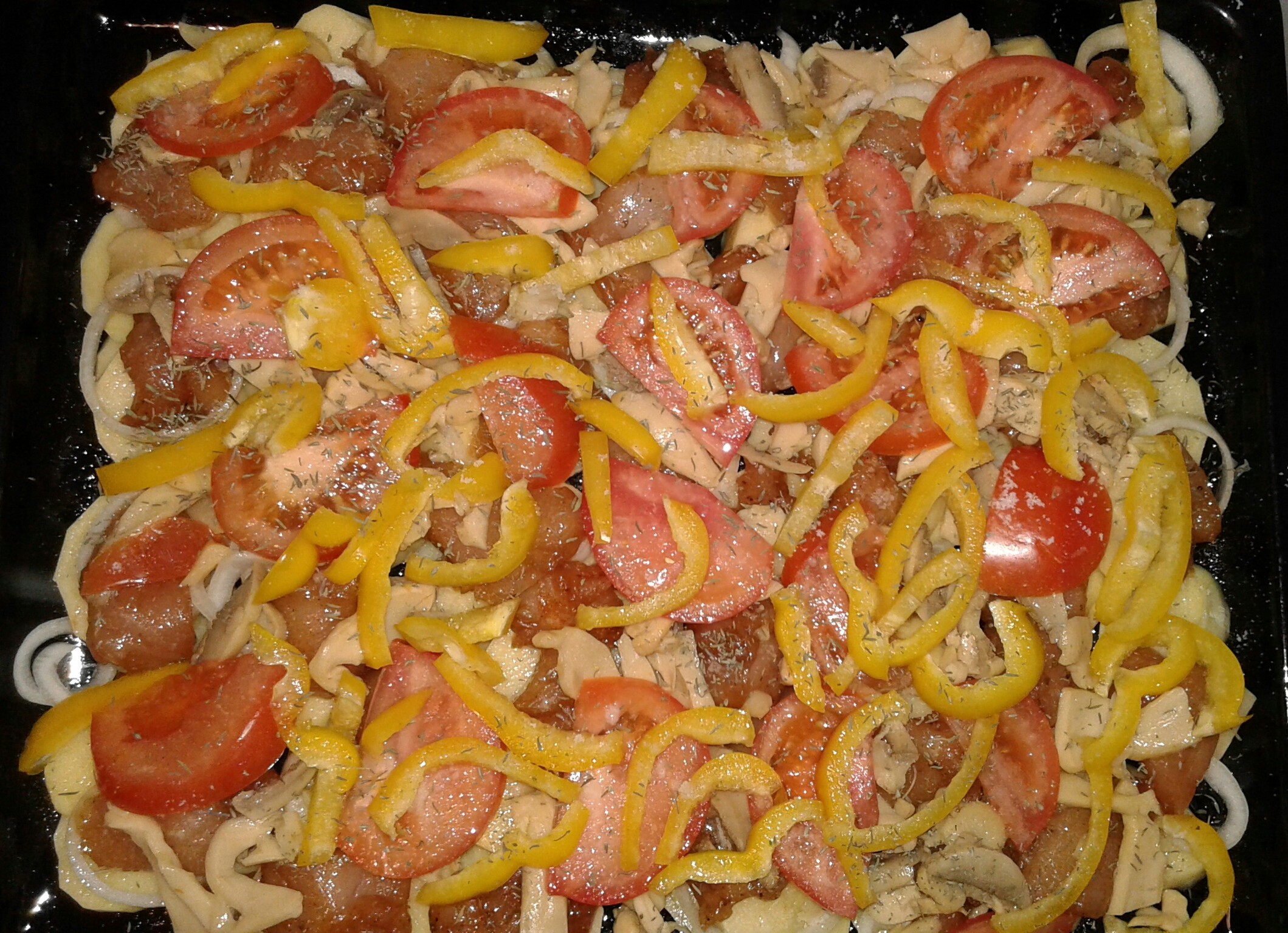 Порезала на куски куриную грудку, замариновала в соевом соусе с приправой доя курицы. Картофель, лук, помидоры, болгарский перец, консервированные резаные шампиньоны. Запечь. Сверху посыпать сыром.