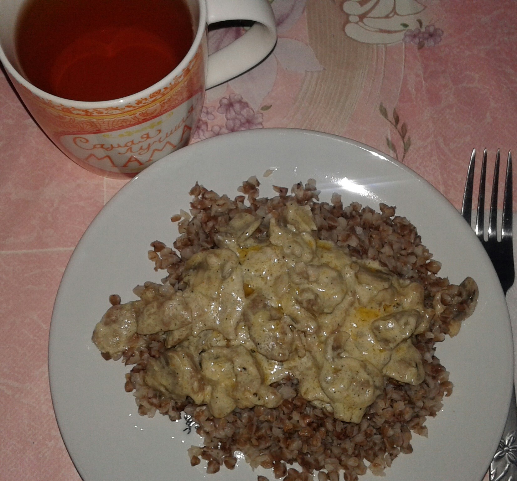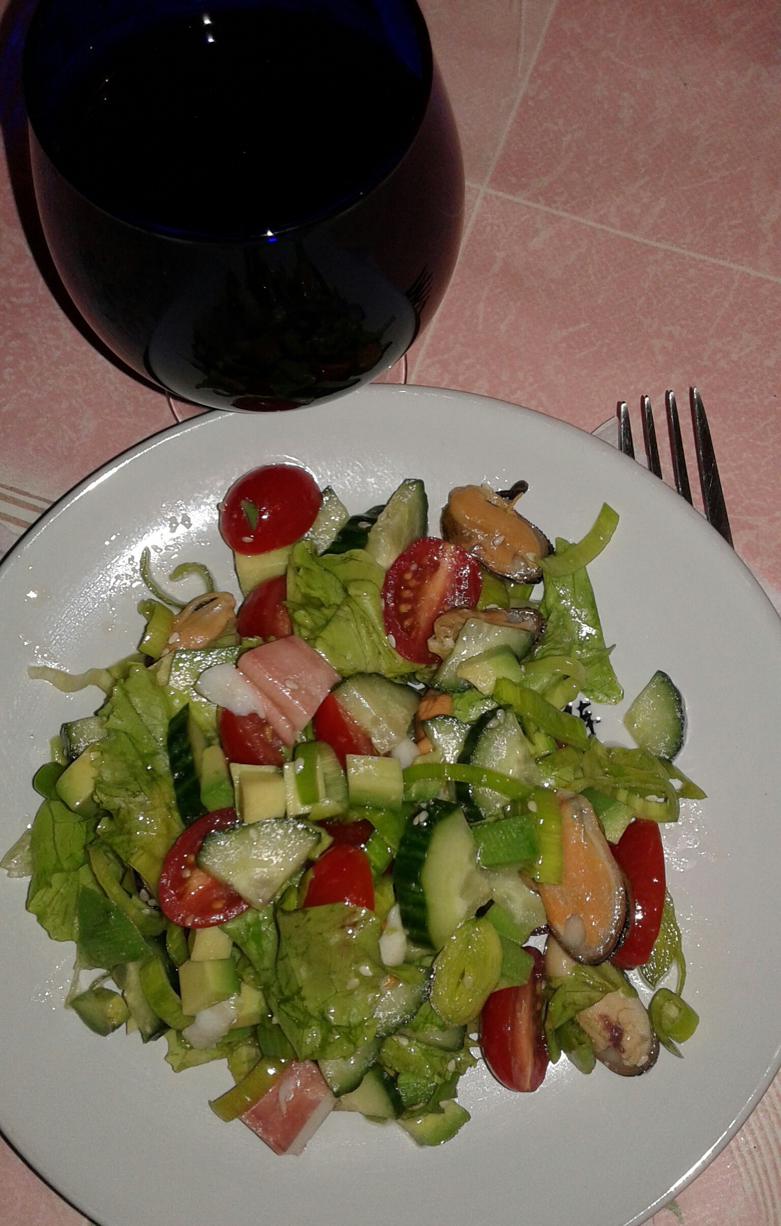 Приятно дома в конце рабочей недели порадовать себя и близких чем-то вкусным. Вкусно-не значит заморочисто, трудно и дорого. Легкий салат с бокалом вина...в состав салата входит: огурцы, помидорки черри, авокадо, лук-порей, морепродукты в масле, листья салата и кунжут. Был бы сыр фета-вообще тема. Радуйте друг друга Сегодня всё просто: просто гречка и просто тушеная в сливках свинина с шампиньонами.