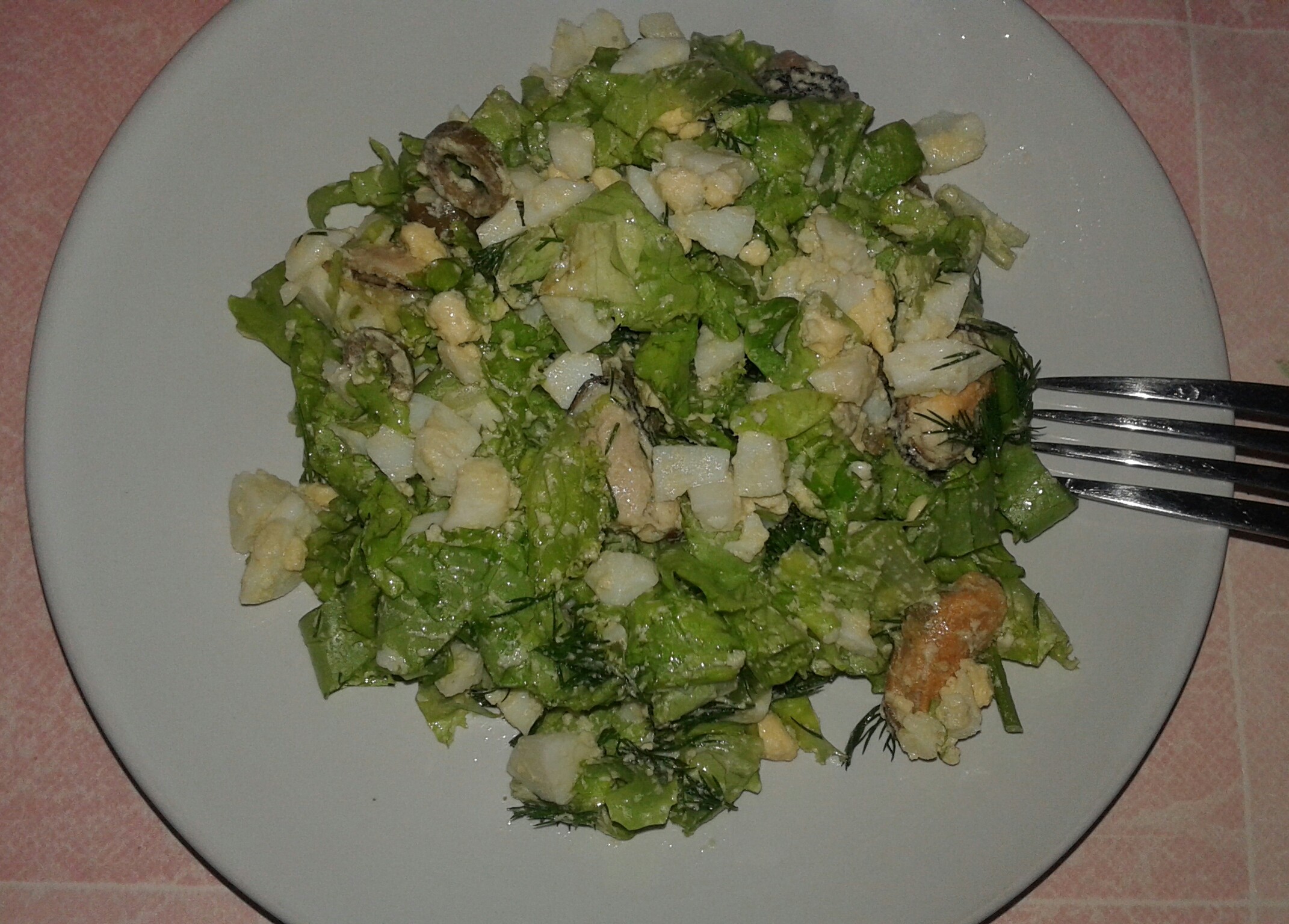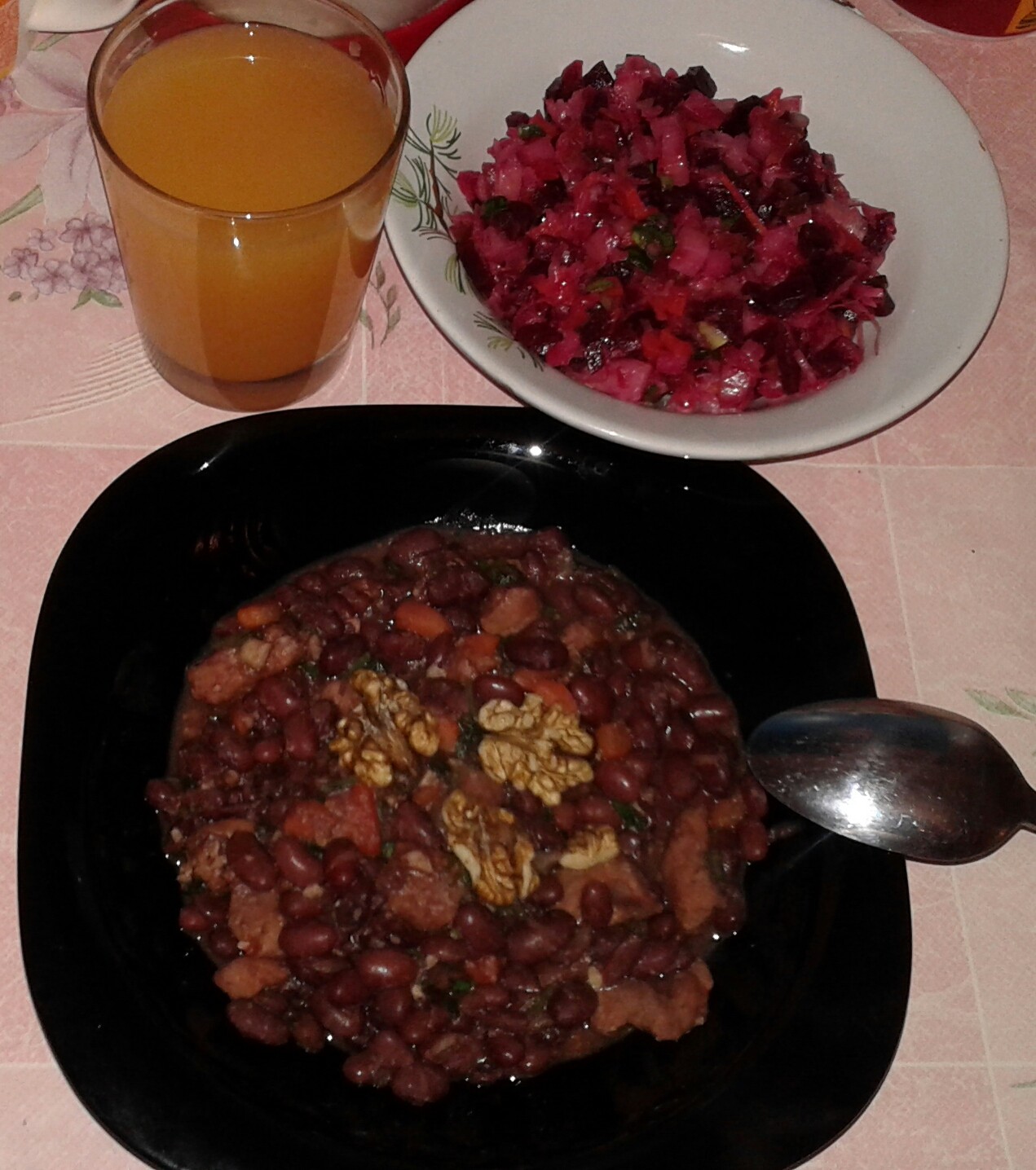 Что-то близкое к лобио. В составе: красная фасоль, лук репчатый, морковь, перец болгарский (красный), свинина, много кинзы и молотый грецкий орех. Это офигенно вкусно. Винегрет готовила мама