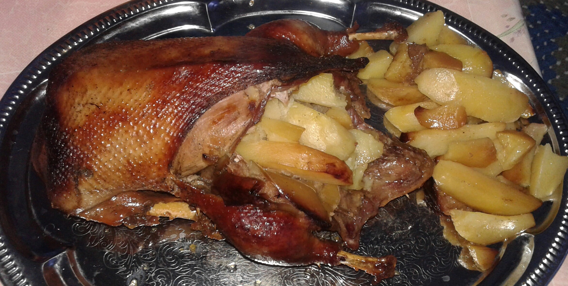 Сегодня у нас утка, фаршированная яблоками, грушами и картофелем. Мариновалась сутки в соевом соусе, специями, мёде. Вкуснотища.