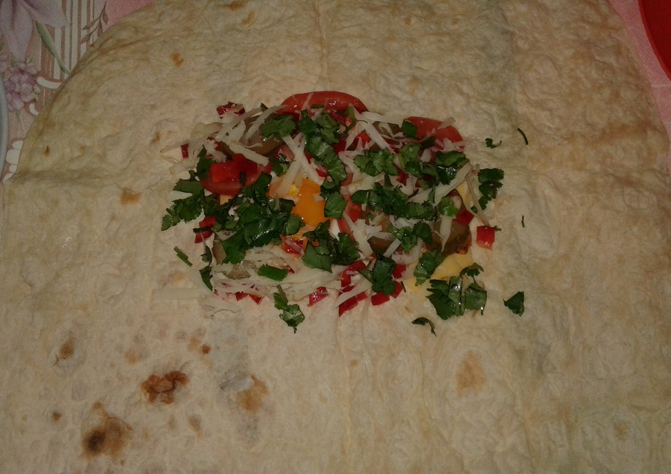 Сегодня подглядела новый рецепт. Абхазская ека. Лаваш разрезала пополам. Развернула лаваш, кисточкой немного смочила лаваш, чтобы не ломался, не крошился. Выложила сыр, потом глазунью, помидор, соленый огурец, мелко порезанный болгарский перец, кинзу и тертый на терке копченый сыр сулугуни. Вкусно! На завтрак вообще отлично