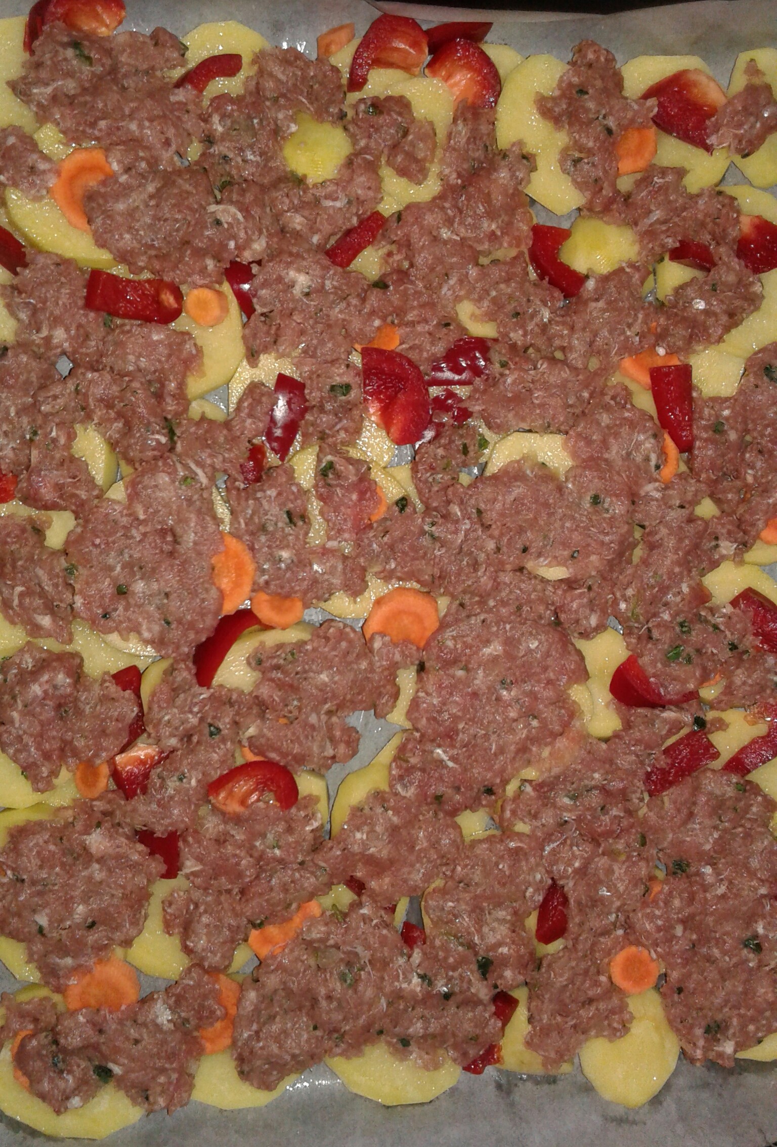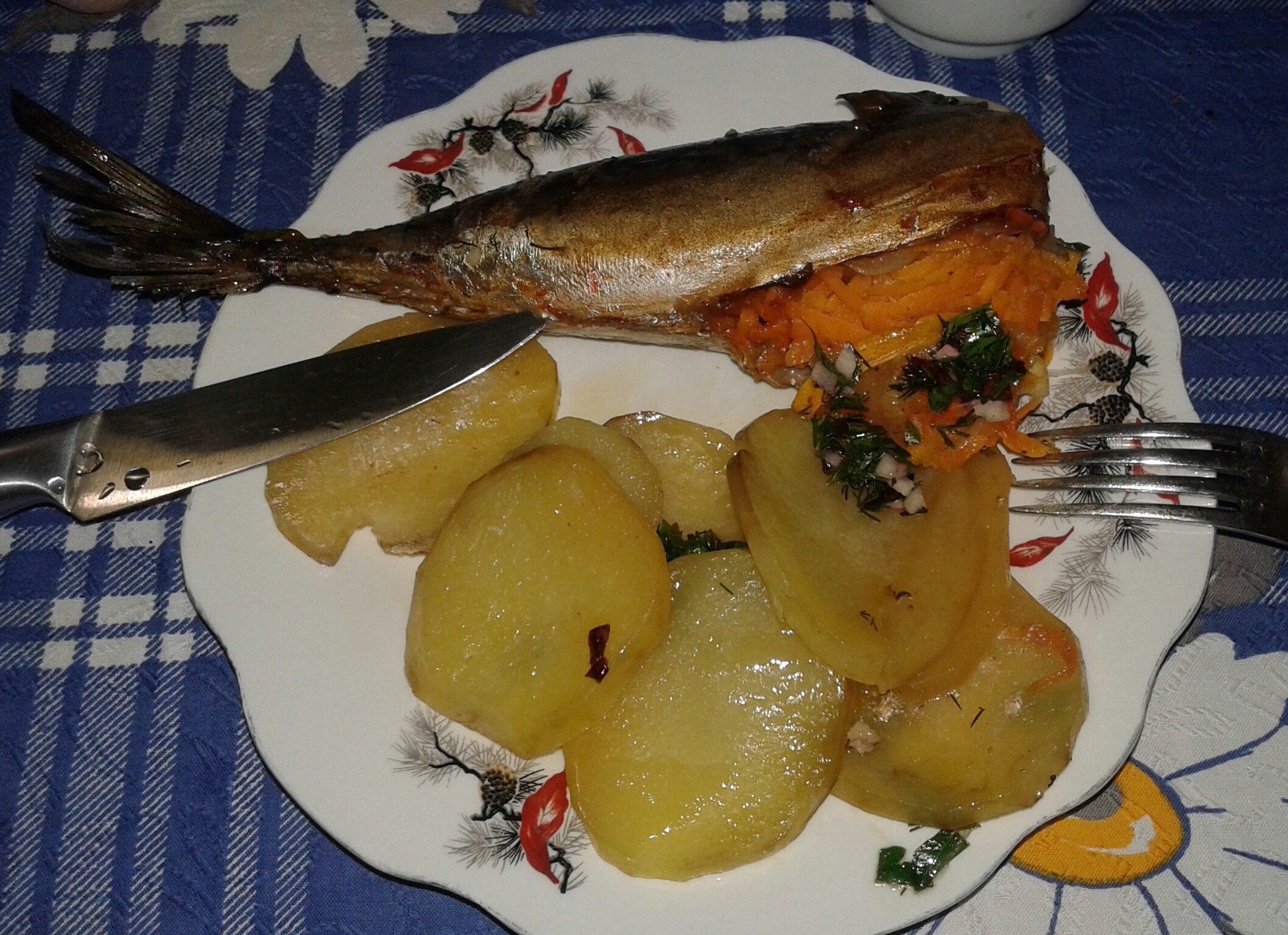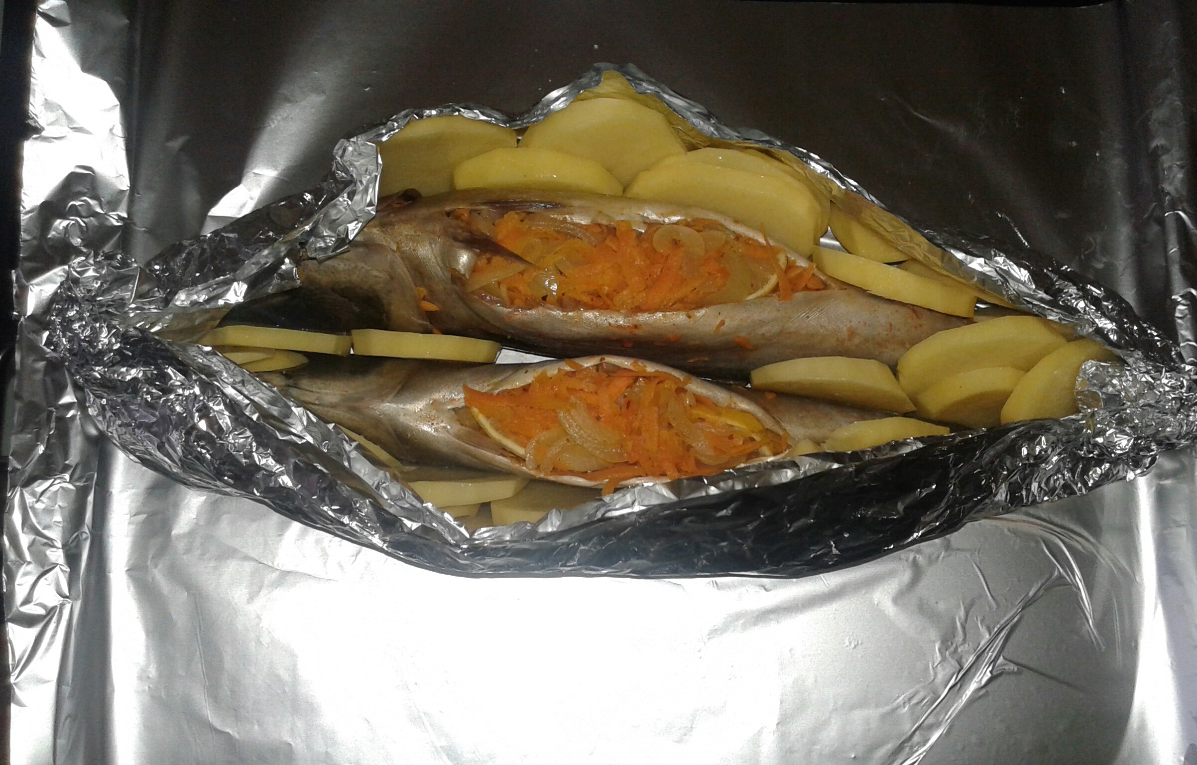 Запеченный карп. Сначала приготовила соус: масло, сок лимона, молотый имбирь, перец сушеный, соль. Выдержала минут 15, чтобы имбирь связался с соком лимона. Затем обмазала им всего карпа и снаружи, и внутри. Начинка: тертая морковь, лук, петрушка+укроп. Отдельно в миску положила 2 ст.ложки сметаны, выдавила туда два зубчика чеснока, посолила. Добавила сметанный соус в начинку. Перемешала. Противень покрыть фольгой, сделала подушку из картофеля и лука. Сверху положила фаршированного карпа. Накрыть карпа фольгой и отправить в духовку примерно на час. Через час можно доставать. Приятного аппетита!