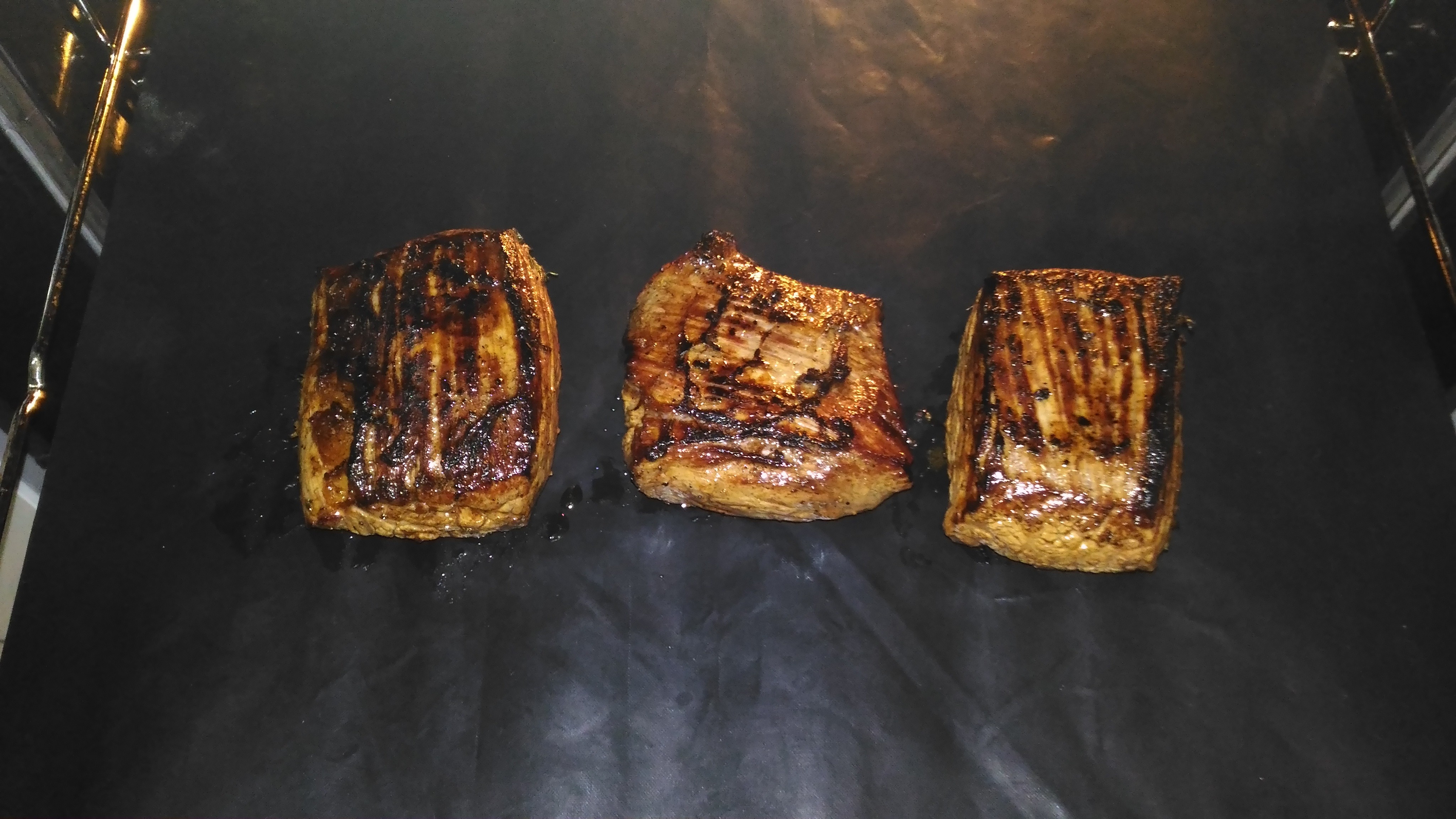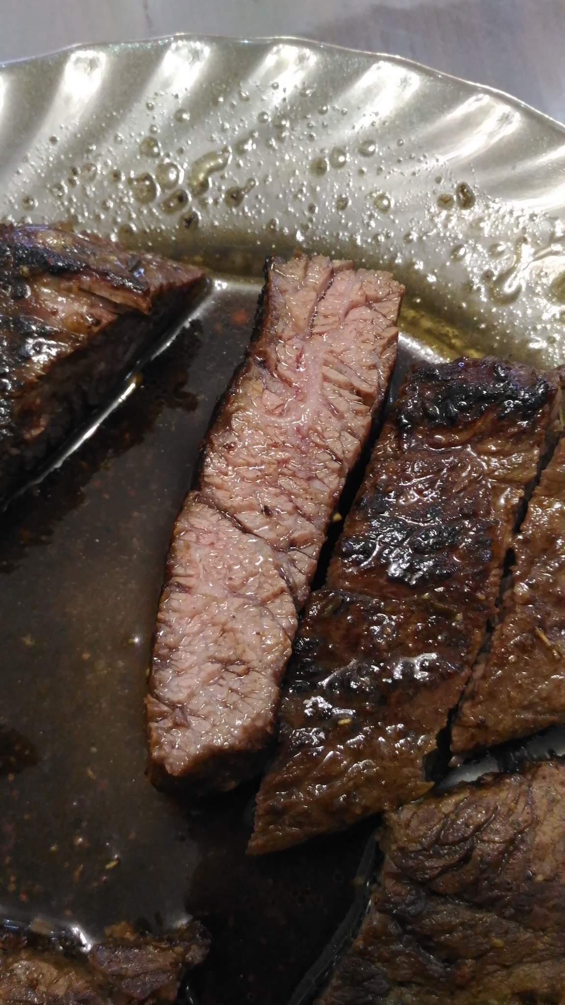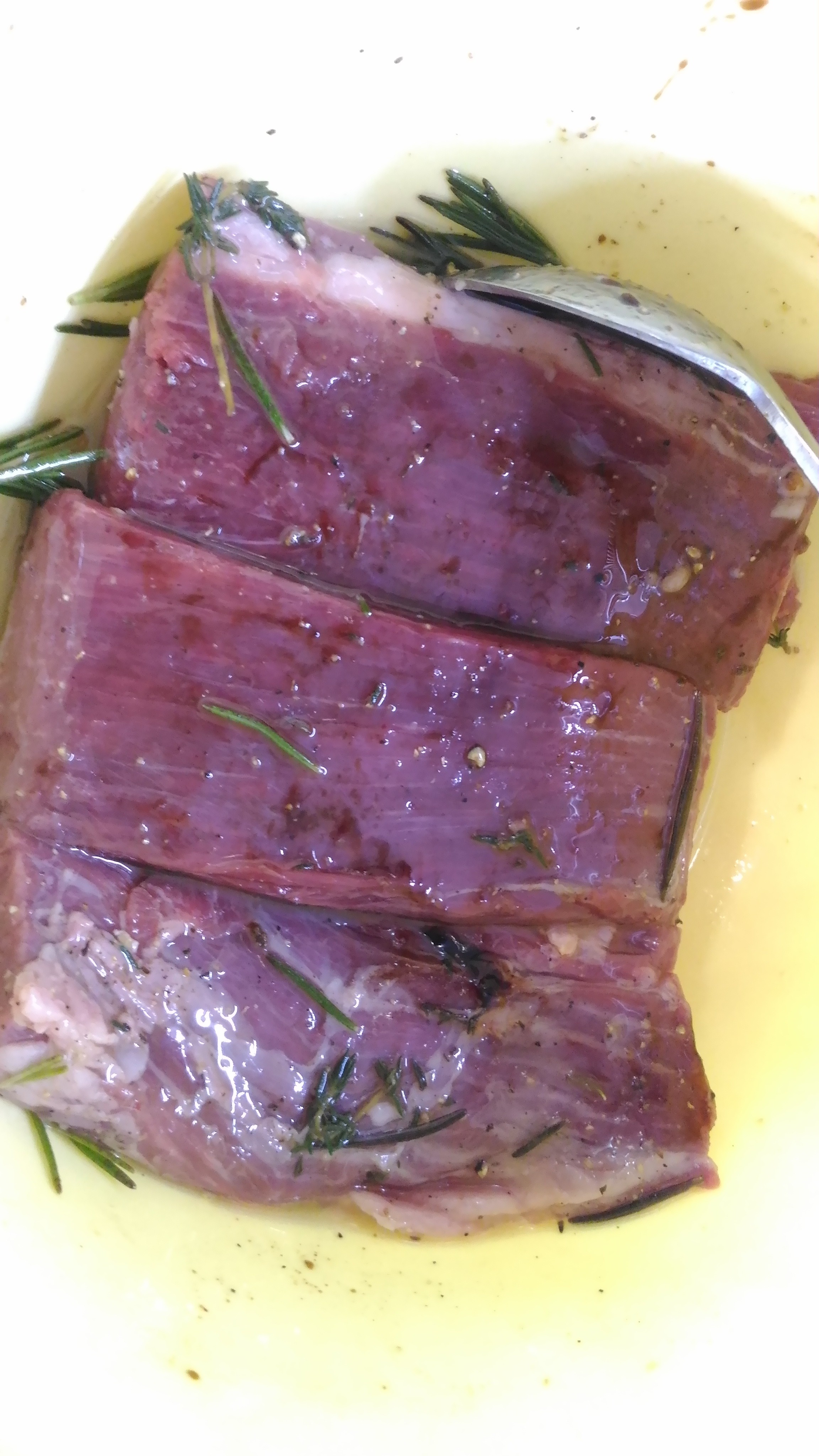 @Маришка, а как этот черный помидор на вкус? Как обычный помидор? Сегодня альтернативный стейк решил по случаю сделать - Фланк стейк от Мираторга. Сразу скажу, на 4 с минусом. Не рекомендую. Маринад тот же - олив ойл, розмарин, тимьян, перец, соль. Обжариваю по 2 минуты каждую сторону на максимуме с добавлением зубчика чеснока, потом по 3 минуты на половине мощности, а потом на тефлоновый лист в духовку на 120 градусов на 10 минут. Подача со свежим салатом и соус из вина красного сухого, сливочного масла и демиглясса.