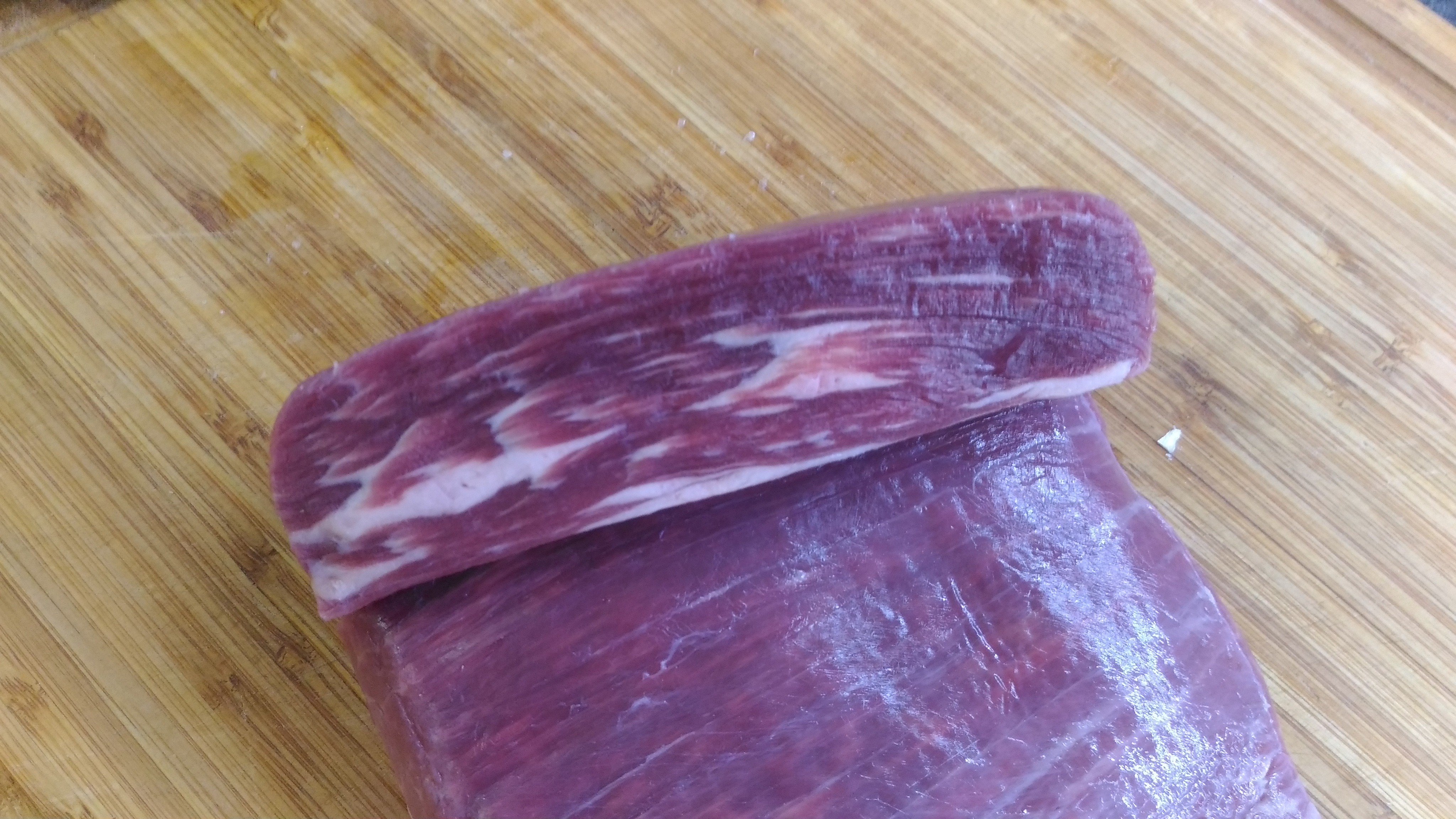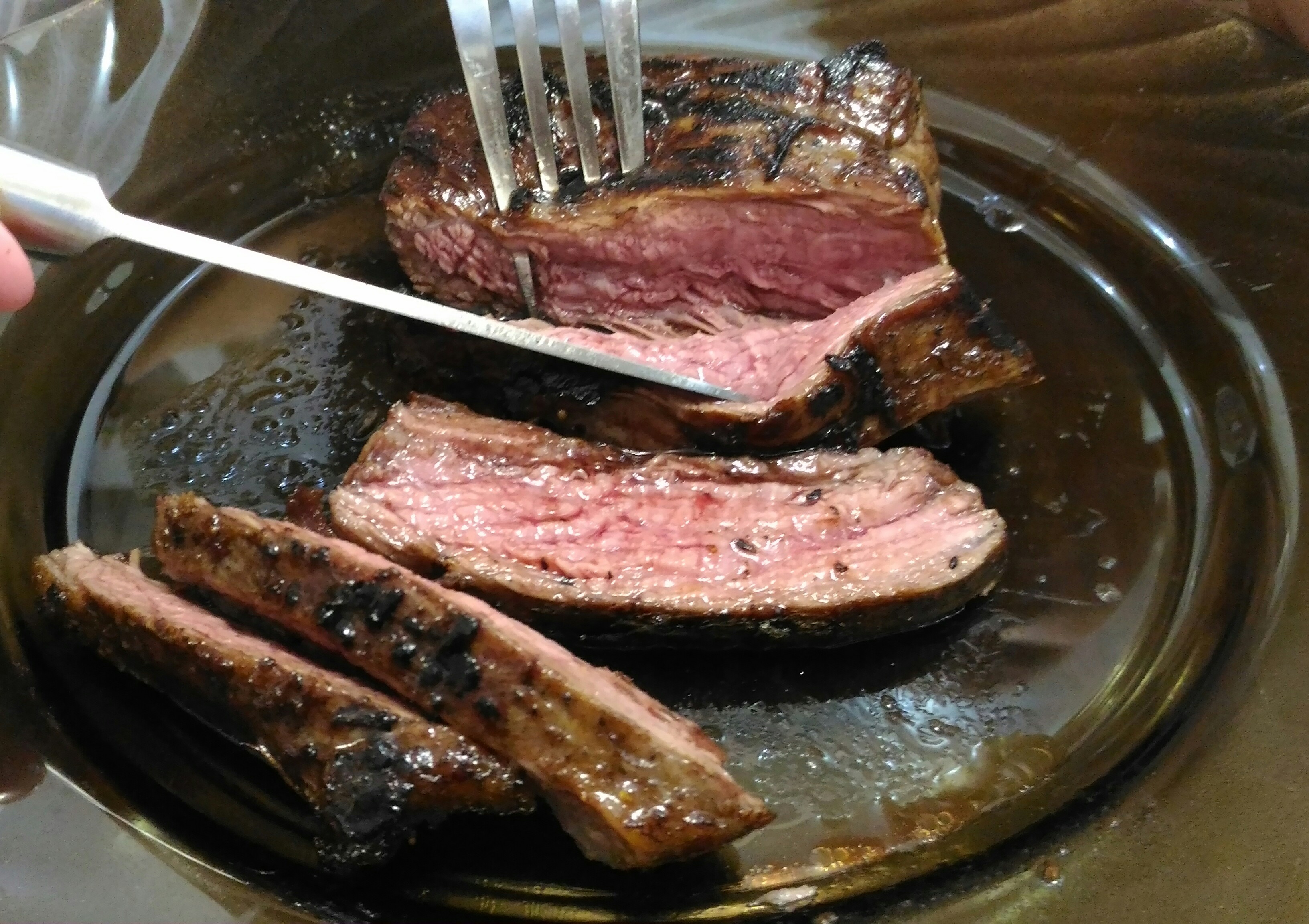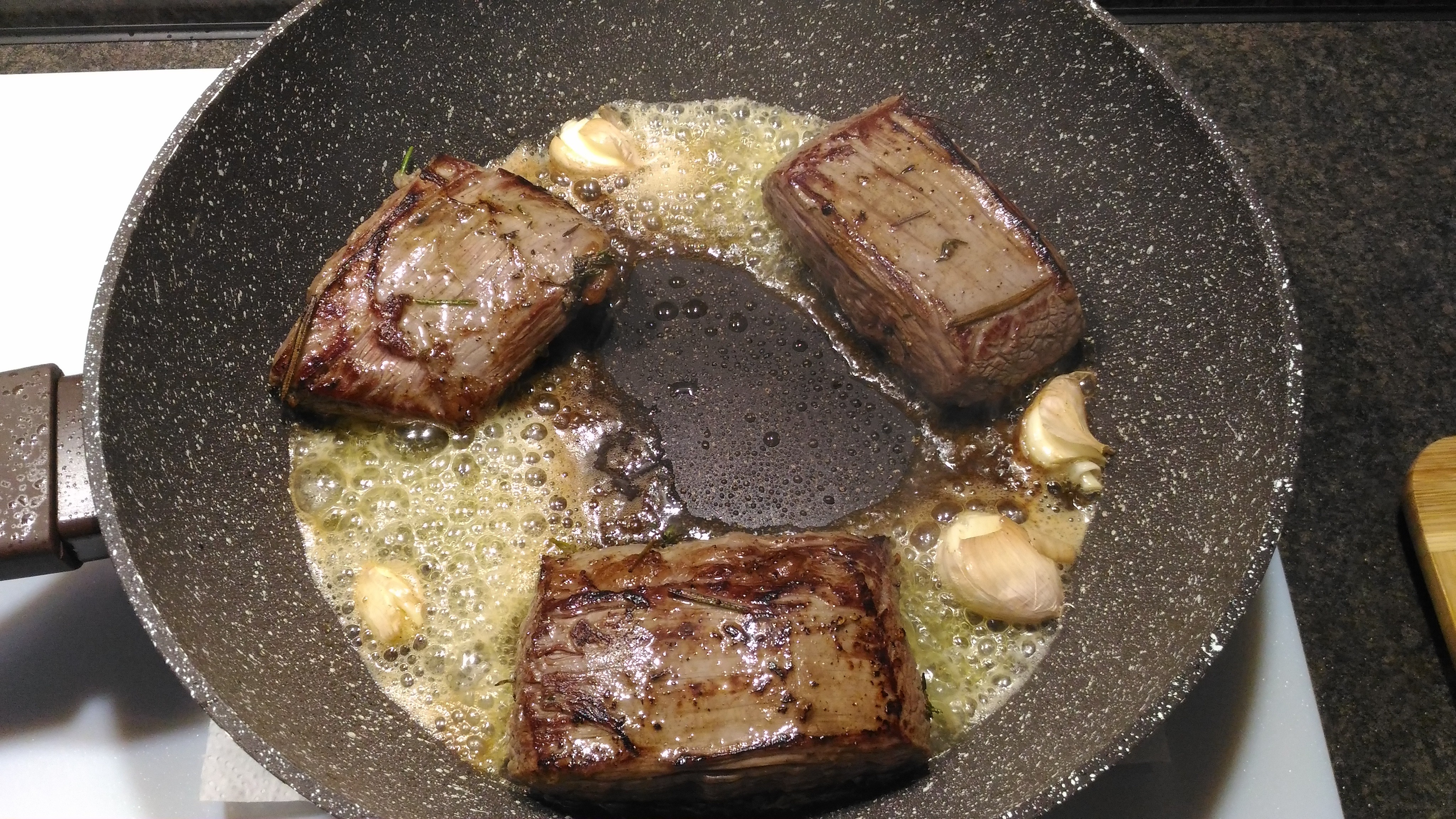 @Маришка, а как этот черный помидор на вкус? Как обычный помидор? Сегодня альтернативный стейк решил по случаю сделать - Фланк стейк от Мираторга. Сразу скажу, на 4 с минусом. Не рекомендую. Маринад тот же - олив ойл, розмарин, тимьян, перец, соль. Обжариваю по 2 минуты каждую сторону на максимуме с добавлением зубчика чеснока, потом по 3 минуты на половине мощности, а потом на тефлоновый лист в духовку на 120 градусов на 10 минут. Подача со свежим салатом и соус из вина красного сухого, сливочного масла и демиглясса.