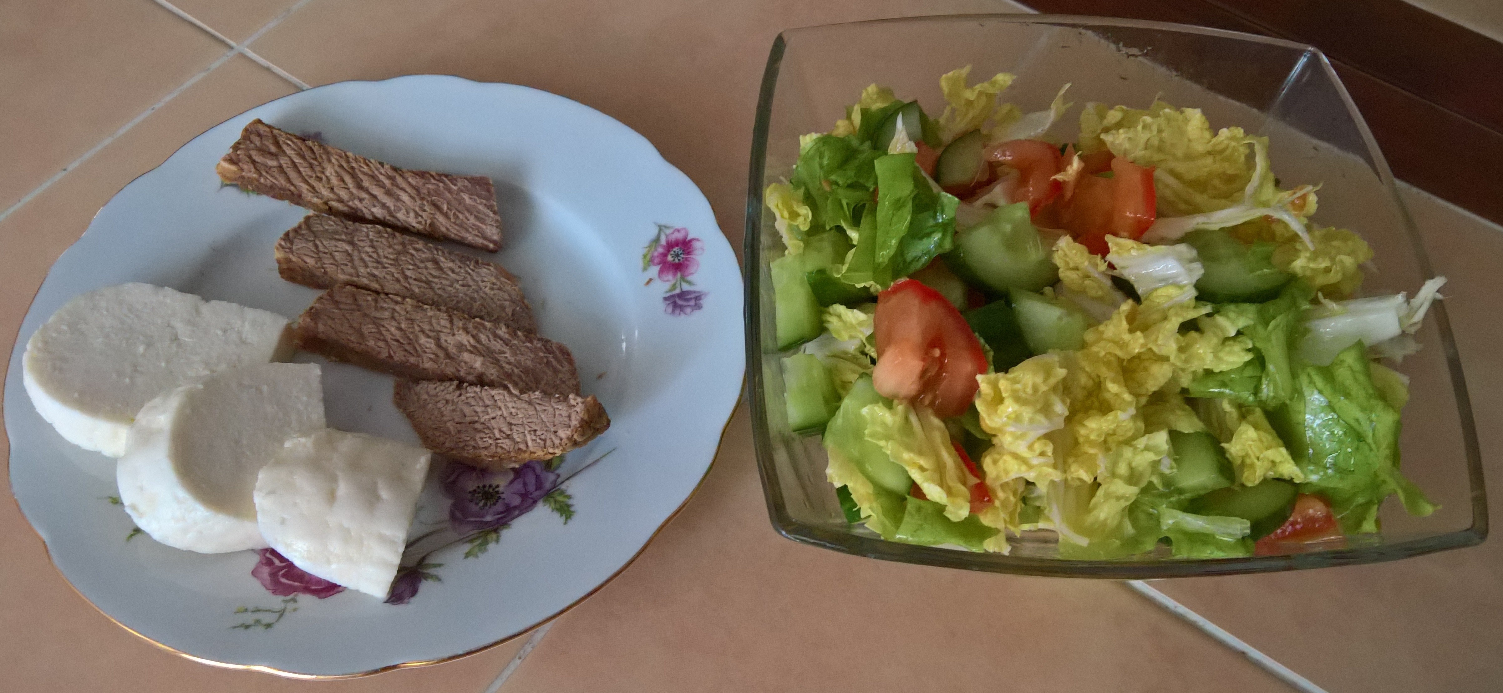 Скромный рецепт скромного диетического ужина. Говядина, приготовленная в медленноварке (2 часа на интенсивном режиме, часов 6 - на слабом), адыгейский сыр, овощной салат с оливковым маслом.