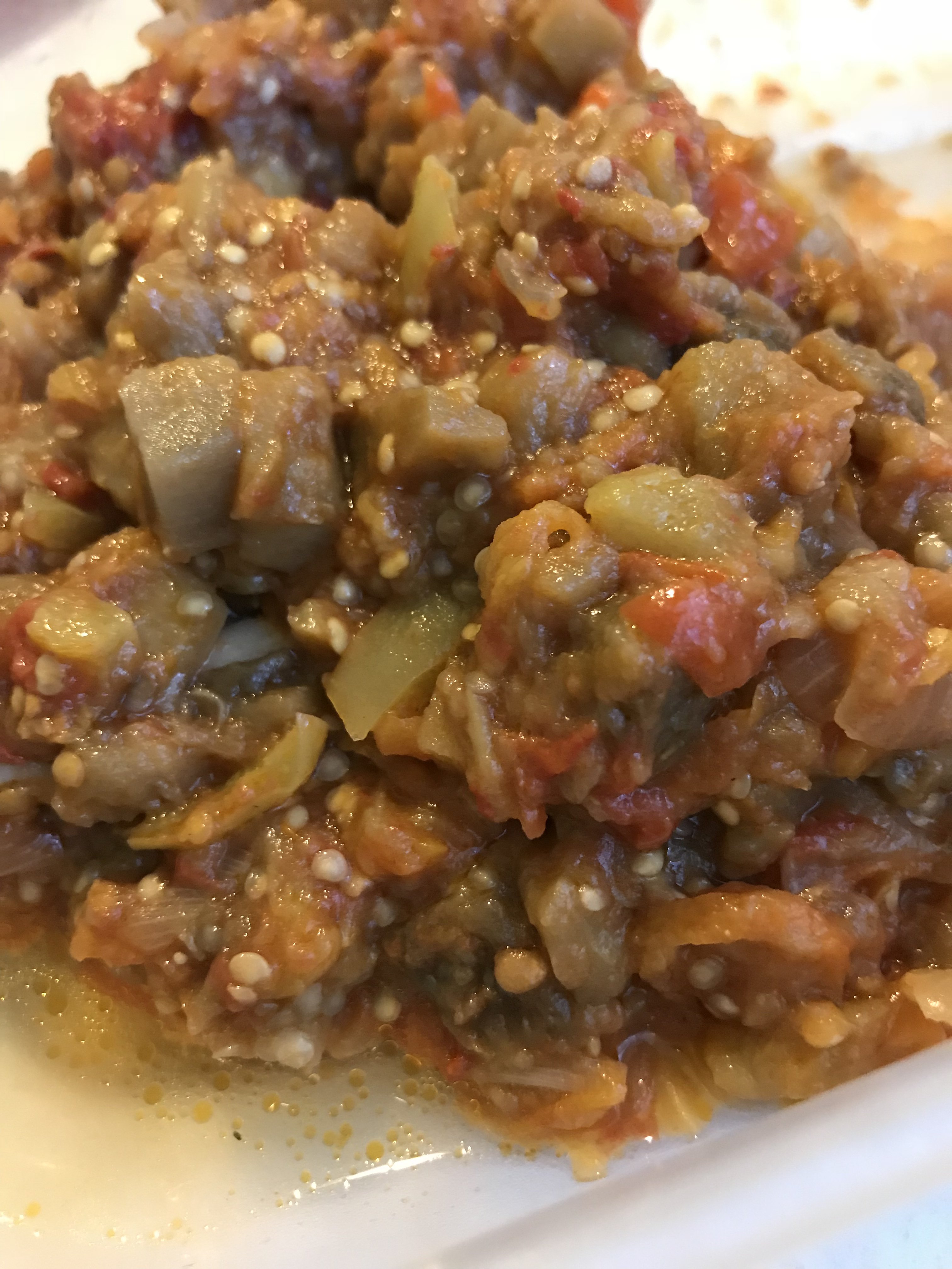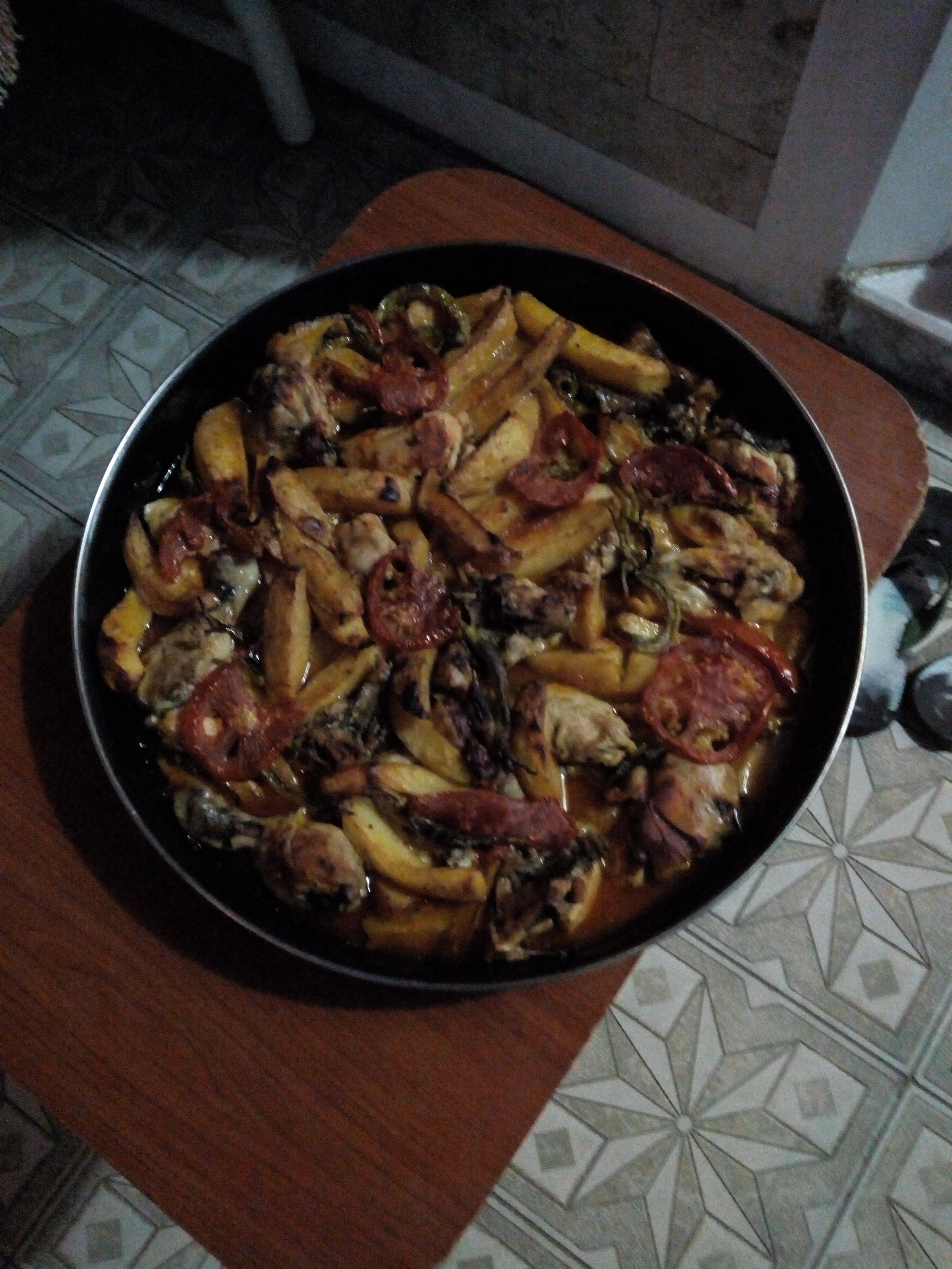 @Интриганка, у нас как раз курица: обжаренная, картошка тоже обжаренная (до готовности), помидоры свежие кружочками, перец сладкий, масло сливочное кусочками - все залить горячей водичкой со специями - и в духовку (сорри, не очень четкое фото) На гарнир - рис с поджаренным орзо, на десерт -виноград и кукуруза вареная