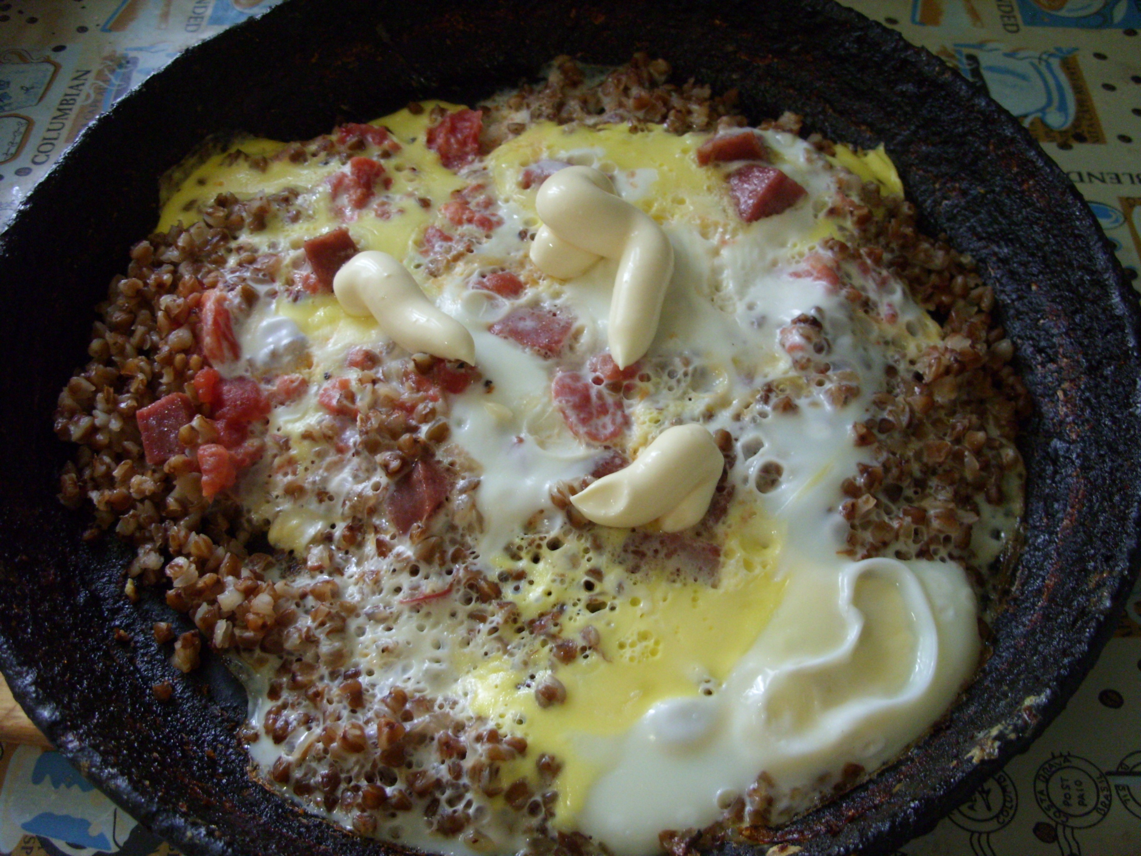 Чего-то подсел. Гречка, маринованные помидоры, ломоть колбасы, яйца, майонез оливковый: Пицца гречневая ))). И хлеб. Надо ещё что-то сочинить, ну или вспомнить, с моркошкой и с капусточкой.