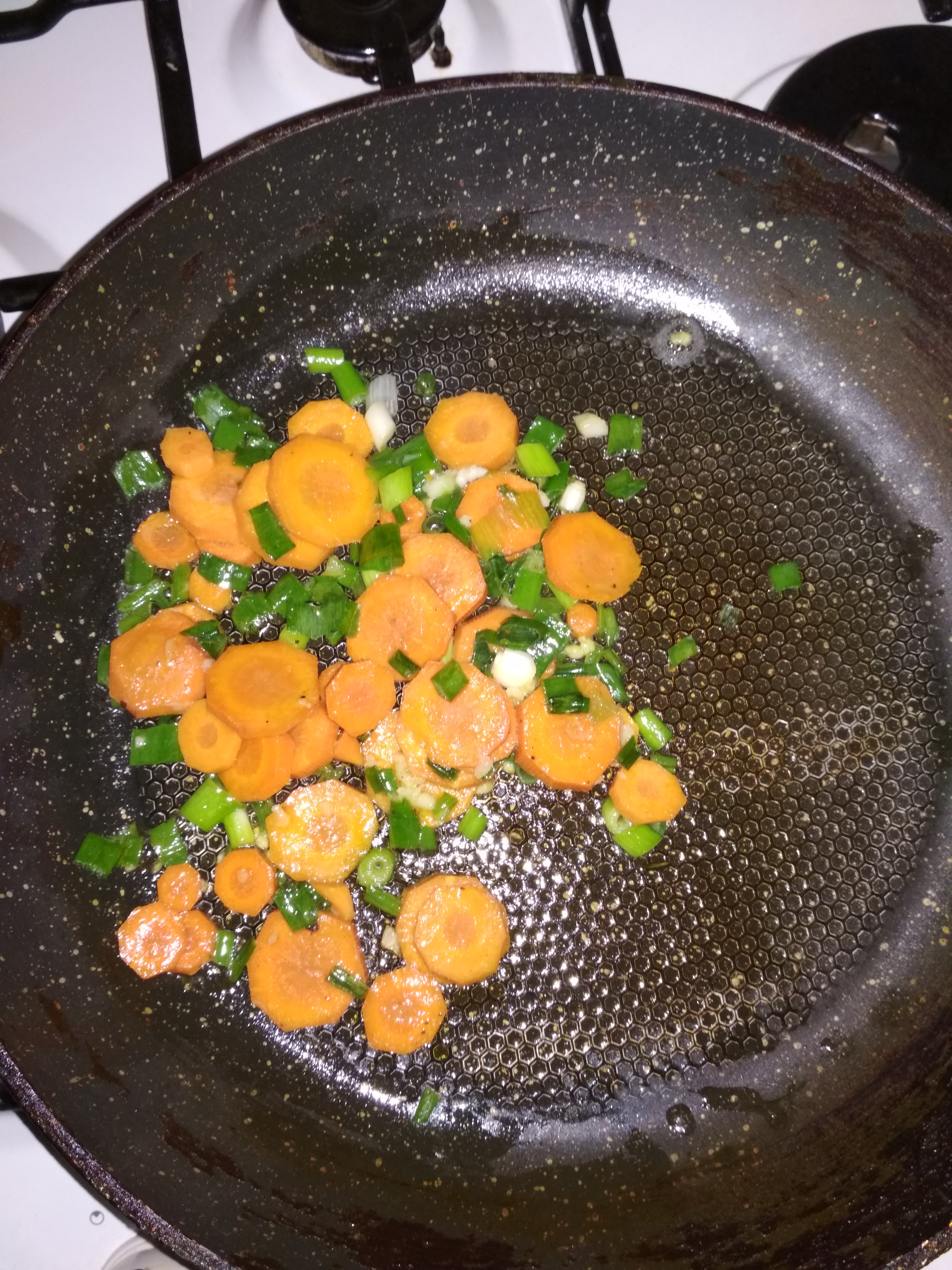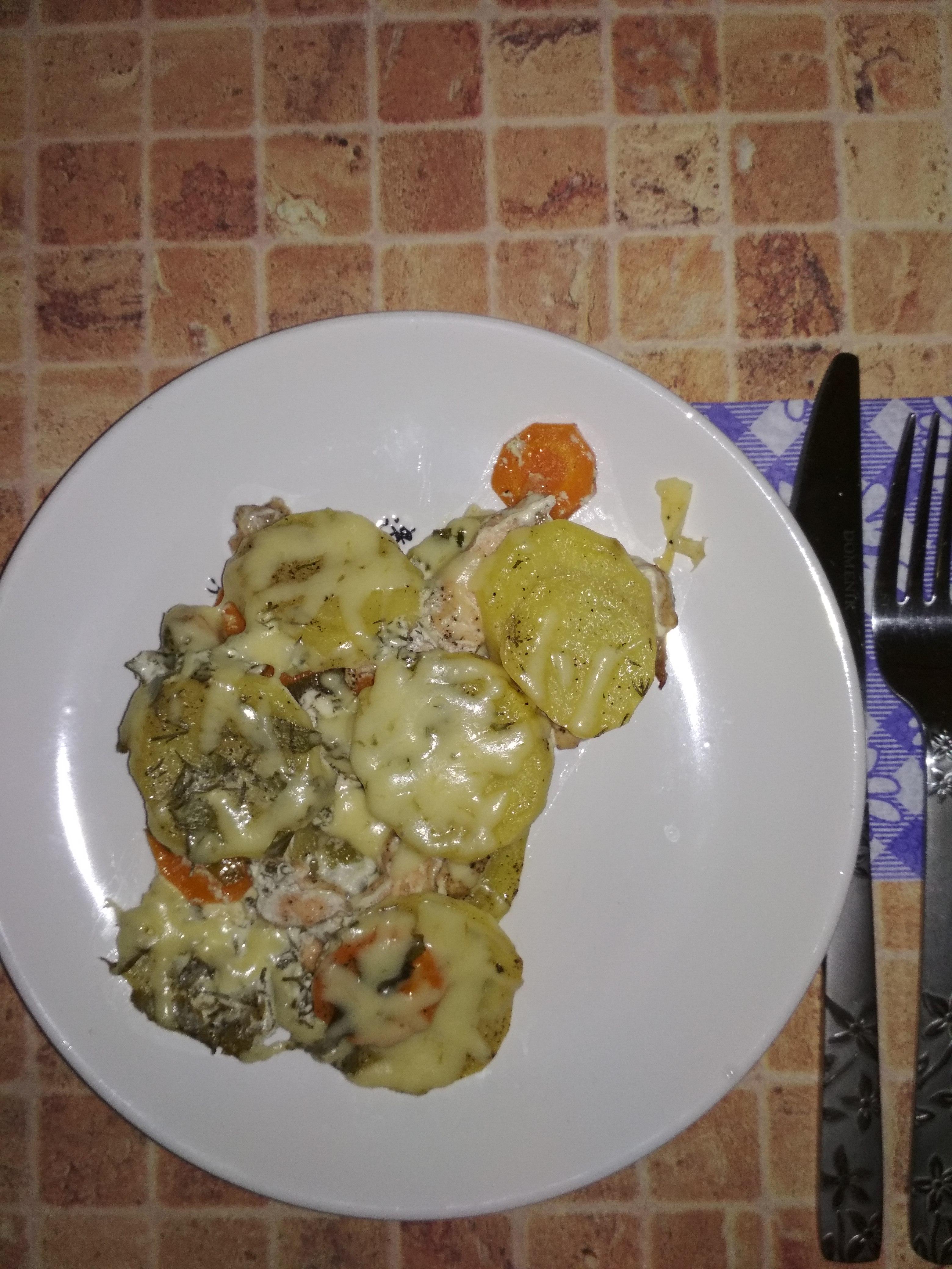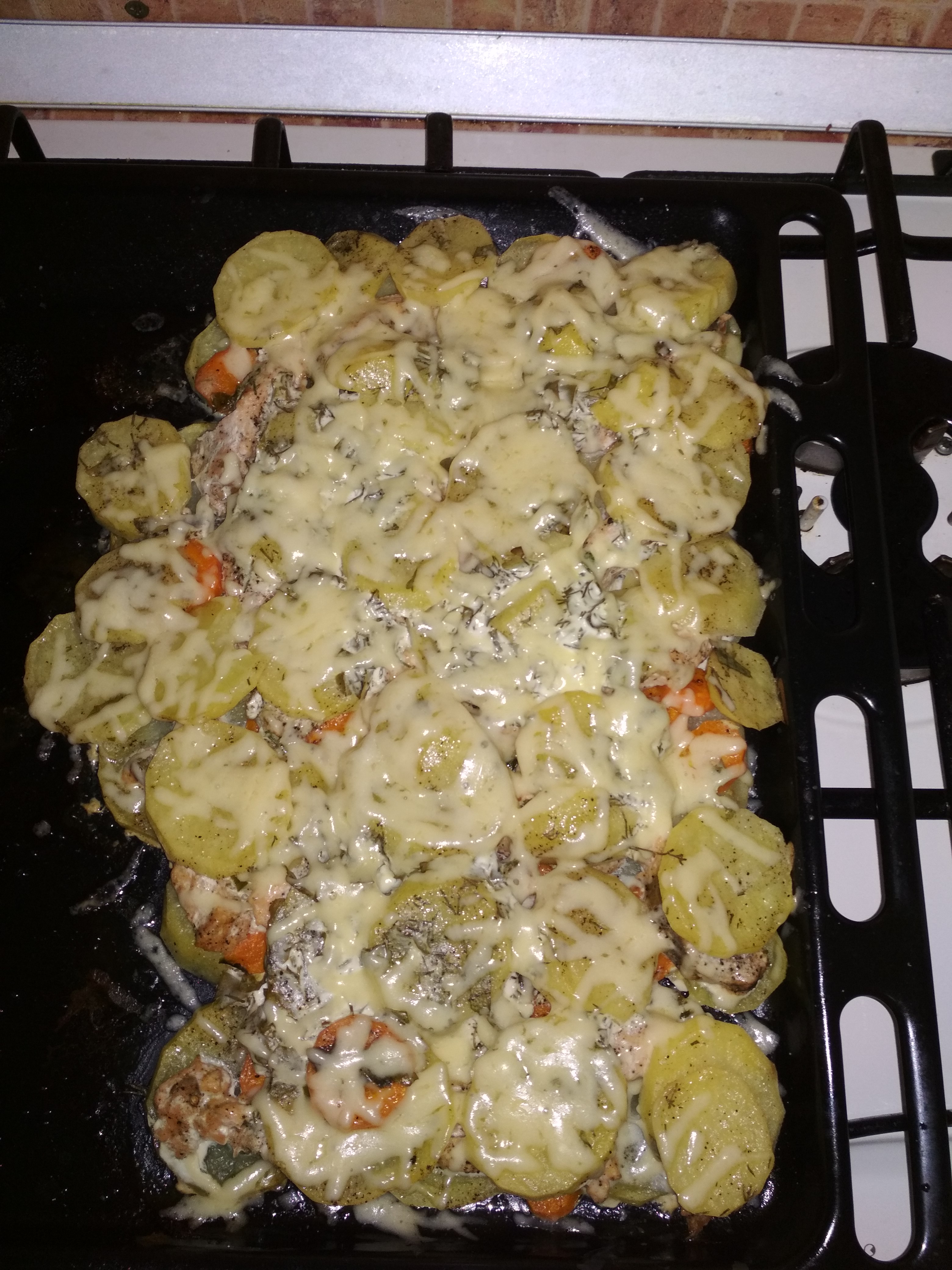 Я решила молодой картофель приготовить с рыбой (кусочек киты оставался). Рыбу замариновала лимон, соль, перец. Картофель кружочками. Морковь потомила в сливочном масле с зеленым луком и выдавила зубчик чеснока. На противень слой картофеля, потом морковку с луком, рыбу и еще слой картофеля. Сверху смазала сметаной с зеленью. В разогретую духовку на 40 минут. Сыта и довольна