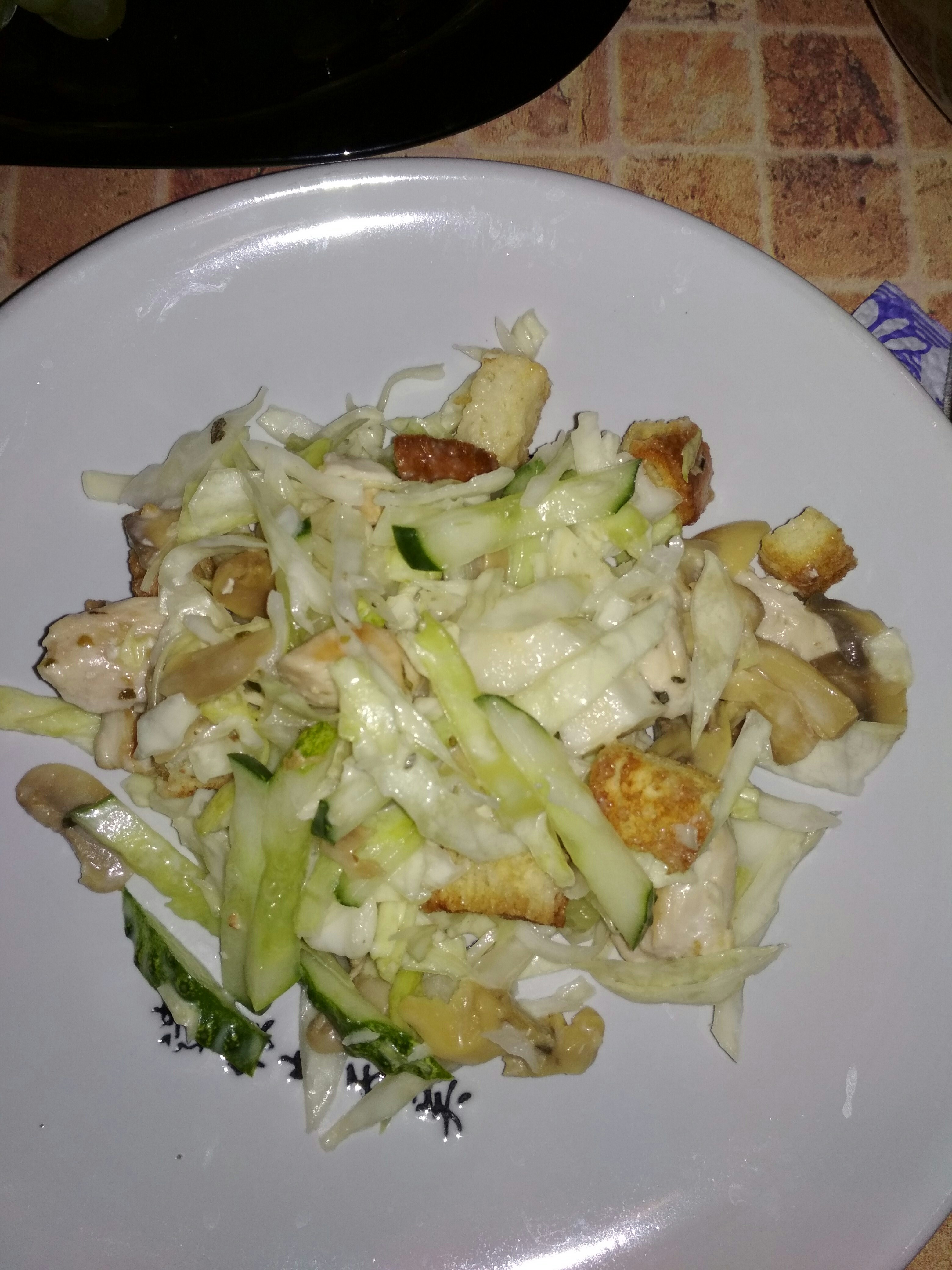 Сегодня готовила салат: капуста, куриное филе, грибы консервированные, огурец свежий, сухари, заправляла майонезом (лучше сметаной). И шампанское
