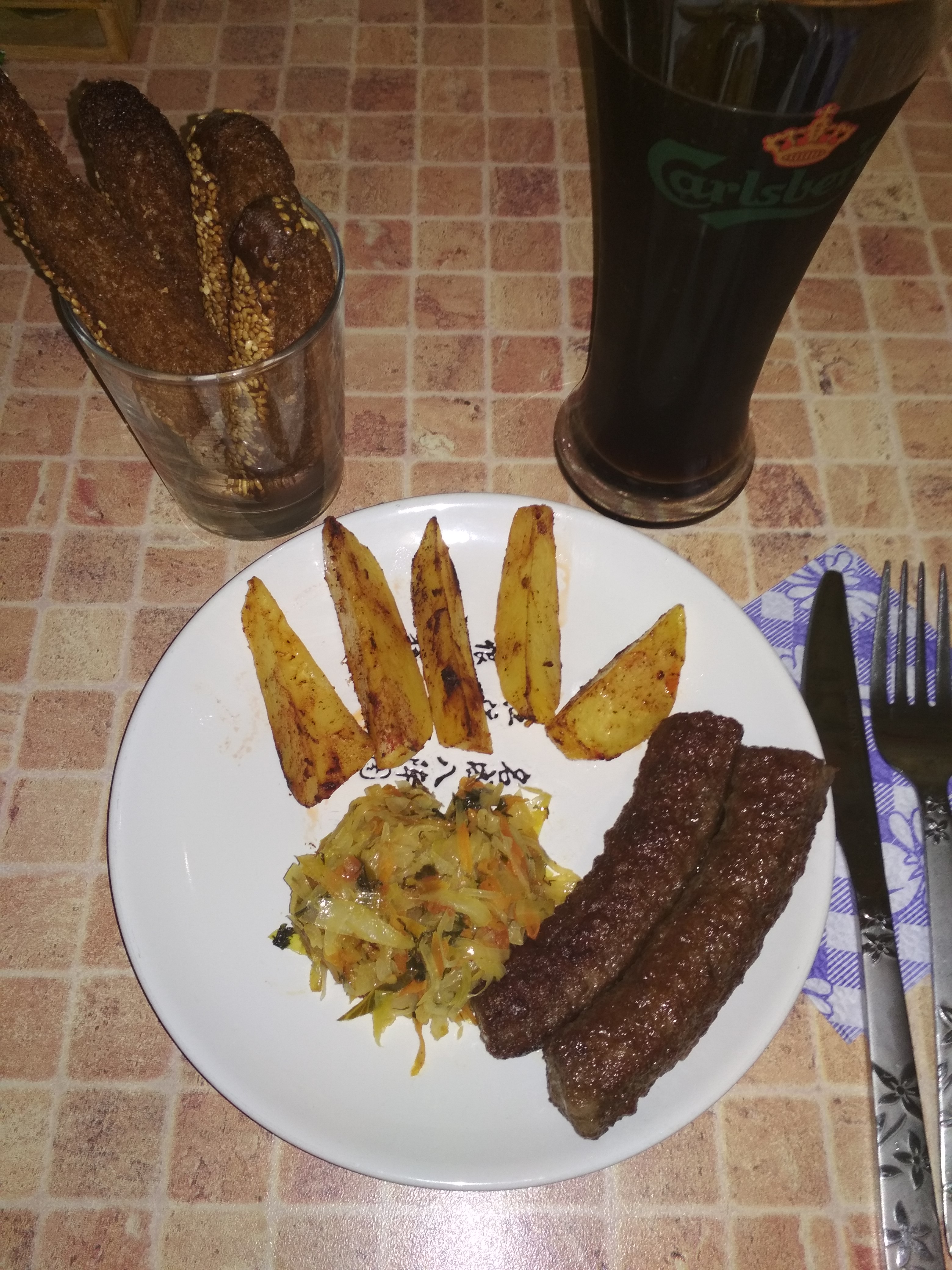 У меня сегодня ужин в баварском стиле: запеченный картофель по-деревенски, тушеная капуста, мираторговские "Чевапчичи", ржаные сухари, обмазанные чесночным соусом и темное пиво иногда можно себе позволить))