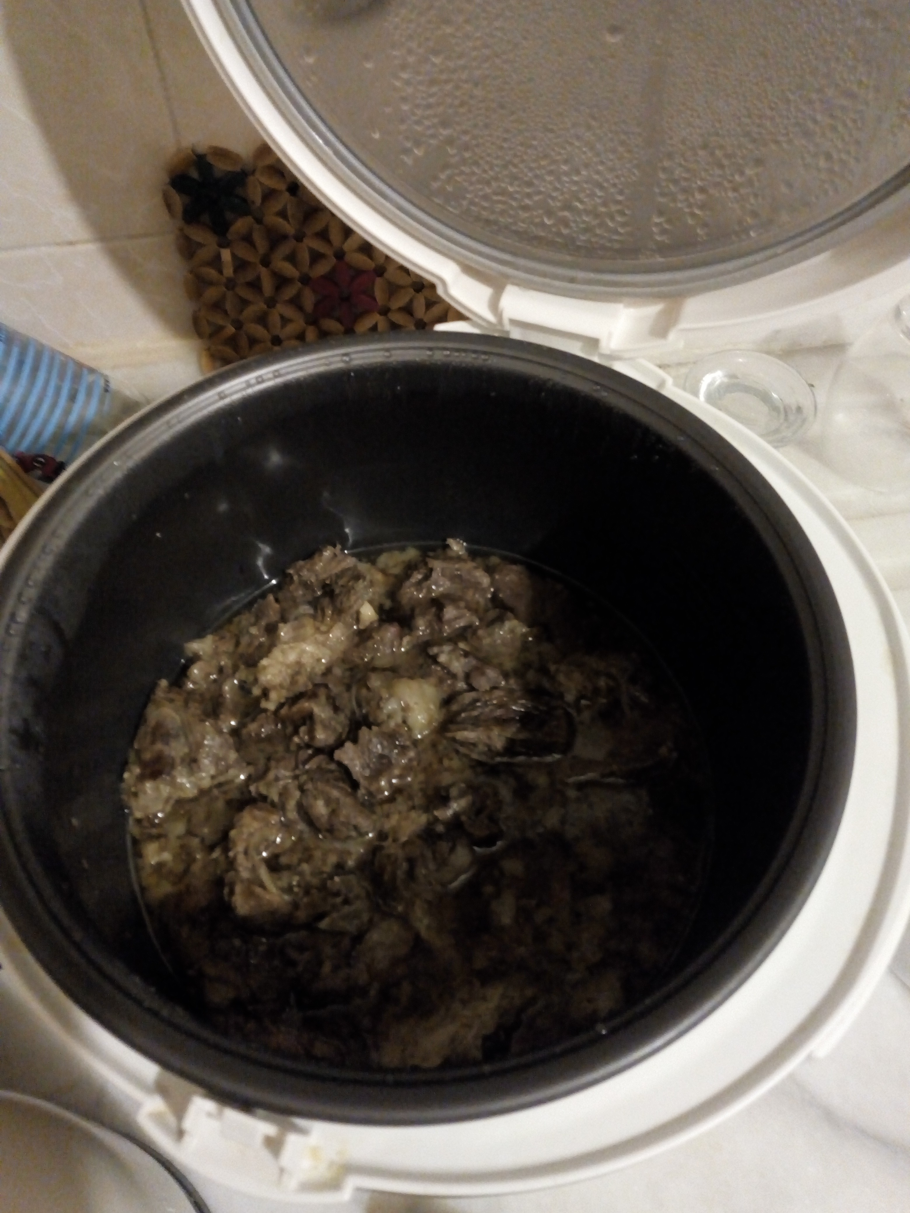 Ничего необычного. Чисто мясо в собственном соку, на 5 часов томления. За час до окончания посолила и положила перец горошком и лаврушку. После тушения лаврушку убираю, чтобы не горчило Когда мясо с пленками и жилами, то лучше всего именно так и приготовить, когда все отделяется по волокнам практически