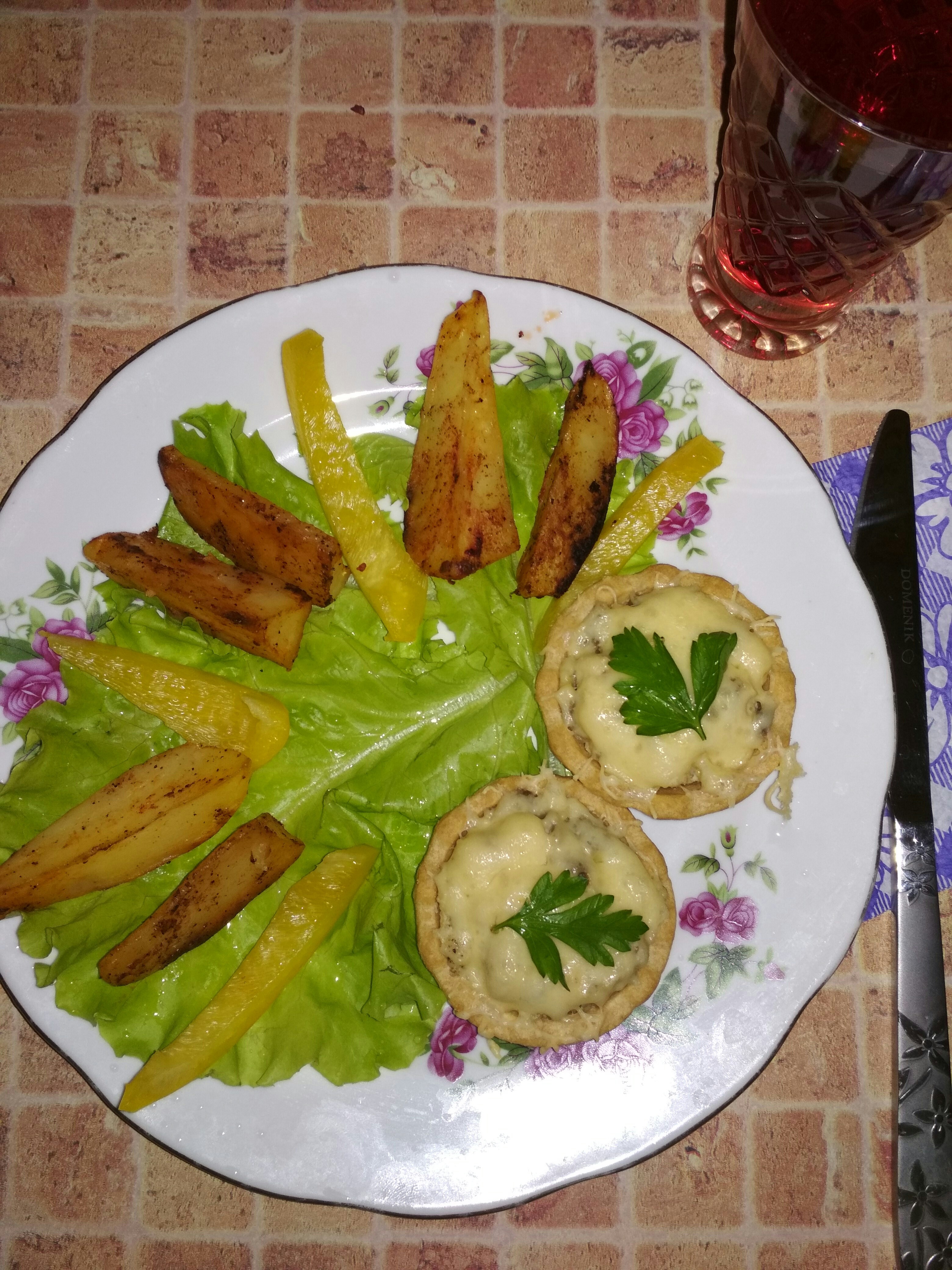 Сегодня готовила корзиночки с куриной грудкой, шампиньонами, луком. Лук мелко порезала, обжарила на слив.масле, к нему добавила мелко порезанные шампиньоны. Затем добавила филе, посолила, поперчила. Когда вся жидкость ушла, добавила сливки. В готовые тарталетки добавила начинку, посыпала сыром. В духовку на 10 минут. На гарнир вчерашний картофель разогрела. Мне вкусно, а дочь что-то не взлюбила грибыне ела( для неё второе готовлю блюдо. И еще сырники готовила в формах для маффинов. Рецепт во вложении, сорри, но переписывать уже сил нет в некоторые добавляла мармелад, как на фото))очень клевые получились, румяные и вкусные))на готовилась на неделю вперед))) все-таки пельмени хороший совет ))