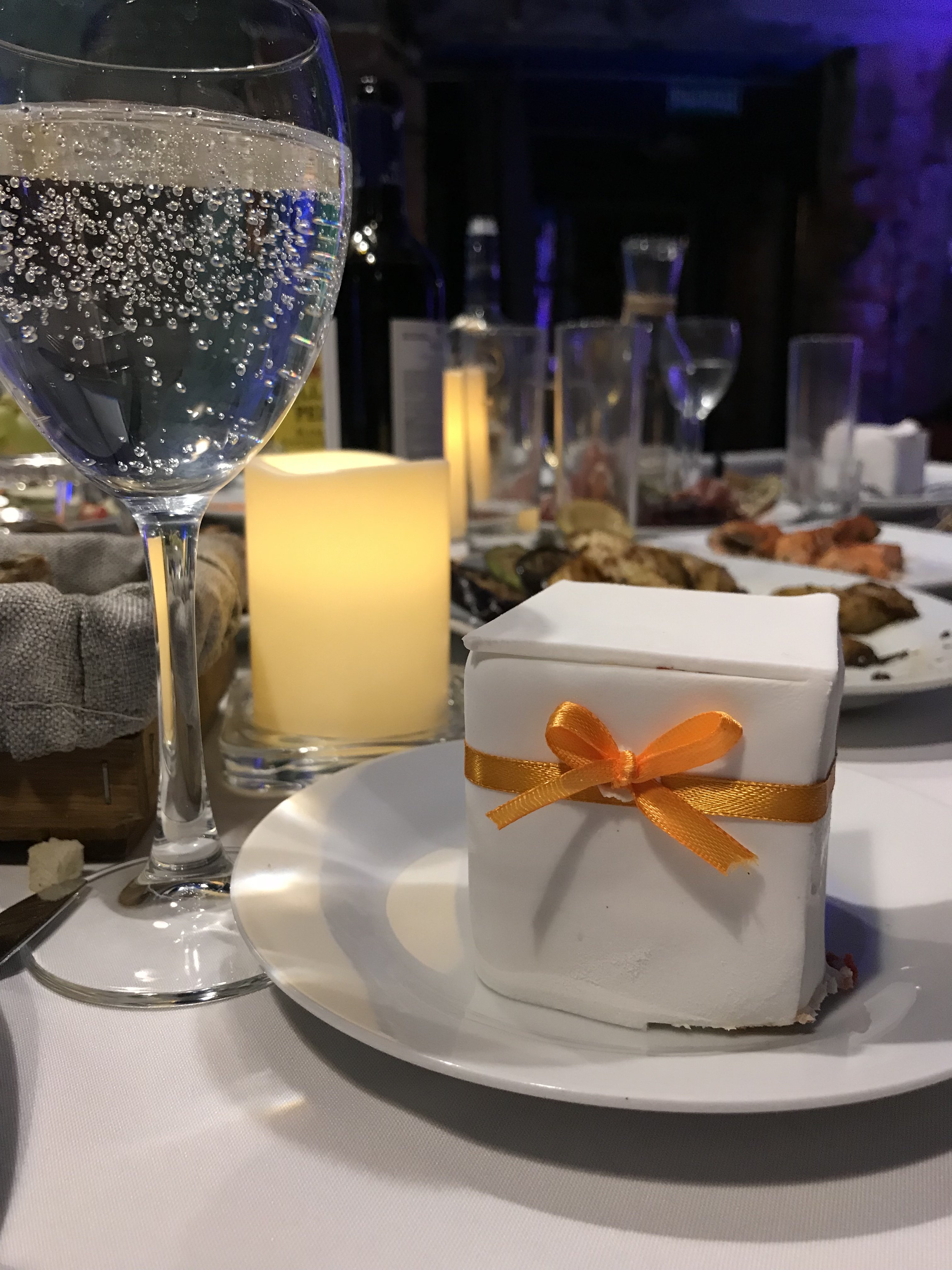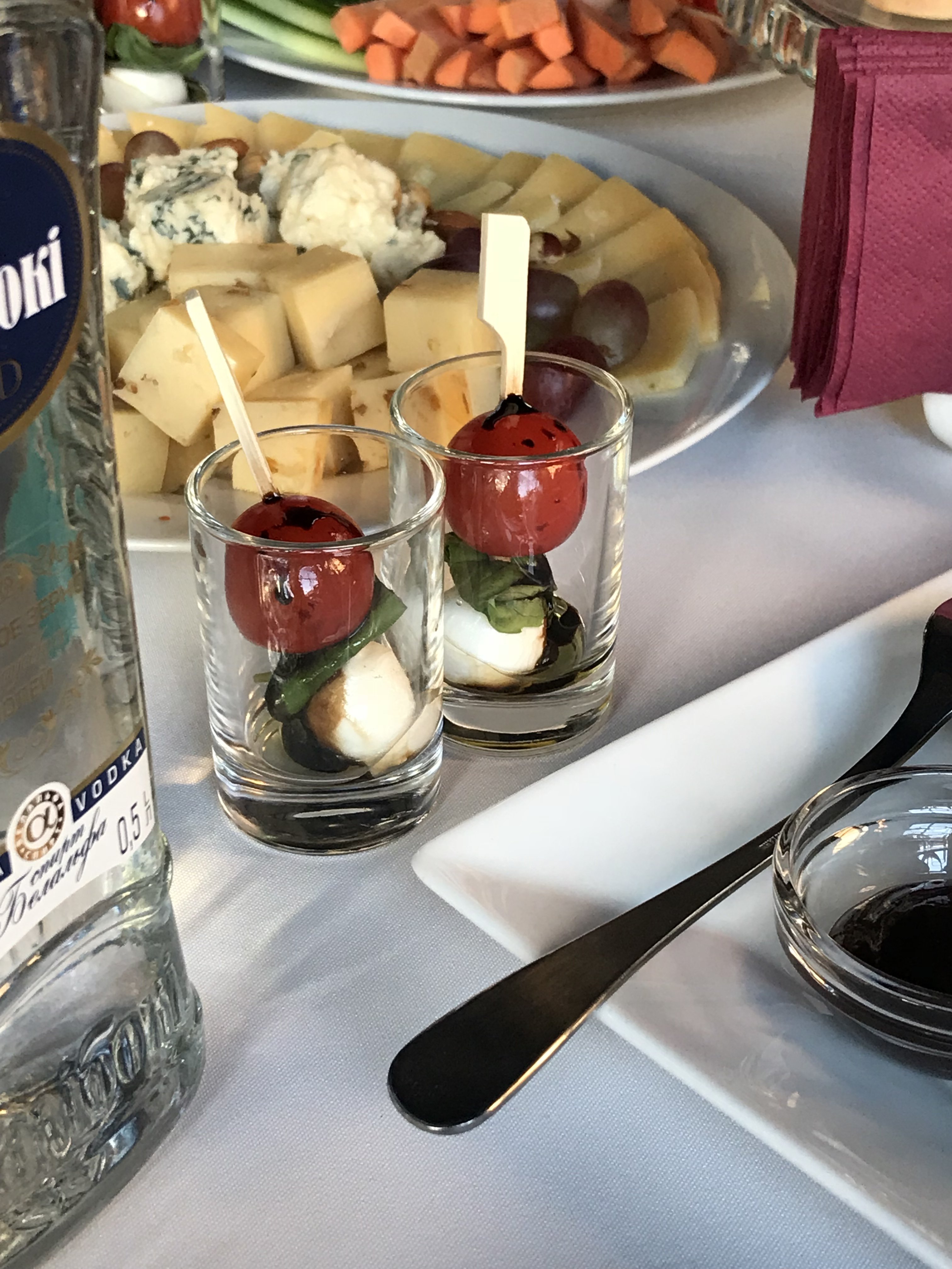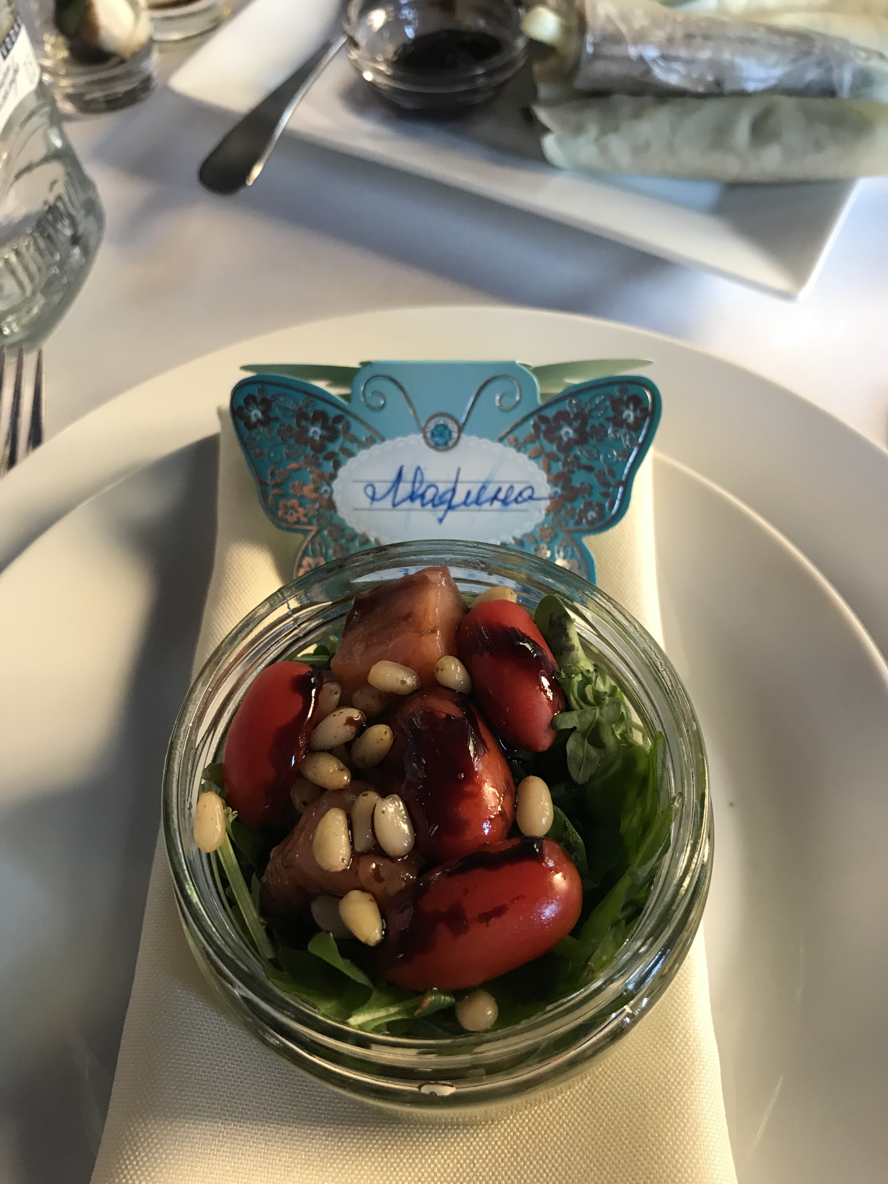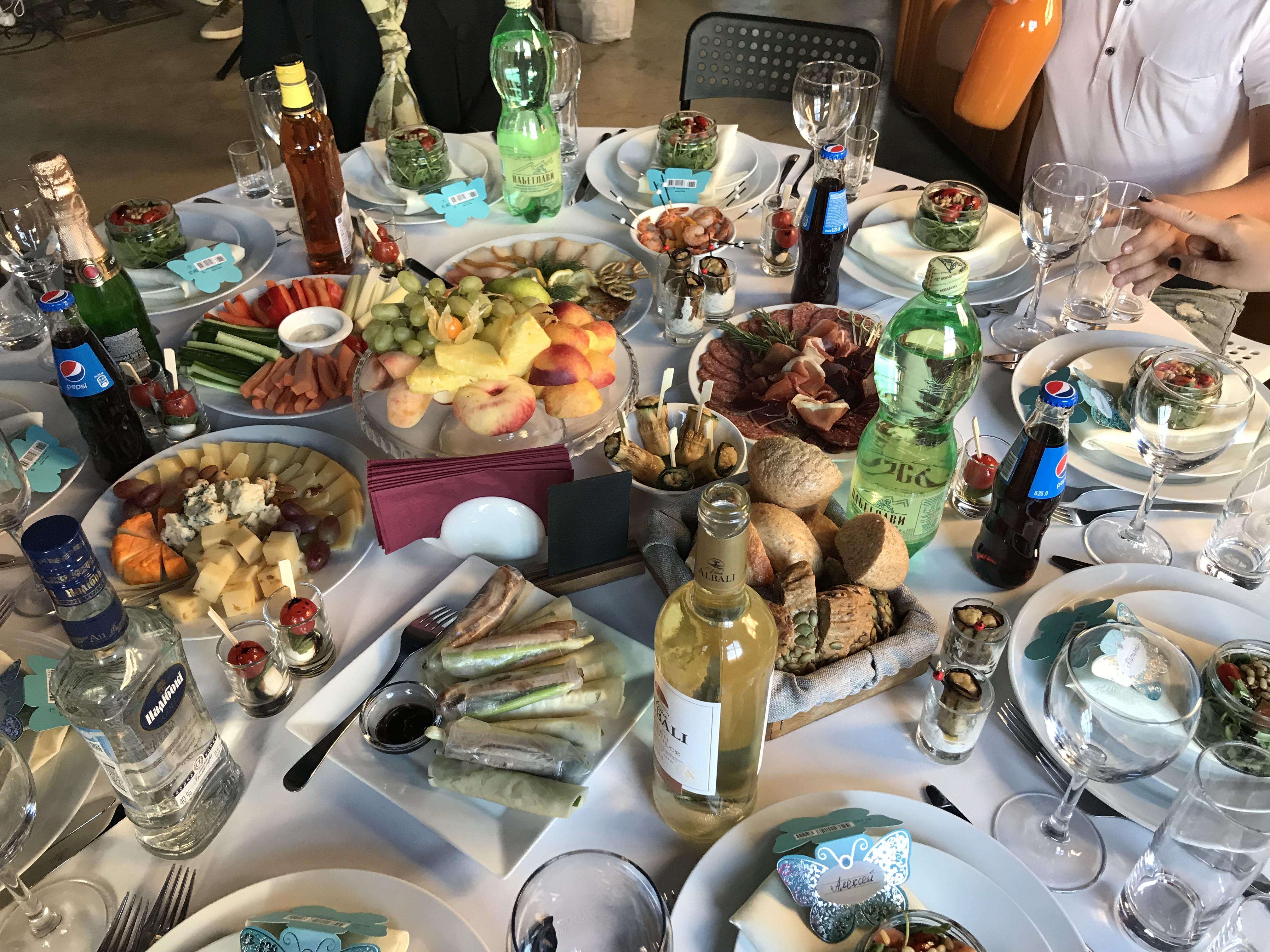 Немного моего ужина. Что не съела, то понадкусала)) Горячая закуска был жульен грибной оформленный в блине. Потом ещё был шашлык: свинина, курица, красная рыба и овощи. Салат Цезарь с курицей, креветками.