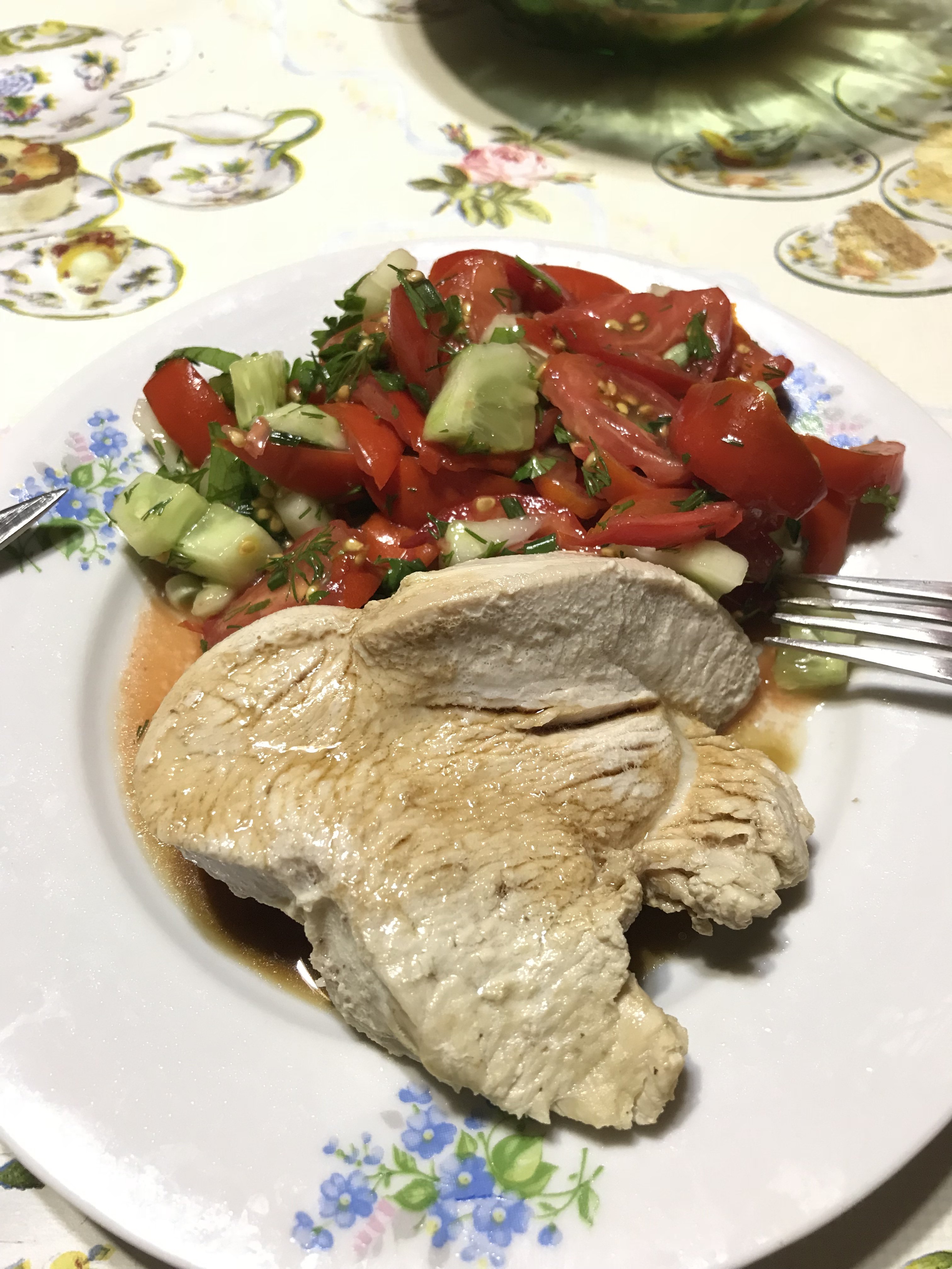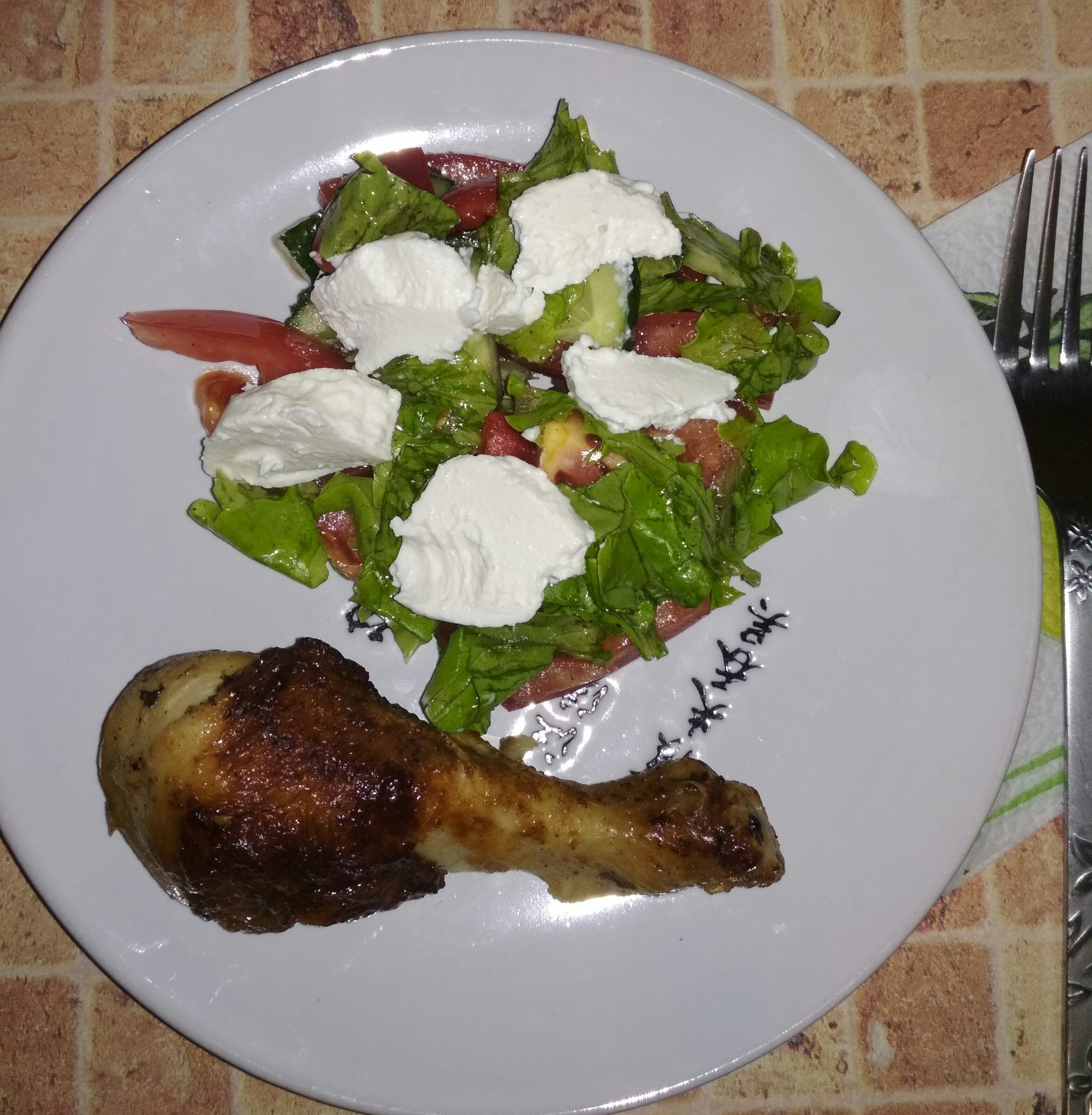 Вчера был вредный ужин, от того он еще вкуснее Осталось две голени, нм туда, ни сюда)) решила их просто обжарить, предварительно подержав в соевом соусе. Вместо гарнира салат овощной. К чаю пирог вишневый.