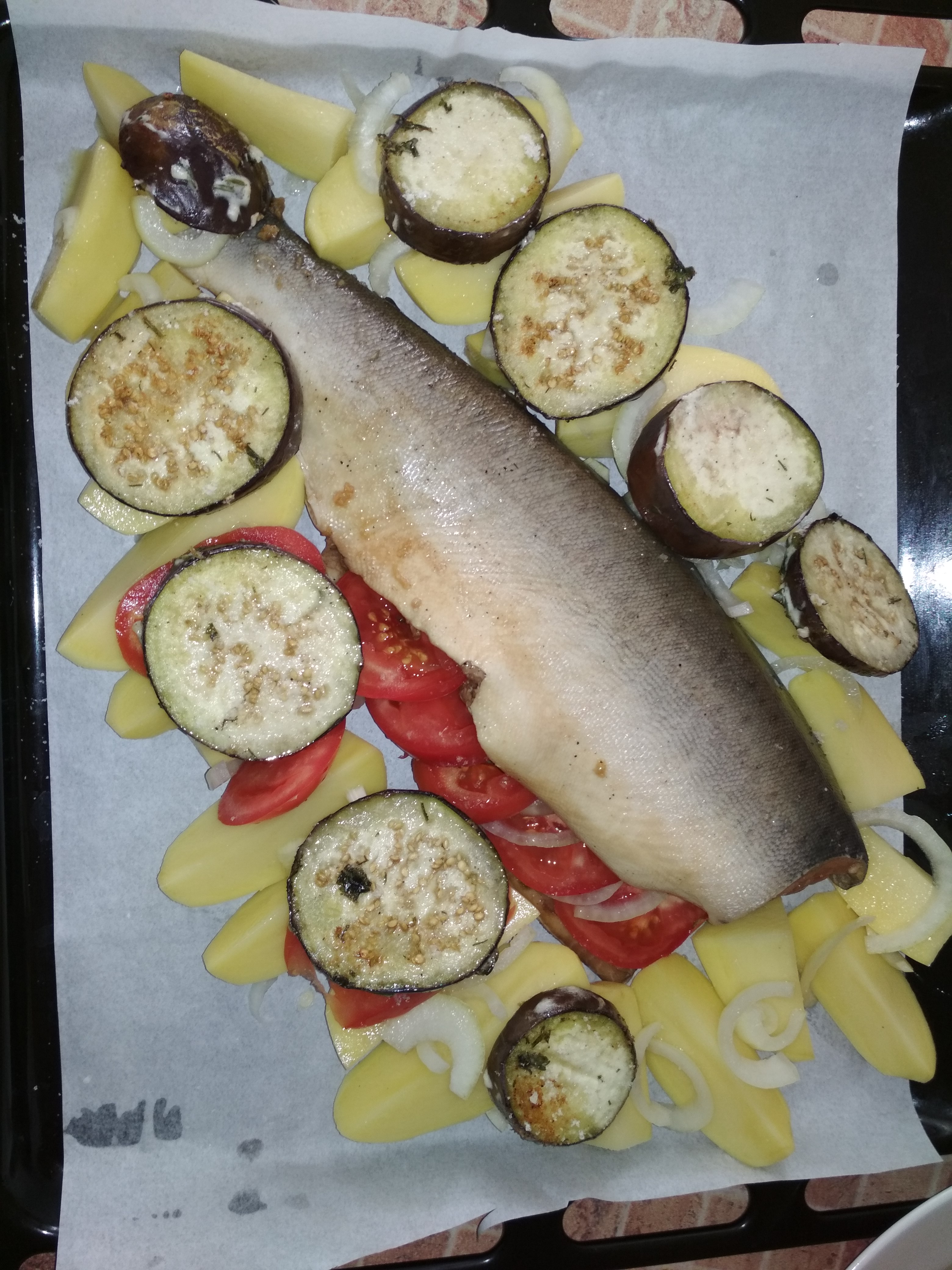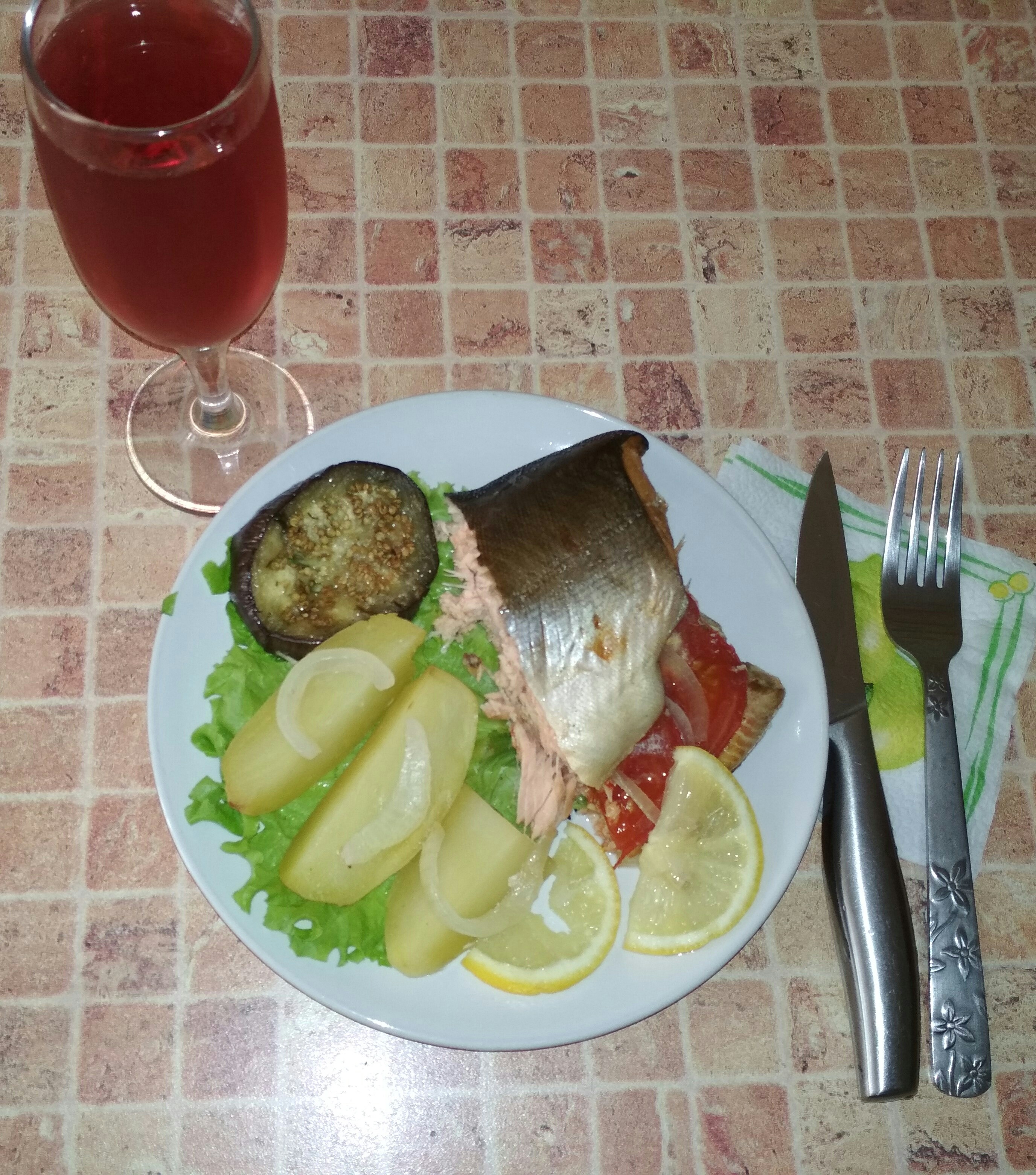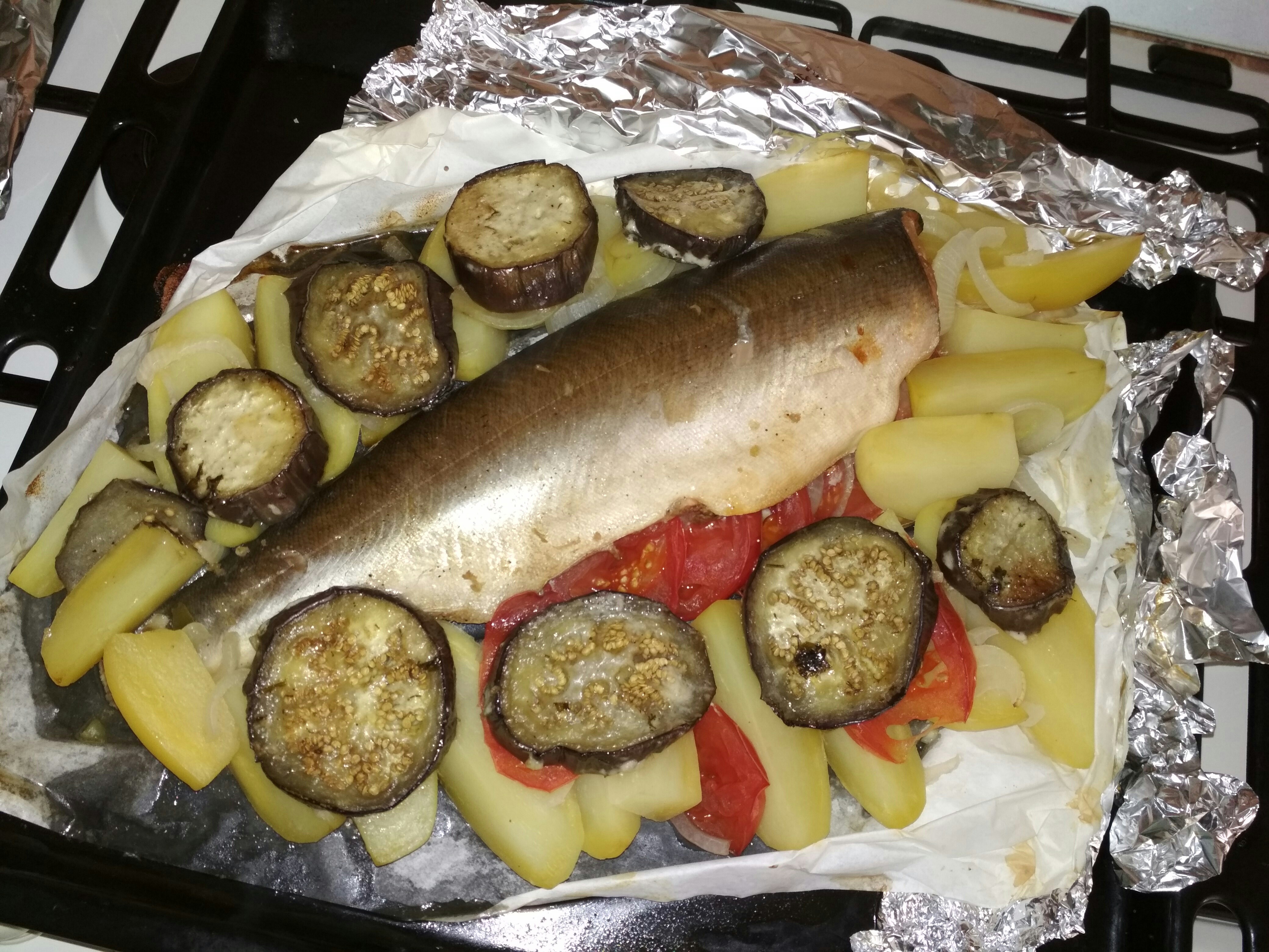 • сегодня горбуша с овощами рыбу час мариновала в соевом соусе+имбирь+сок лимона+перец. Надо было туда репчатый лук полукольцами, он бы тоже помариновался. Баклажаны обмазала майонезом+чеснок+зелень и слегка обжарила на сковороде. Картофель обмазала горчица+мед. Всё выкладываем на противень. Ставим на час в духовку при 180 градусах.