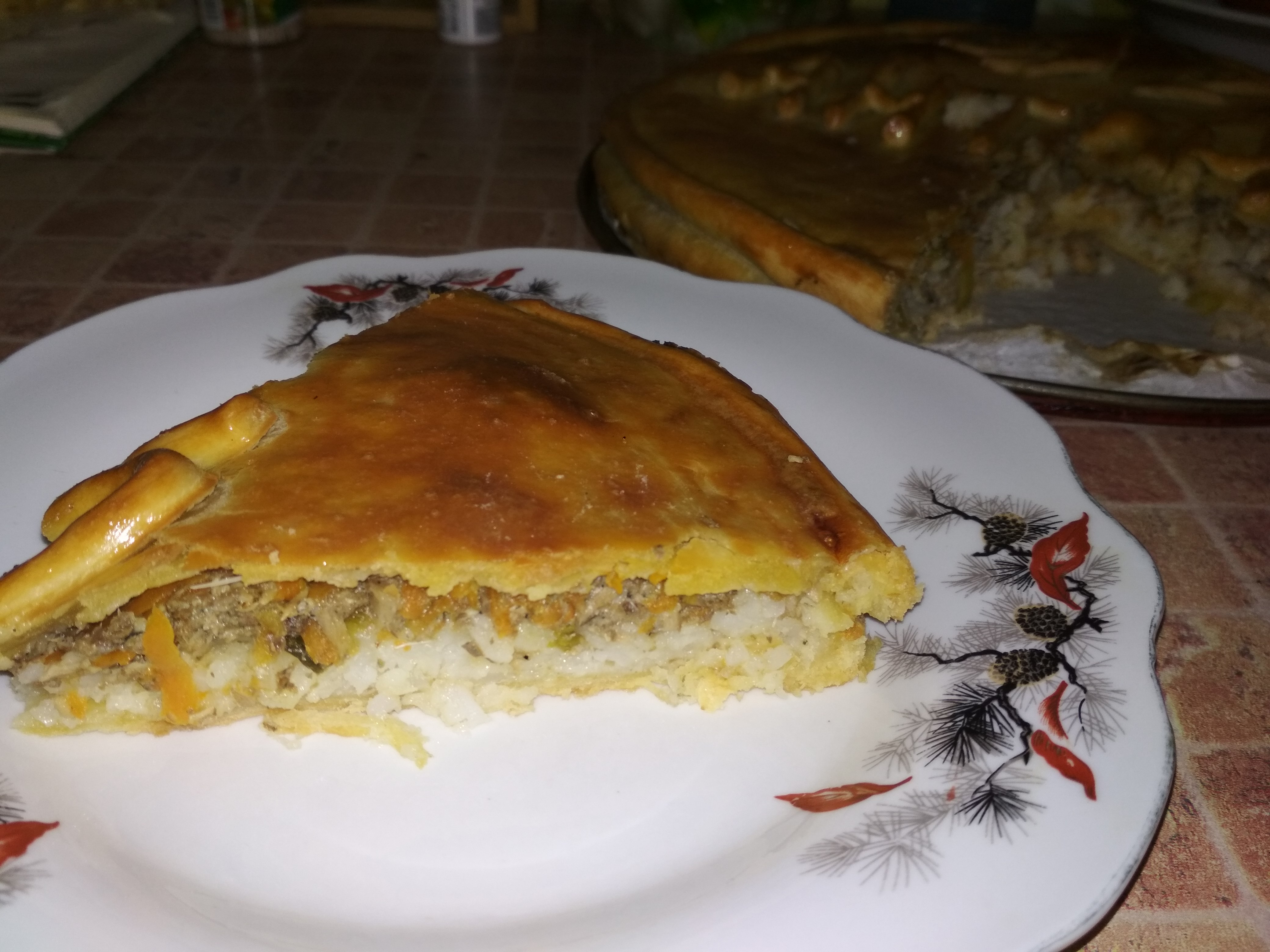Сегодня пирог с рыбной консервой. В начинку добавила обжаренную в слив.масле морковь и зеленый лук Ну, и человеку хотелось сюрпрайз сделать ))