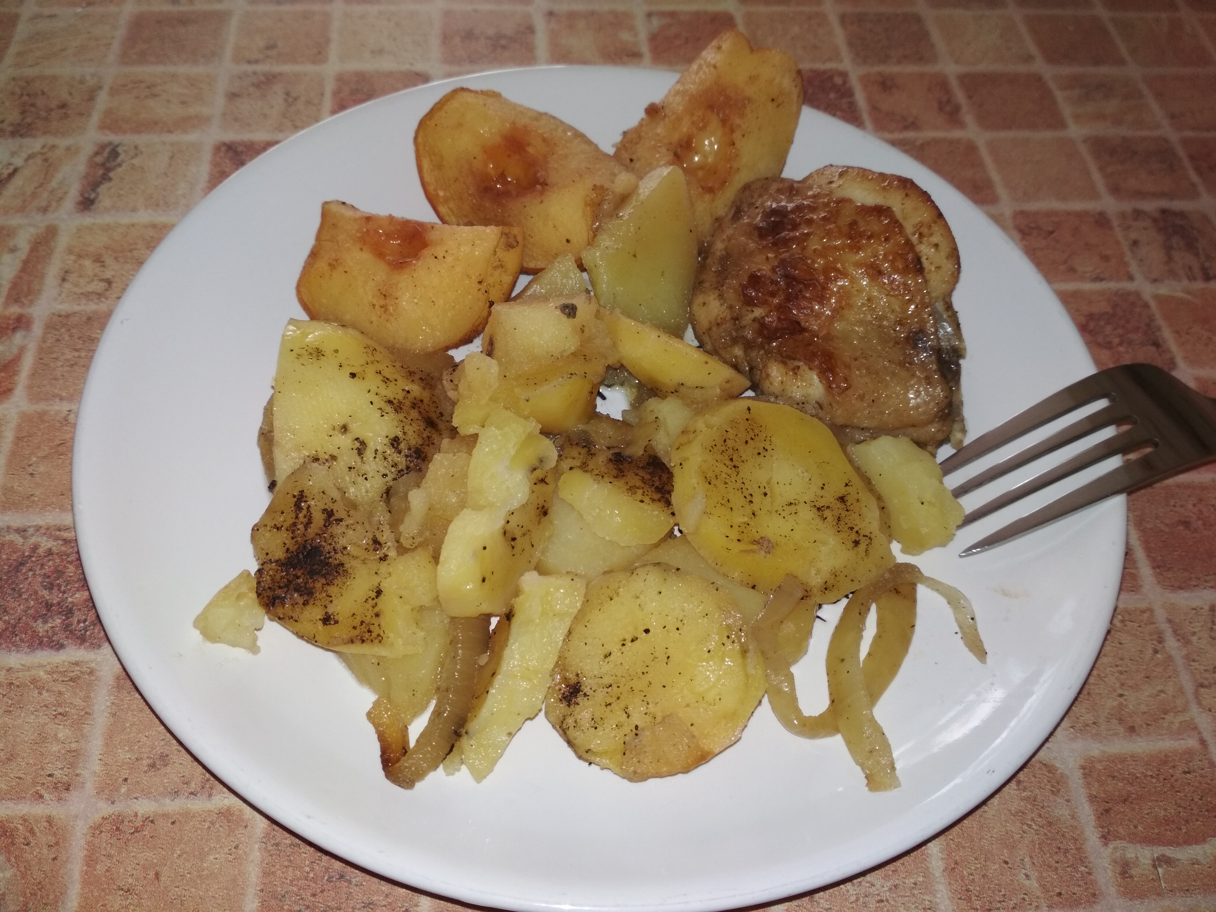 Запеченный картофель с курицей и айвой. Курицу с луком мариновала в соевом соусе+ горчица, айву в сахарном сиропе с корицей. В духовке готовилось примерно час
