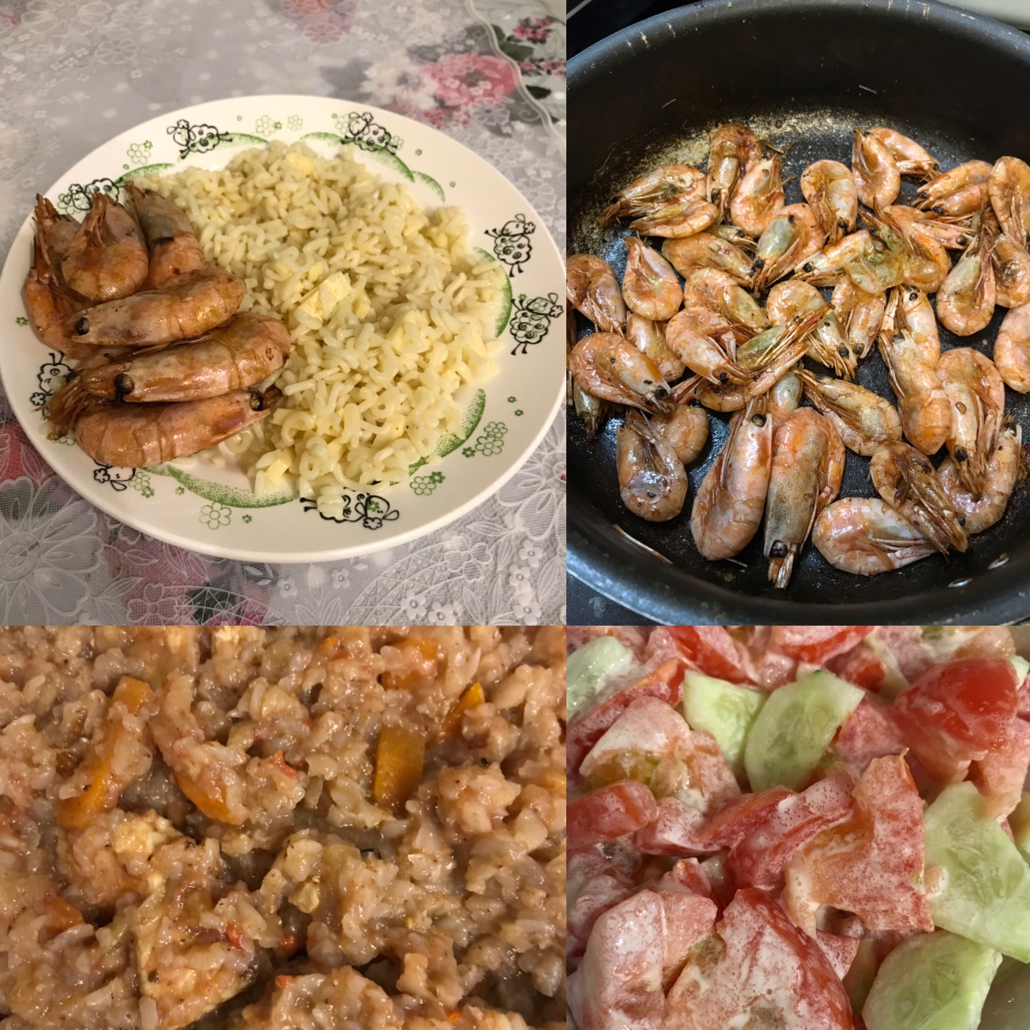 Креветки жареные с соевым соусом. Макароны алфавит с сыром. Гречка Нордик с подливкой мясной из индейки и салат.