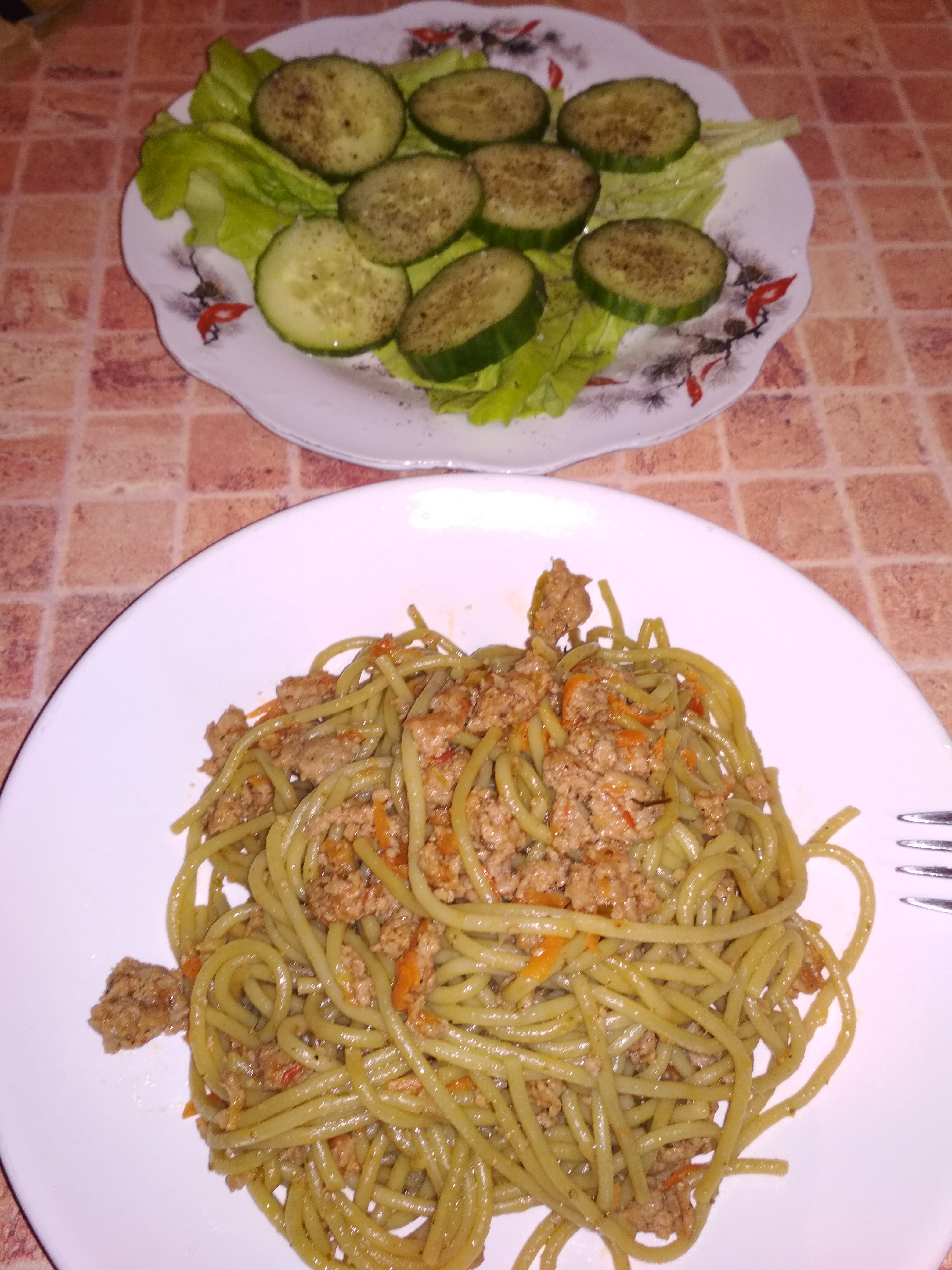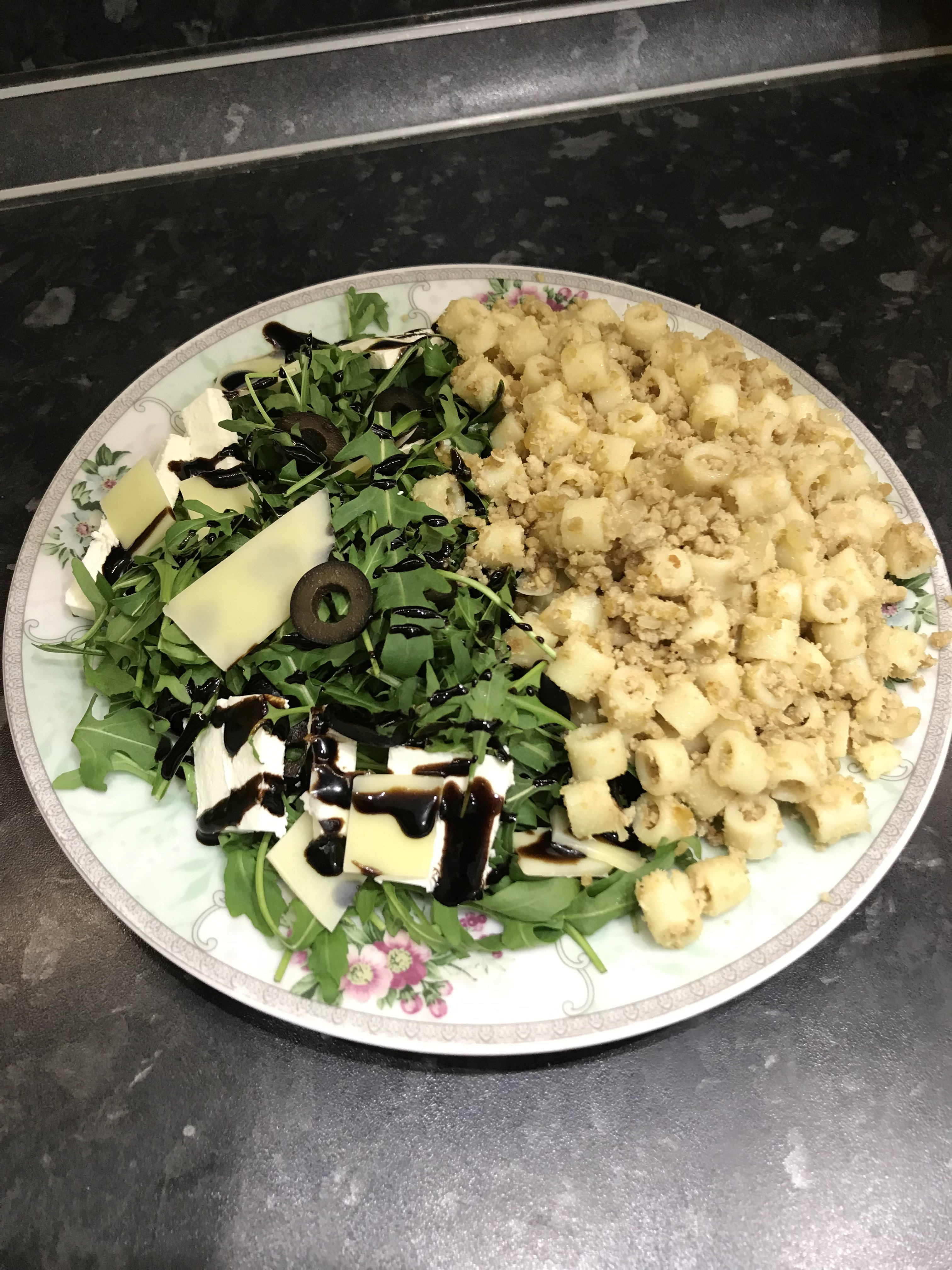Руккола, сербская брынза, твёрдый сыр, маслины и бальзамической соус. Макароны по-флотски. @Zebra21, я думаю это дома)