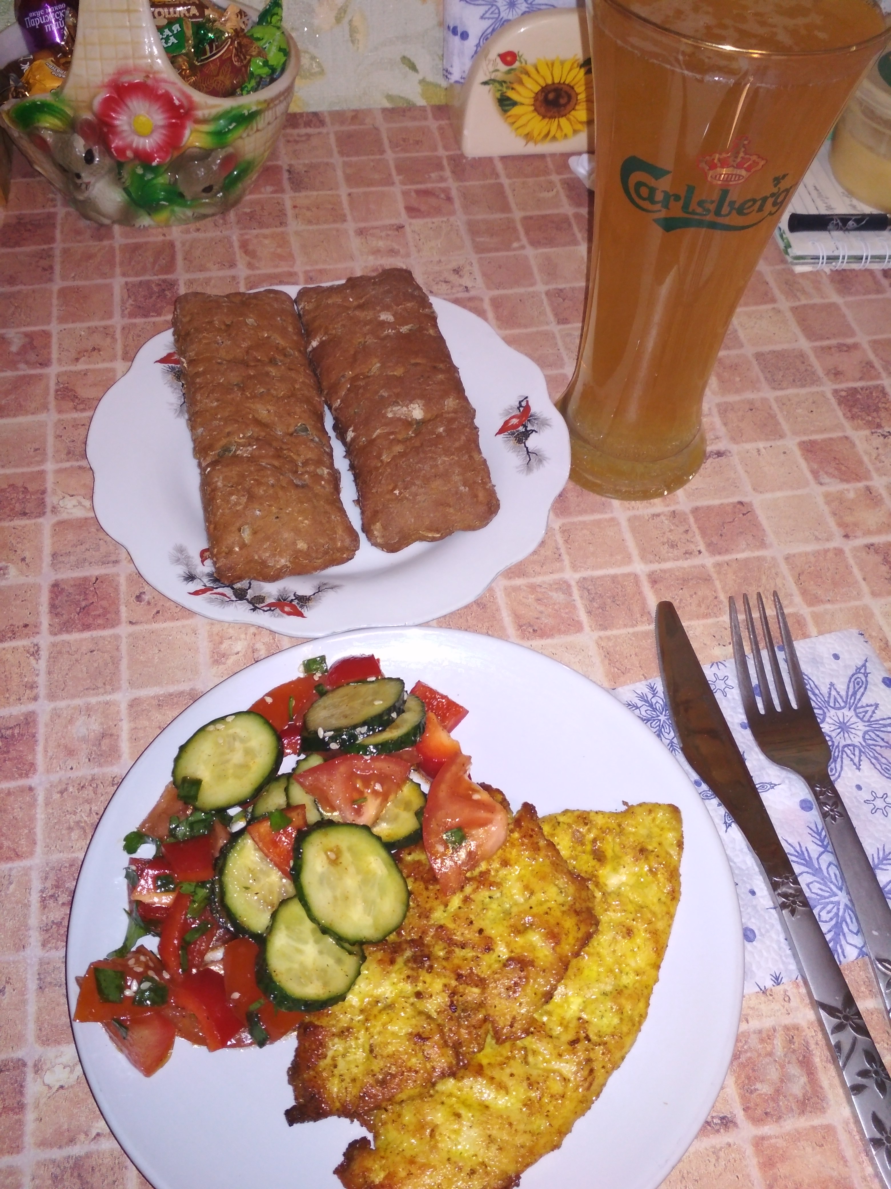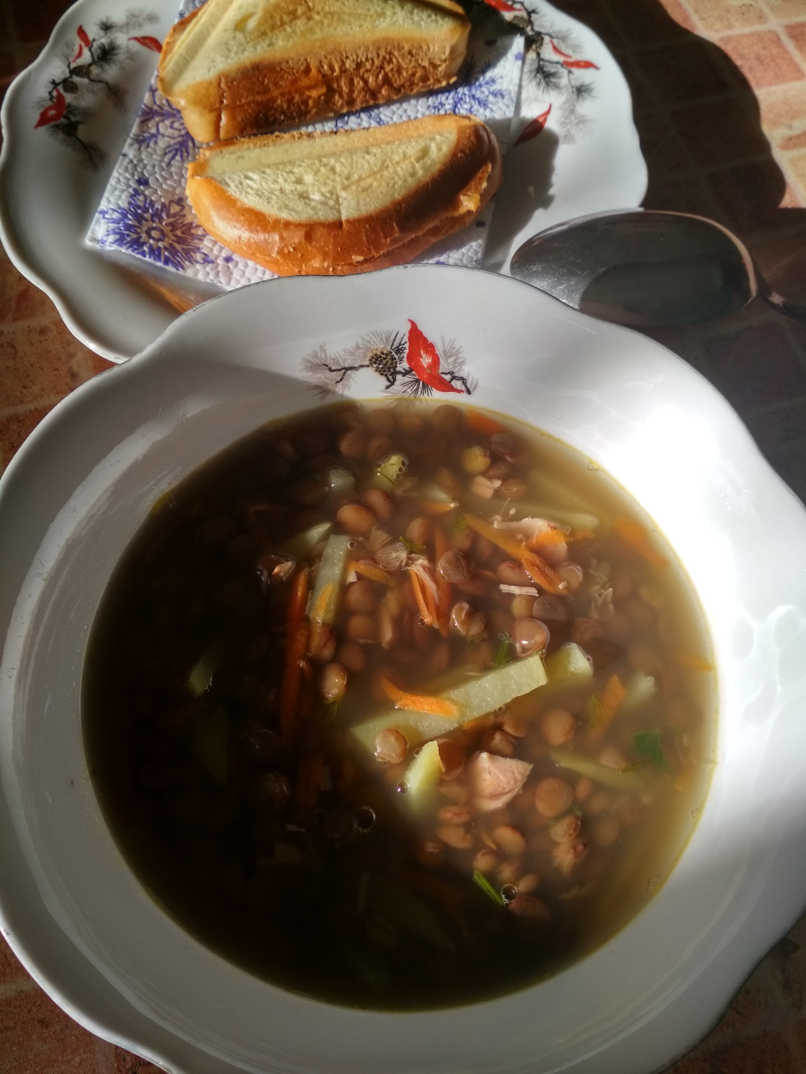 На обед чечевичный супчик с копченостями. Хлеб с начинкой (творог+сыр тертый+зелень+2 зубчика чеснока+соль+перец) На ужин рис и стейк из кеты)