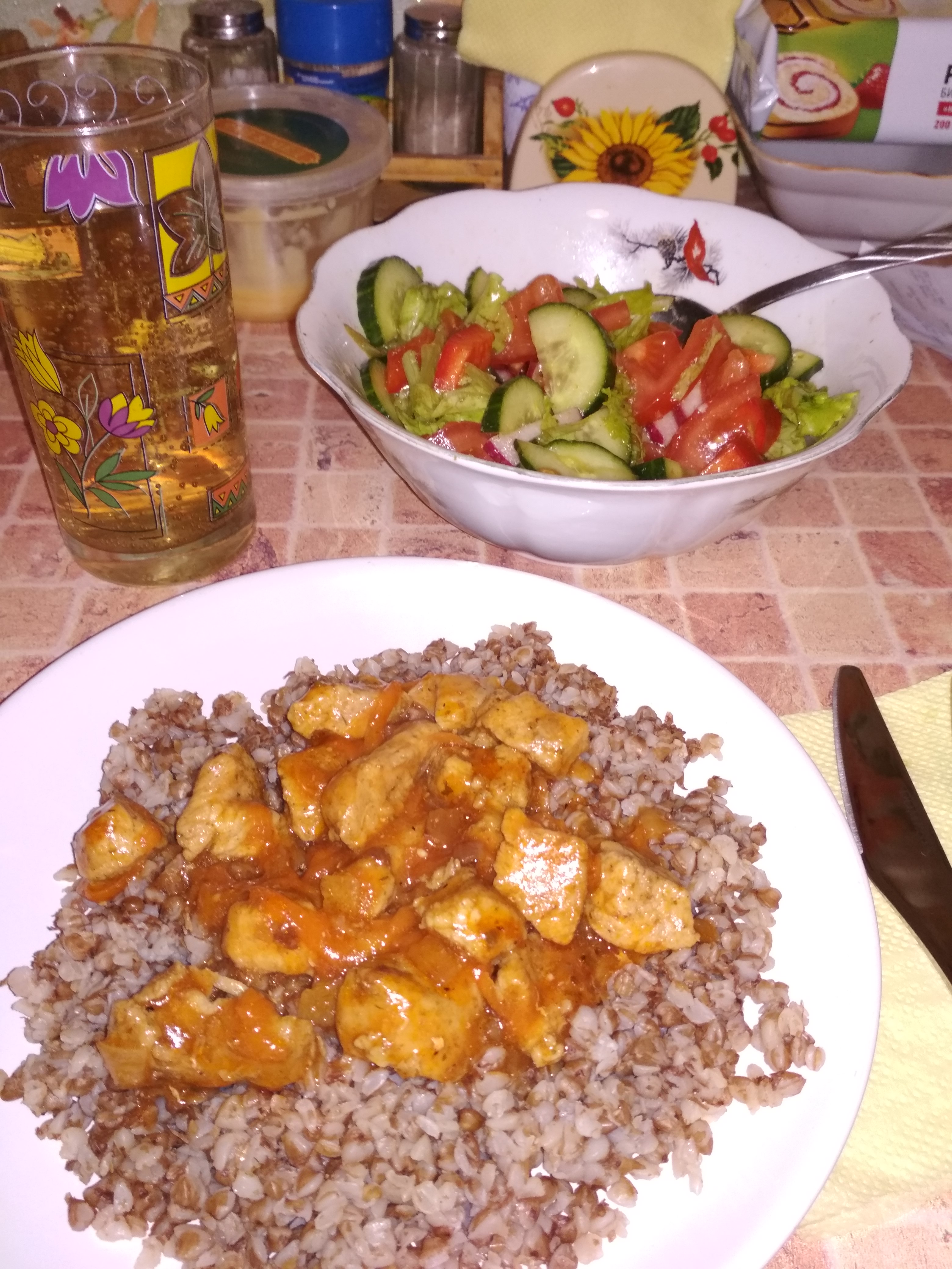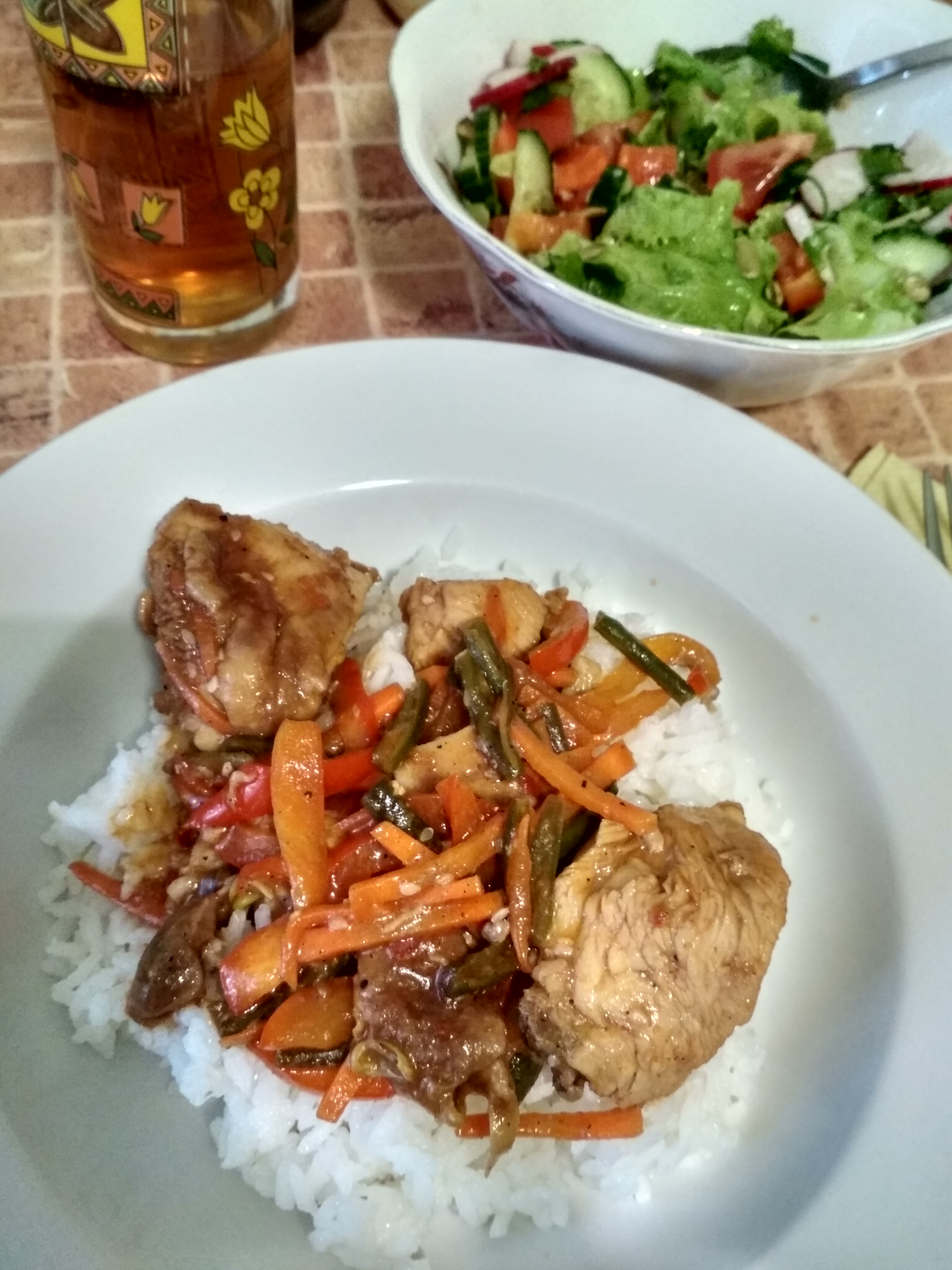 Обедоужин- курица по-китайски) за основу взяла это Овощи (морковь и болгарский перец) мелко порезать на полоски, обжарить на маленьком огне. Стручковую фасоль отварила, ее тоже мелко нарезала и добавила к другим овощам. Добавила чайную ложку томатной пасты, чуть помолилась и приправила. Курицу томила в мультиварке на режиме выпечка. Когда курица была готова, добавила овощи, перемешала всё и ещё 5 минут потушила вместе. Добавила кунжут. В общем, реально вкусно Помолилась-то зачем? Ааааааа)))))))) Посолила там
