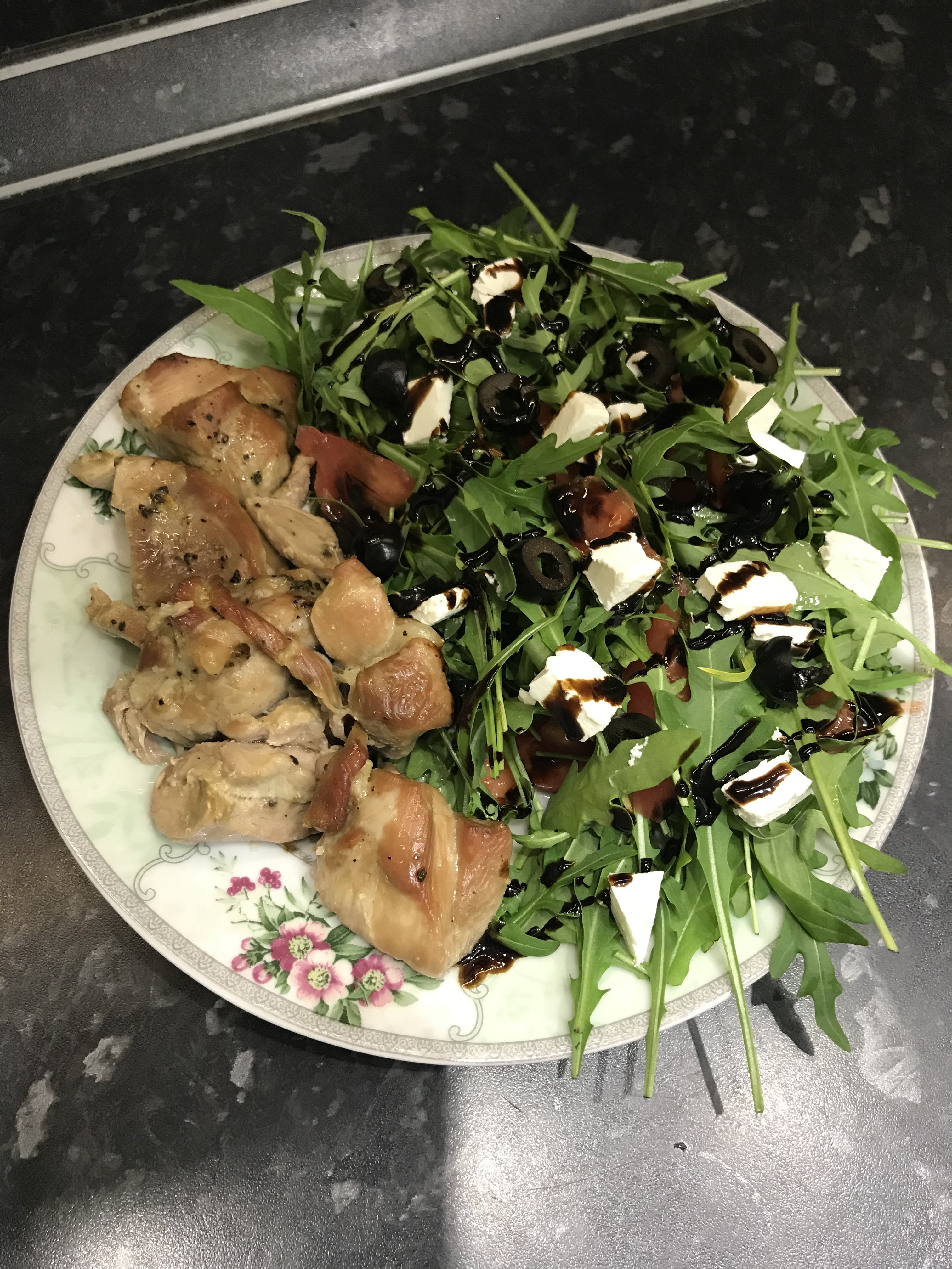 Тефтели мини (без риса) из индейки в томатном соусе. Салат: руколла, маслины, сербская брынза, семена чиа белые, семена белого льна. Белое нефильтрованное паулайнер. Еду на тарелке красиво не раскладывала, фото нет)
