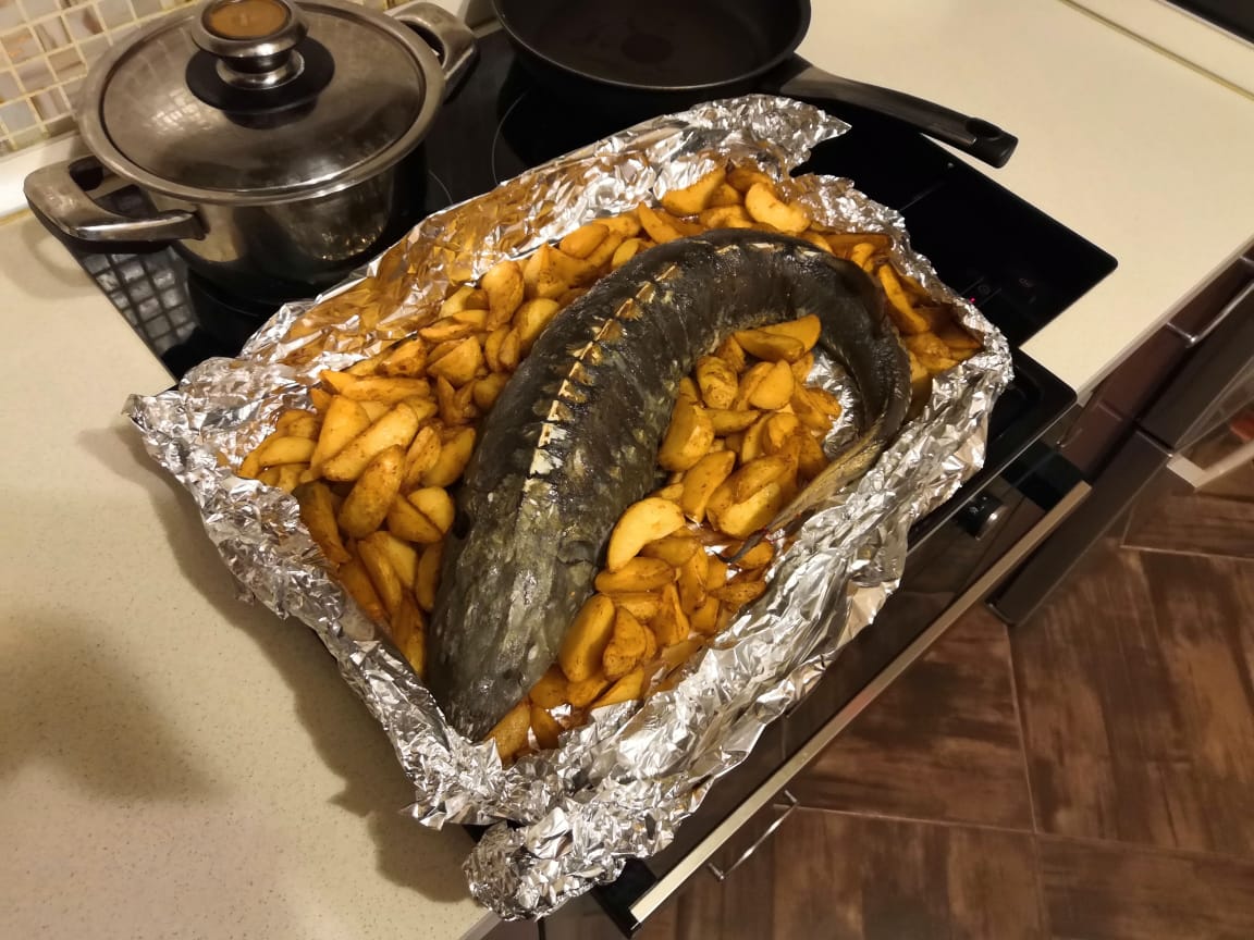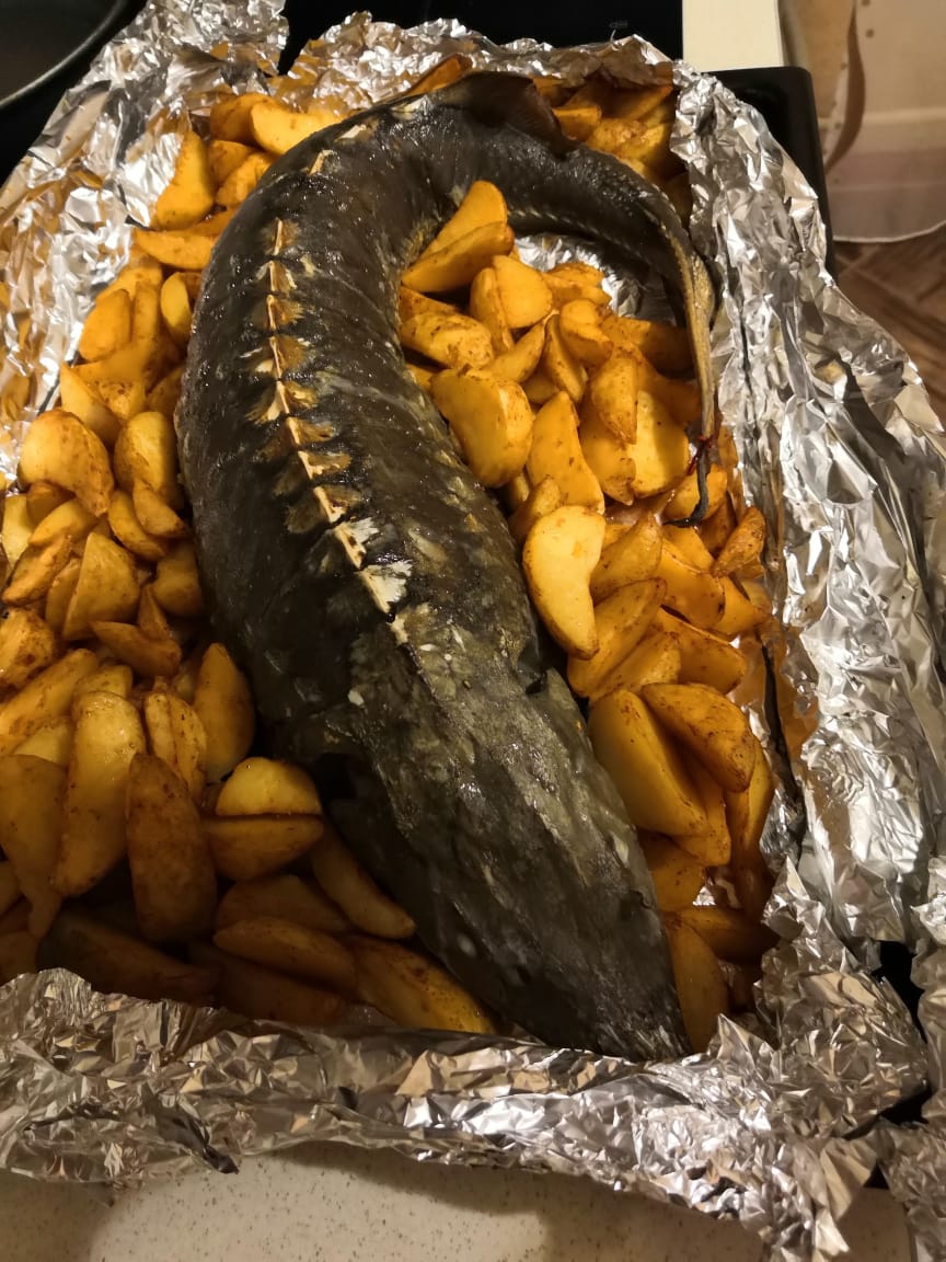 Сегодня ездили на рыбокомбинат, на ужин царская рыба-осетр. Маринад: лимонный сок+чеснок+перец+соль+раст.масло. Обмазала тушку снаружи и внутри. Брюхо фаршировала лимоном и луком. В духовку на 50 минут. И 10 минут на верхнем гриле.