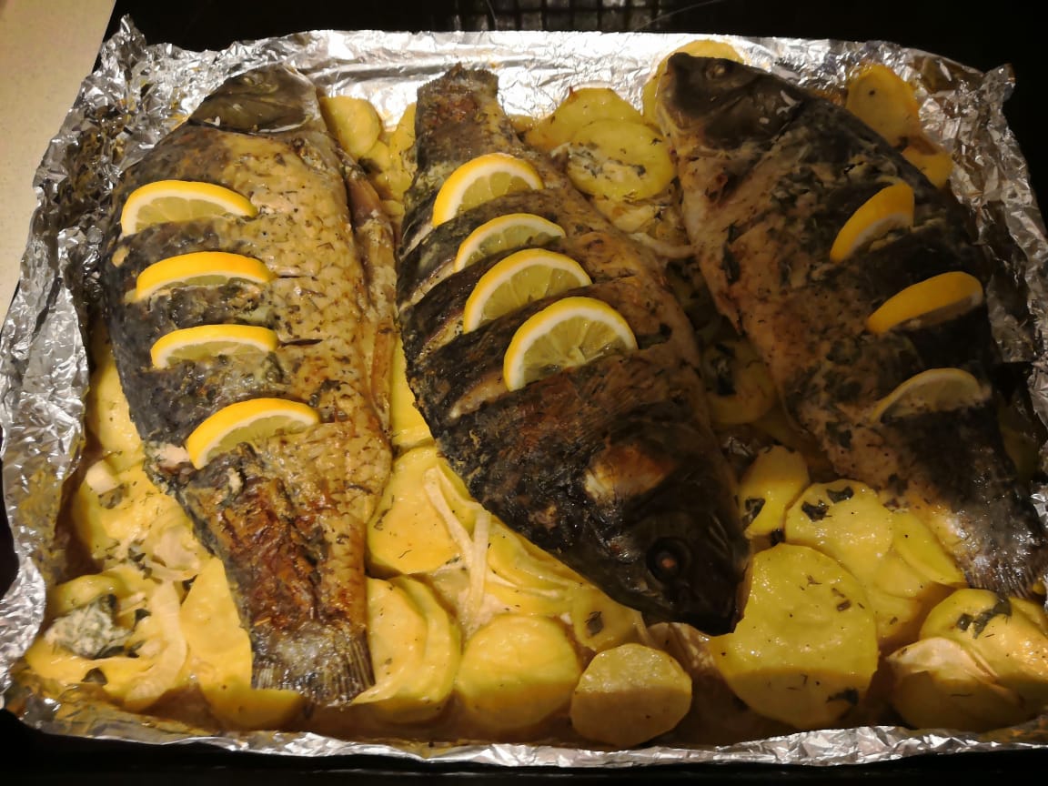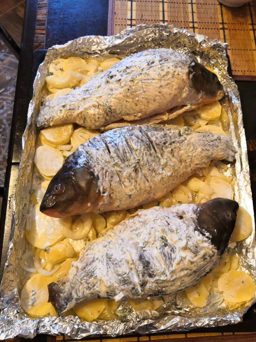 Что за рыбный марафон?))) У нас сегодня карп запечённый в сметане. Сначала рыбку потерла смесью из 1 ст ложки соли+1 ст.ложка сахара+приправа для рыбы+1 ст.ложка растительного масла. Две луковицы порезала на полукольца, рыбу нафаршировала луком. Дала постоять и промариноваться. Картофель порезала кружками. Сделала соус сметана+майонез в равных долях+зелень+соль+перец. На противень выкладываем картофель, обманываем кисточкой соусом. Выкладываем лук, который остался. Сверху укладываем рыбку. Готовилось минут 50. Костей дофига, но какой же он сладенький