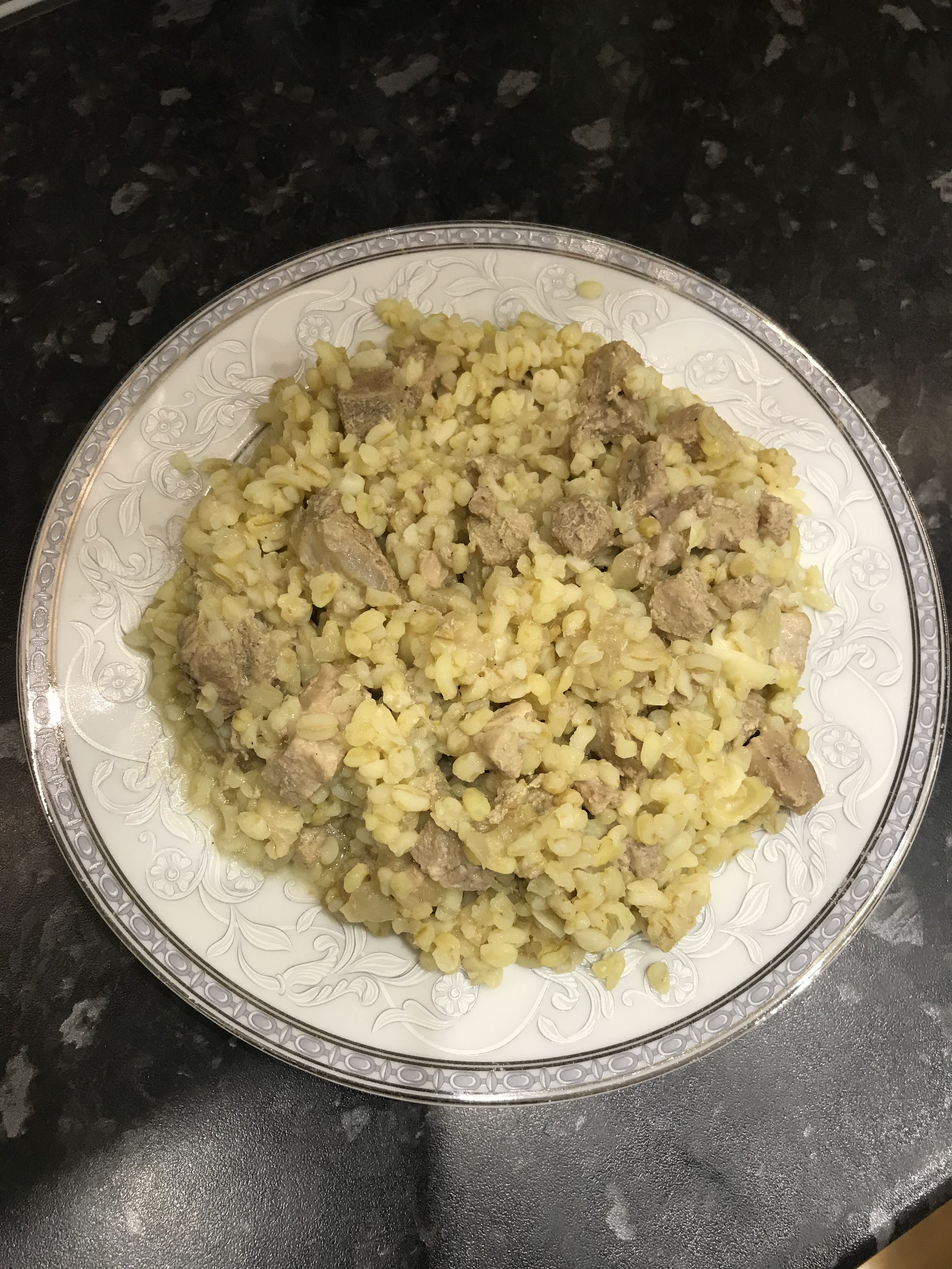 Булгур и свинина, готовилось отдельно. Салат: помидор, красный лук, маслины, сербская брынза, семена чиа, оливковое масло, соль.