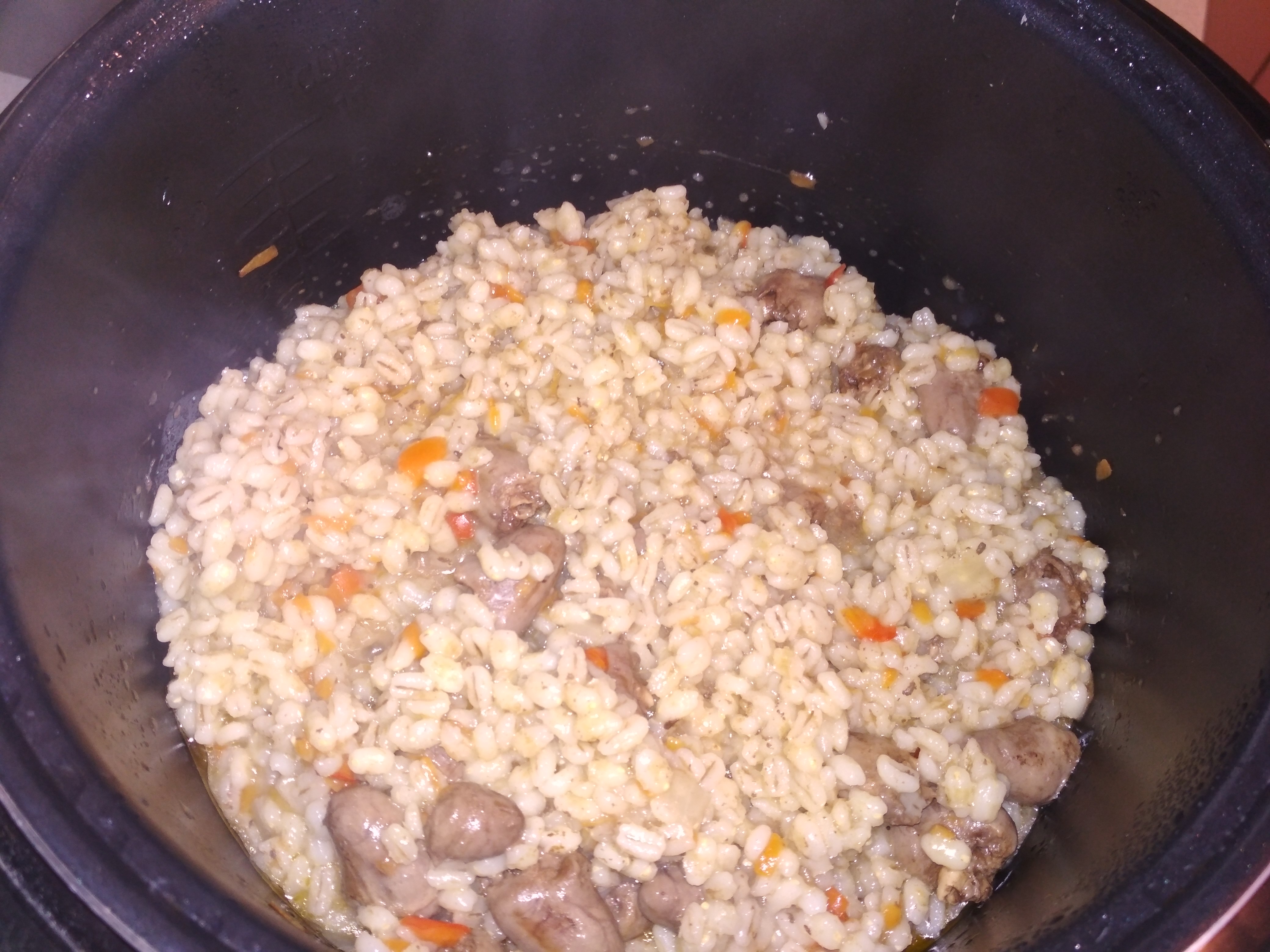 После того, как час замоченная постояла, промытую кидаешь в мультиварку к тому, что ты готовишь (сердечки, желудки, курица, мясо итд) Заливаешь водой, чтобы покрывало перловку на 1 см и ждёшь)))