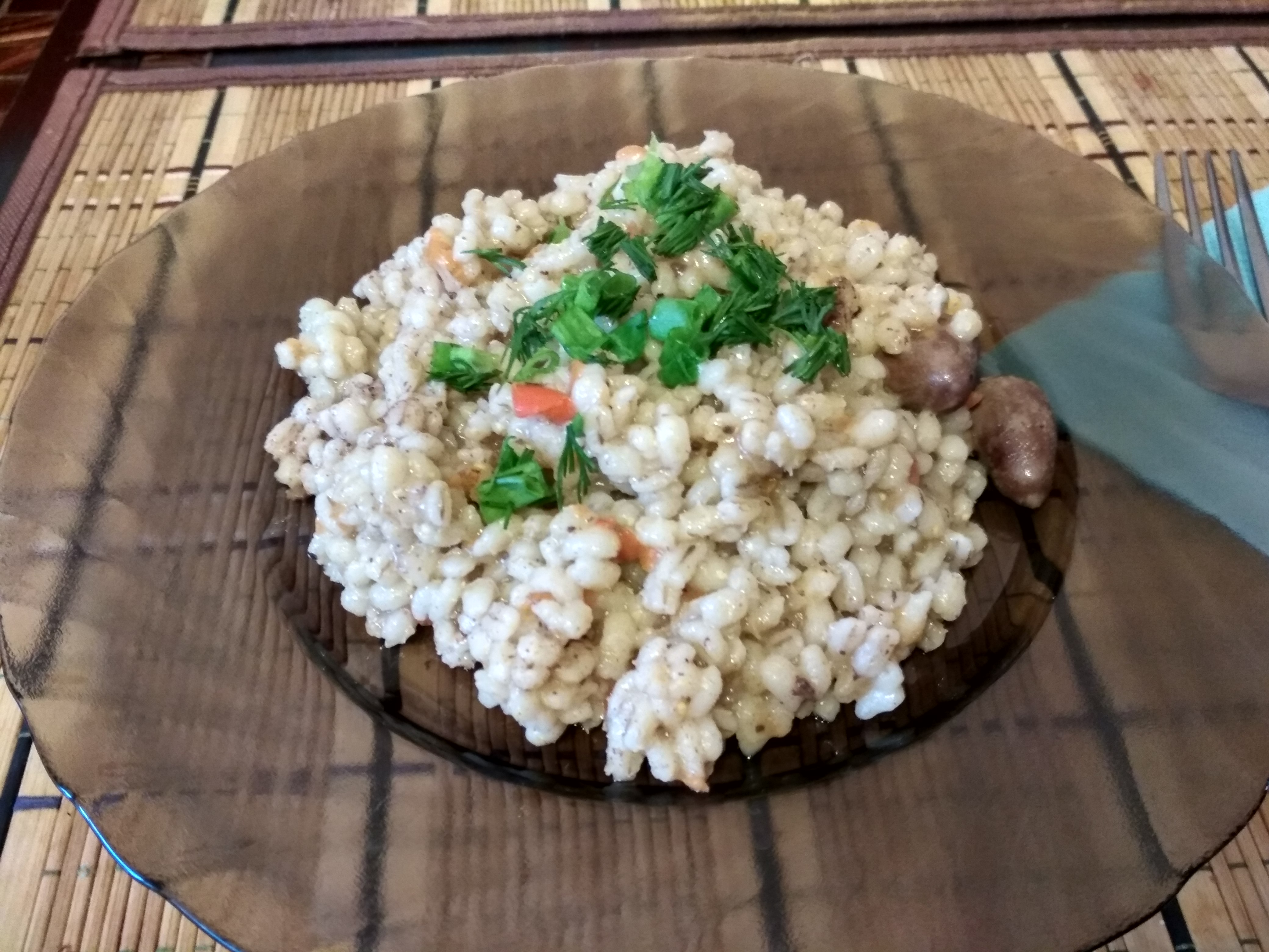 Приготовила бомбический салат, очень вкусный )) Ссылка на оригинал тут Я брала смесь из травы и использовала готовый соус для заправки, туда только пару зубчиков чеснока выдавила. Ещё зерна граната добавила. На второе сердечки потушила с перловкой. Хотела с рисом, но риса мало )) перловку замочила на час примерно. Сердечки обжарила с луком, морковью и болгарским перцем. Готовила в мультиварке на режиме Тушение говядина. Время 1 час 40 минут показывало, но приготовилось всё за час. Ещё суп с фрикадельками в планах