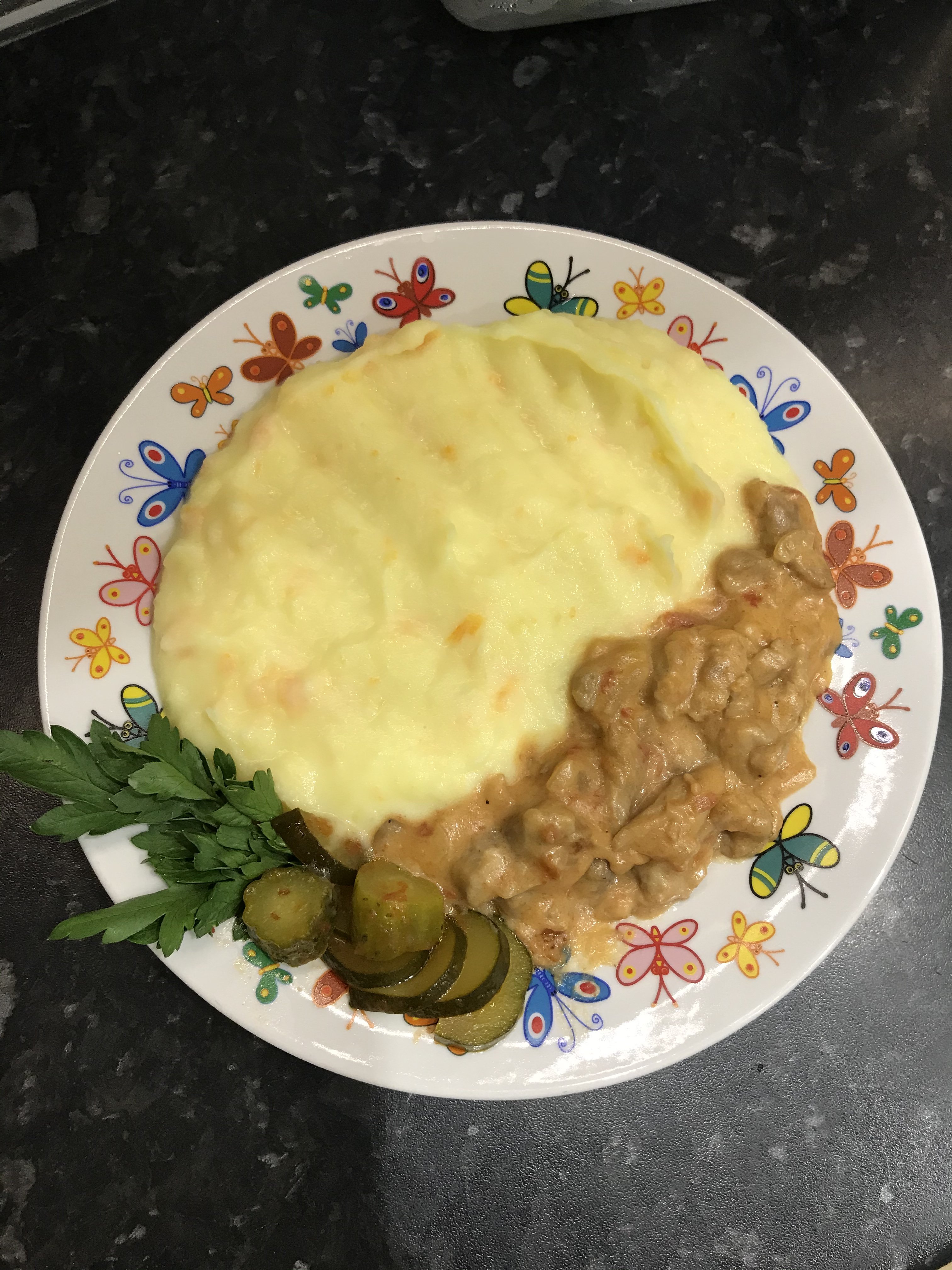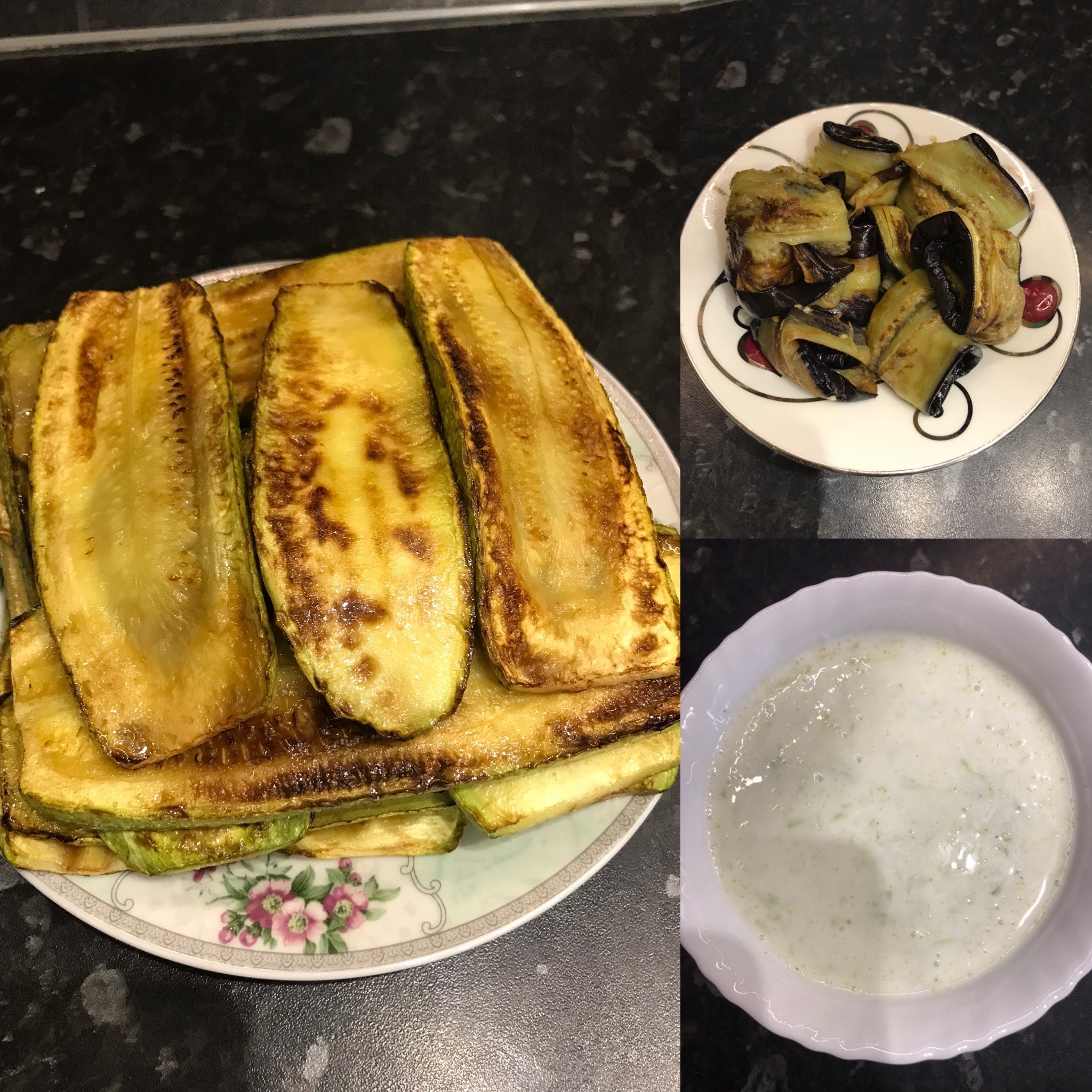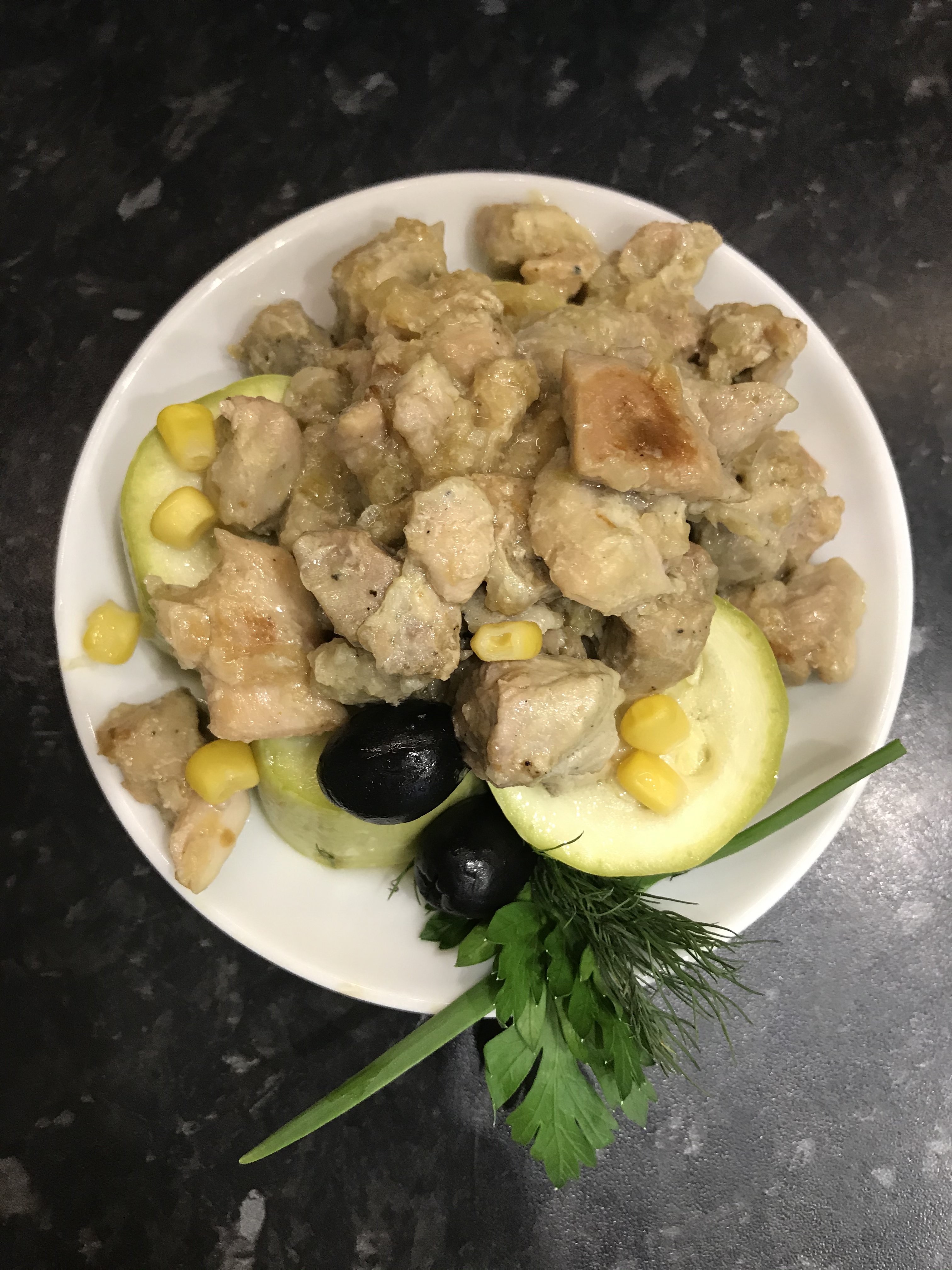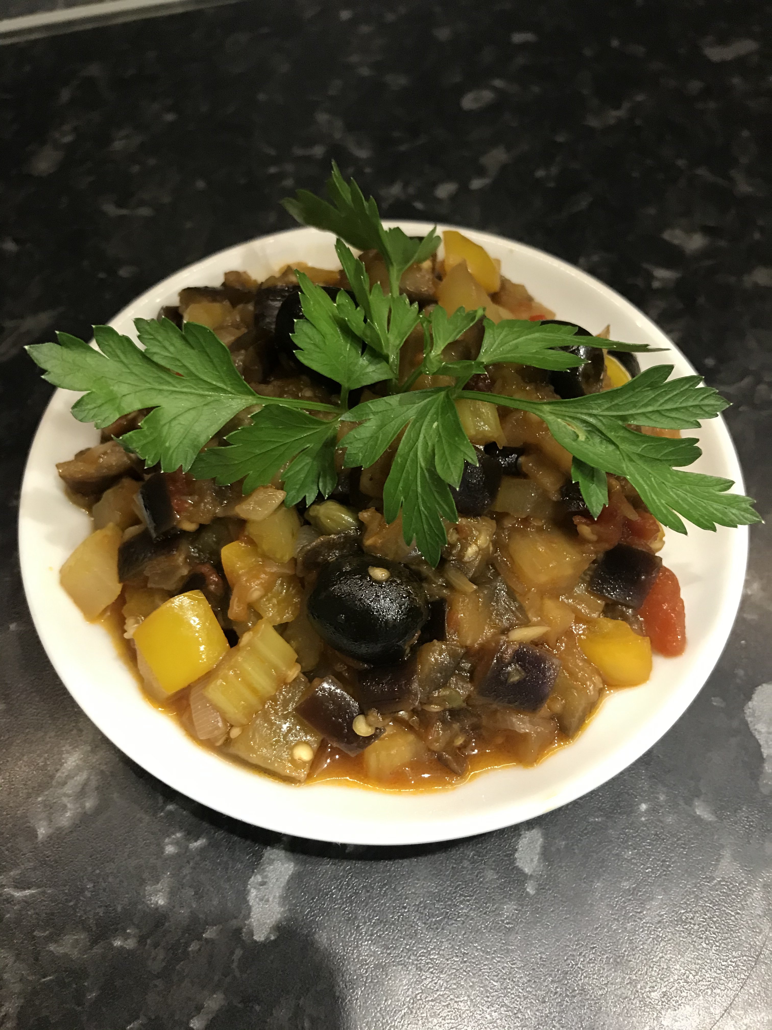 Капоната (на фото) и салат у мужа. У меня мясо бёдра индейки тушеное в мультиварке. У детей макароны.