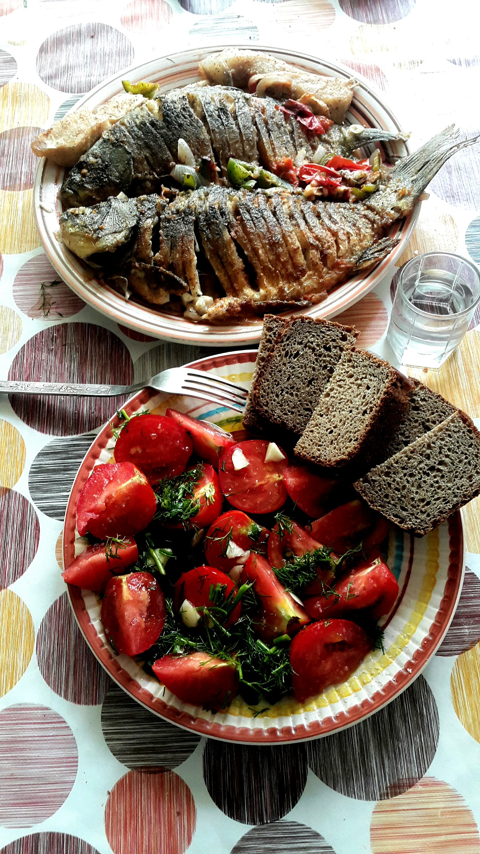 По простецки все ,на даче,по деревенски. Вот и помидоры местные пошли. Любим просто порезать и посыпать зеленью только что сорваной с грядки .Укропчик,чесночок,лучок и хорошенько полить горчичным маслом,посолить..Ну и карасики до хрустящей корочки Хлеба темного. К чаю оладьи на деревенском молоке и с домашними сливками .Вообще вкуснее молочки которую берём тут у мужика ,ещё не ел. У него свое стадо коров. Молоко 90 р бутылка полторашка,творог 200 р 0,5 кг. Сливки 200 р 0,5 кг. В холодильнике превращаются в масло .По вкусу ничего общего с тем что продают в городе ,даже на рынке.