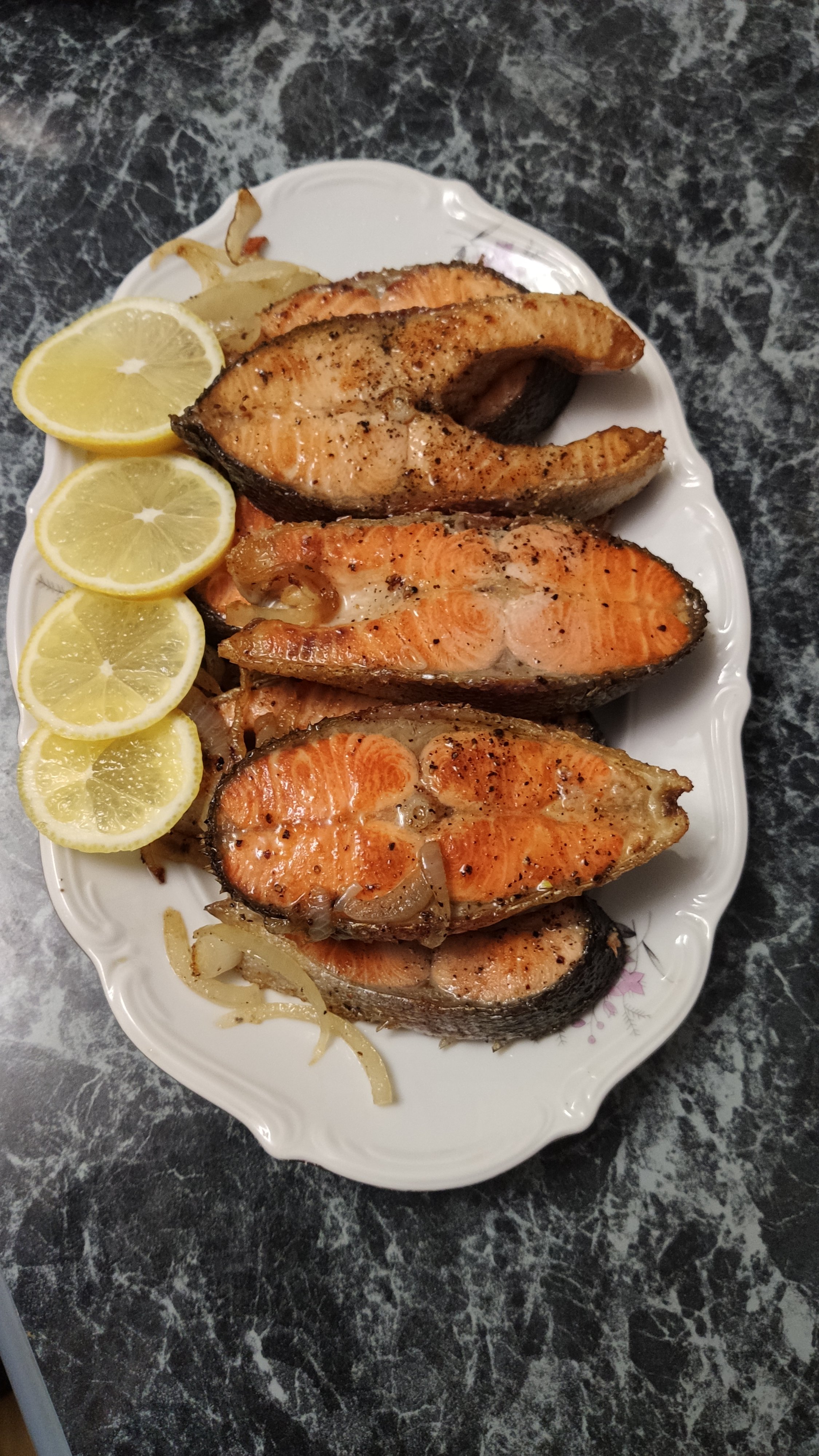 Не знаю как правильно блюдо называется. В общем просто пожарил рыбы.Без всего сразу на горячую сковороду. Солю и перчу черным перцем в последнее время,прямо на сковороде.Жарю по 3-4 минуты с каждой стороны .Лук по настроению за минуту две до окончания жарки