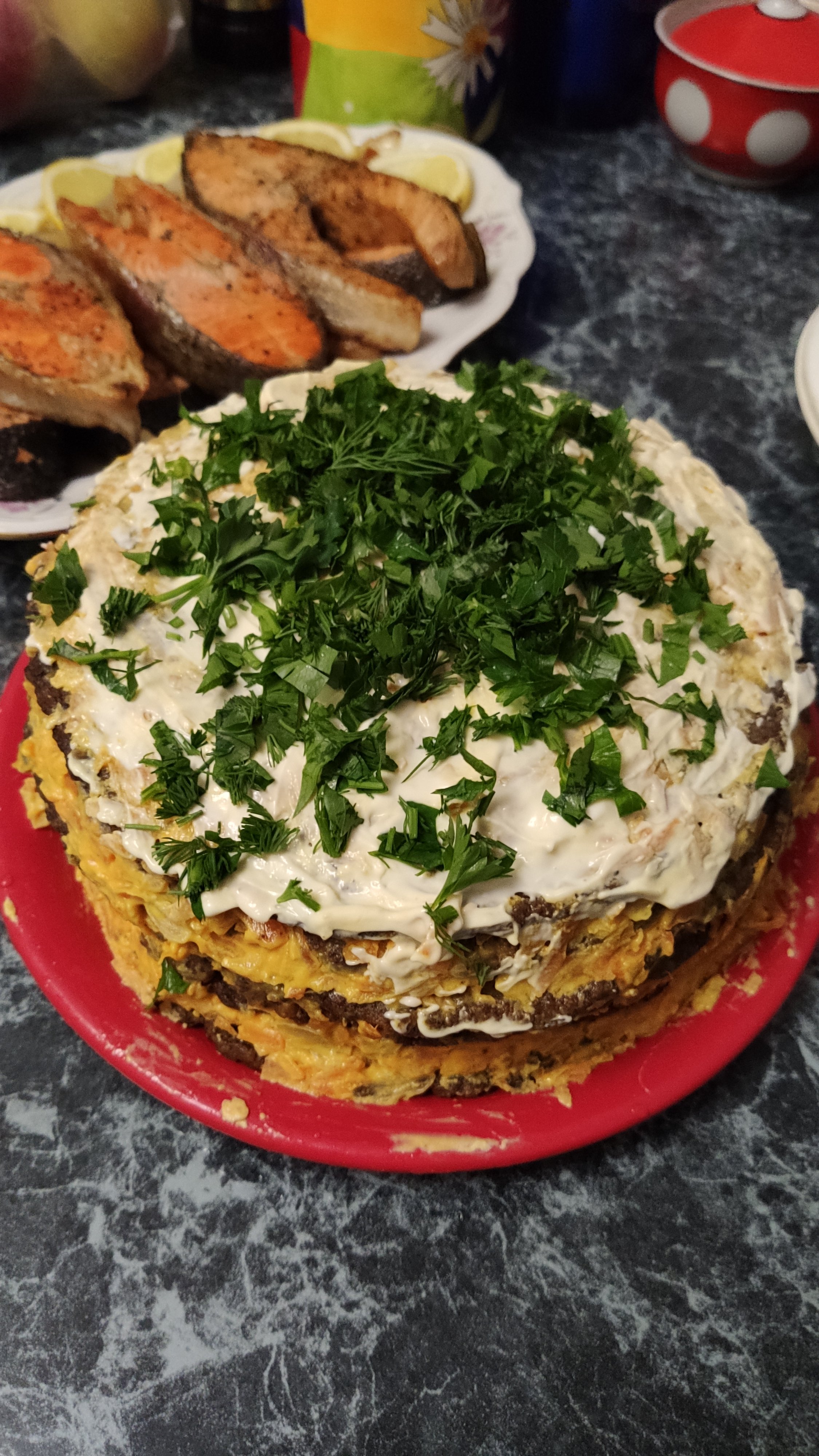 Сёмга вроде как на ярмарке называлась,а там кто ее знает. .750 р кг стейками нарезанная,но заморозка. Ну и торт уже готов .Печеночный .2 штуки .Один до вечера не дожил .Испробован до половины