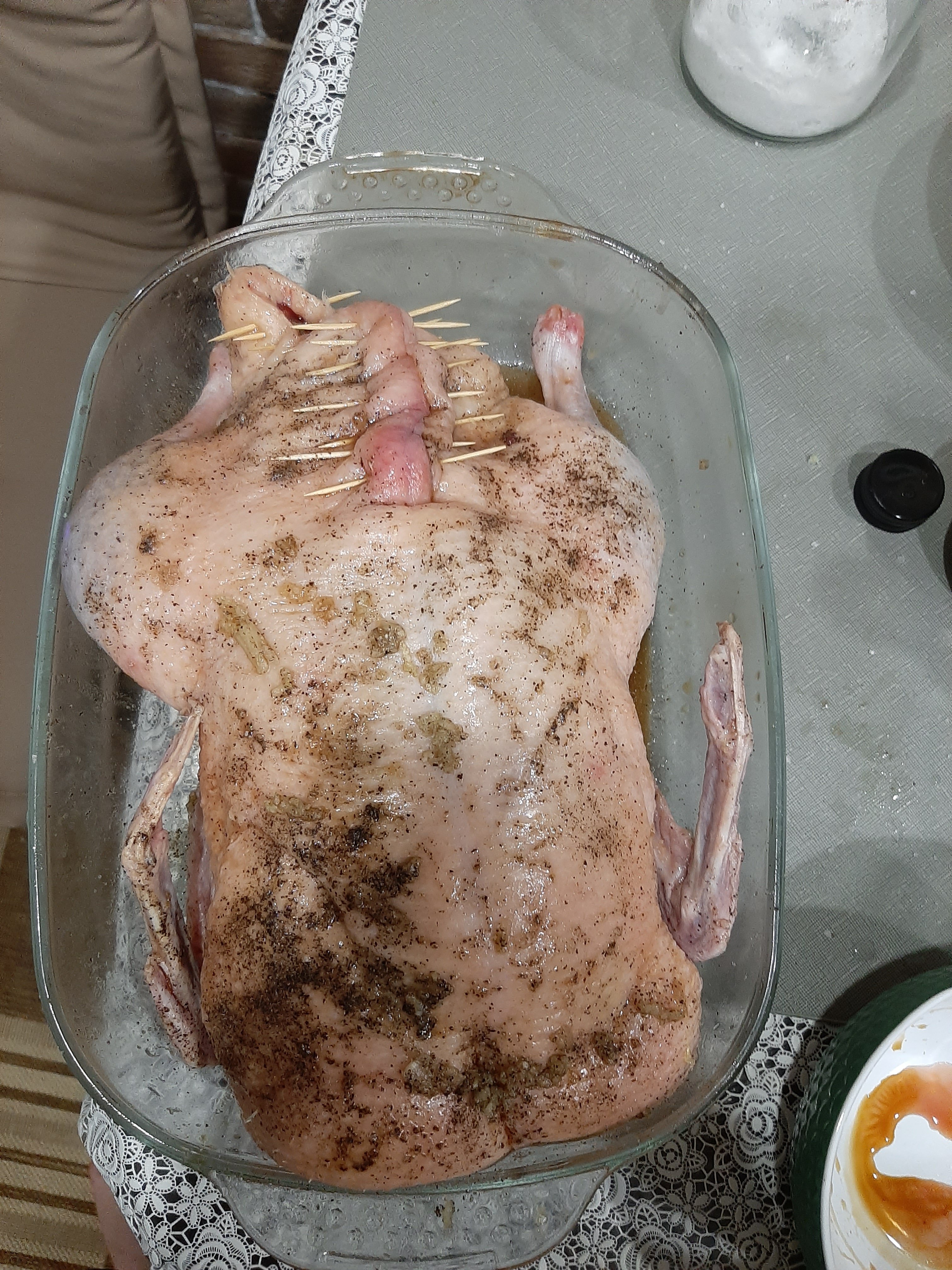 Утенок, инъектированный соевым соусом, натертый солью, перцем и чесноком. В заднице яблоко с медом. Сегодня пойдет в духовку.