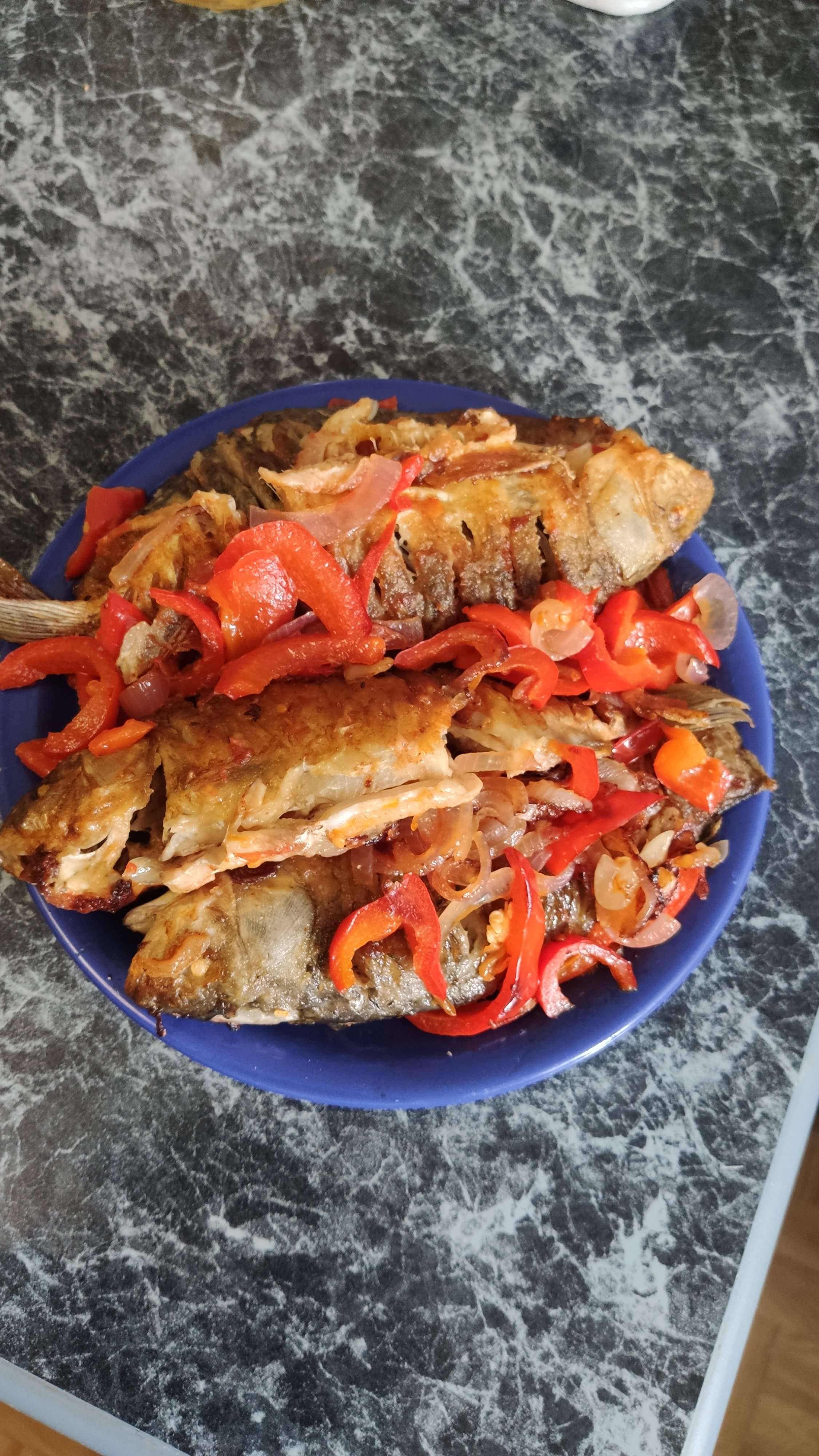 Ужин готов. Карасики на горчичном масле масле до хрустящей корочки, плюс свежие овощи из огорода, болгарский перец помидоры, лук. Сейчас все это в холодильник на пару часов чтобы весь сок застыл в рыбе. А пока можно за свежим пивом разливным и пожалуй пора за стол. Поехали ! Две остались. Все. Ничего не осталось.